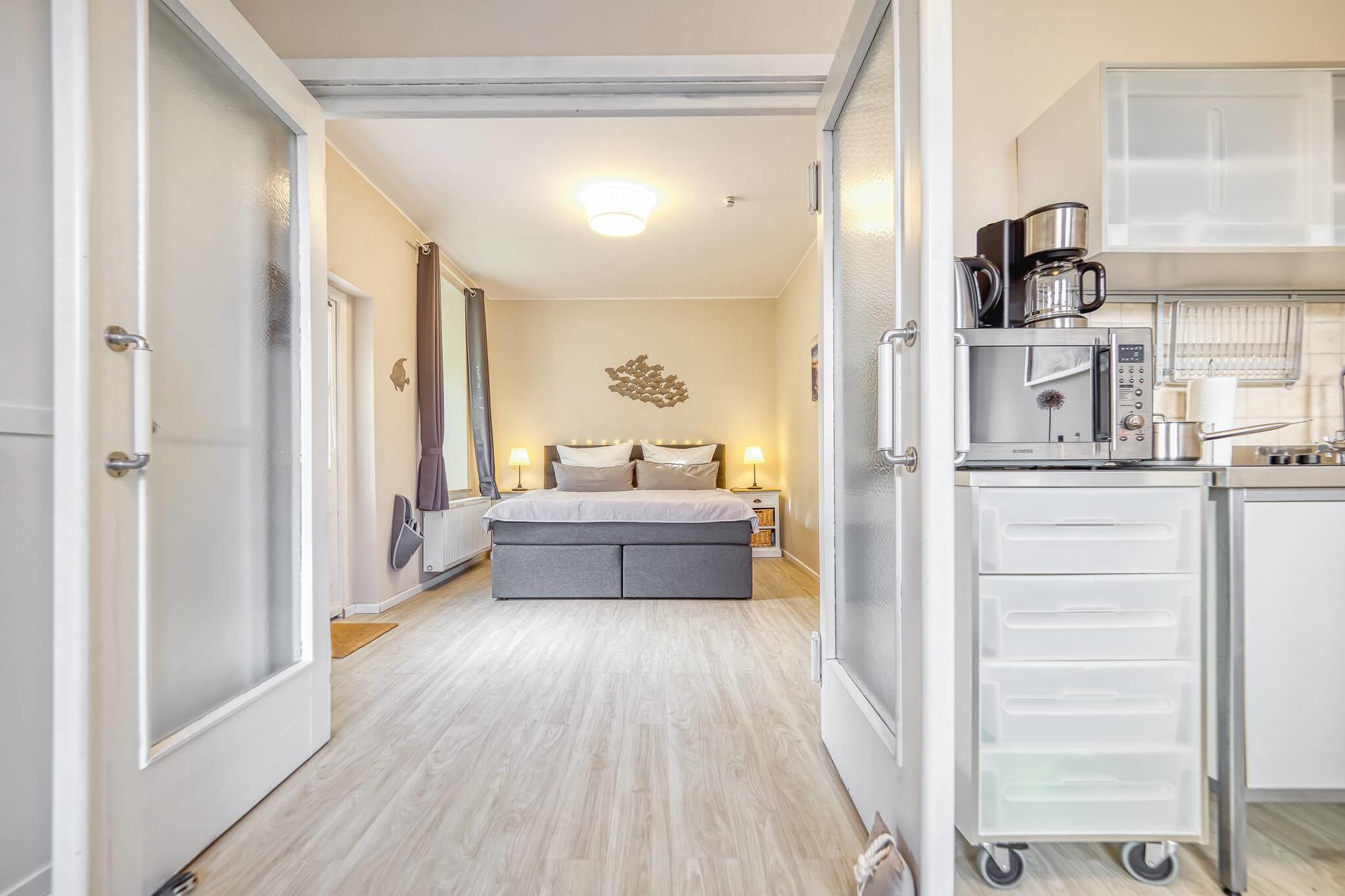 Die Ferienwohnung verfügt über ein gemütlichen, sonnigen Wohn- Schlaf- und Essraum, sowie einem Schlafzimmer mit einem Boxspringbett Größe 180 x 200 cm und ein Bad mit Dusche und WC.