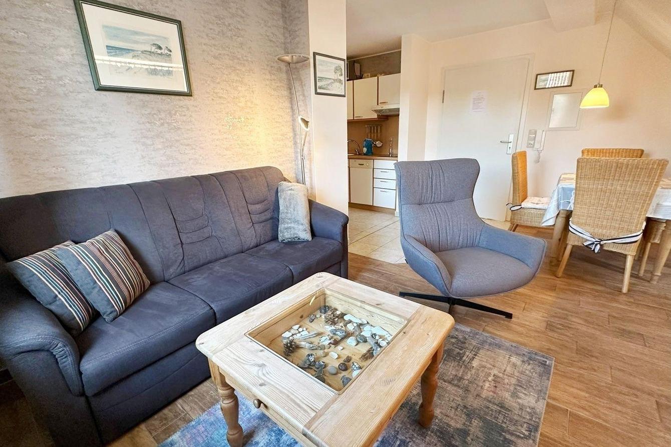Die vorhandene Küchenzeile ist mit Herd und Geschirrspüler voll ausgestattet. Ein Esstisch mit Platz für 4 Personen befindet sich ebenfalls im Wohnbereich. Das Bad ist mit ebenerdiger Dusche und WC ausgestattet. Haustiere sind nach Absprache willkommen. .
