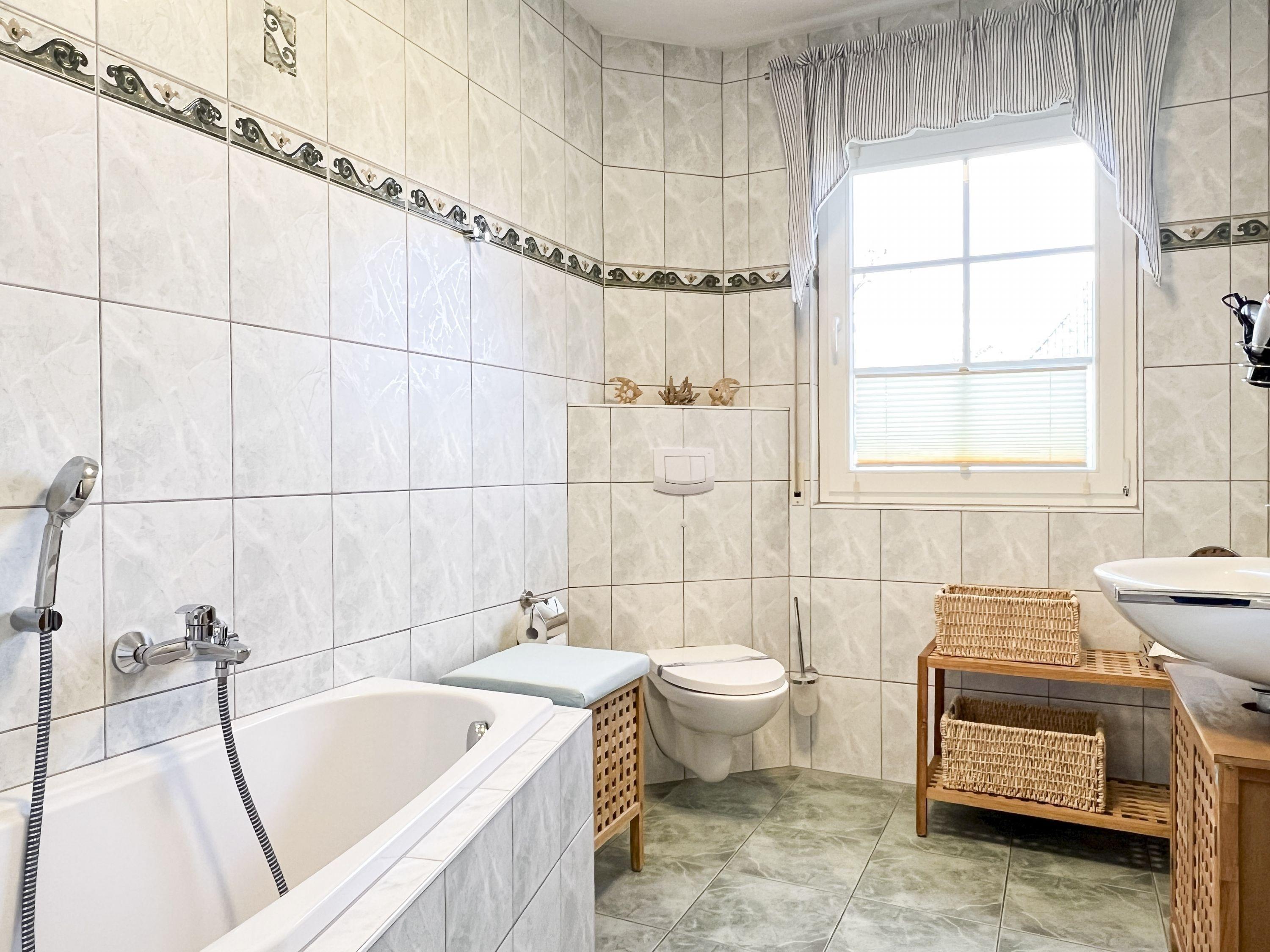 Zwei moderne Badezimmer – eines mit Badewanne/WC, eines mit Dusche/WC