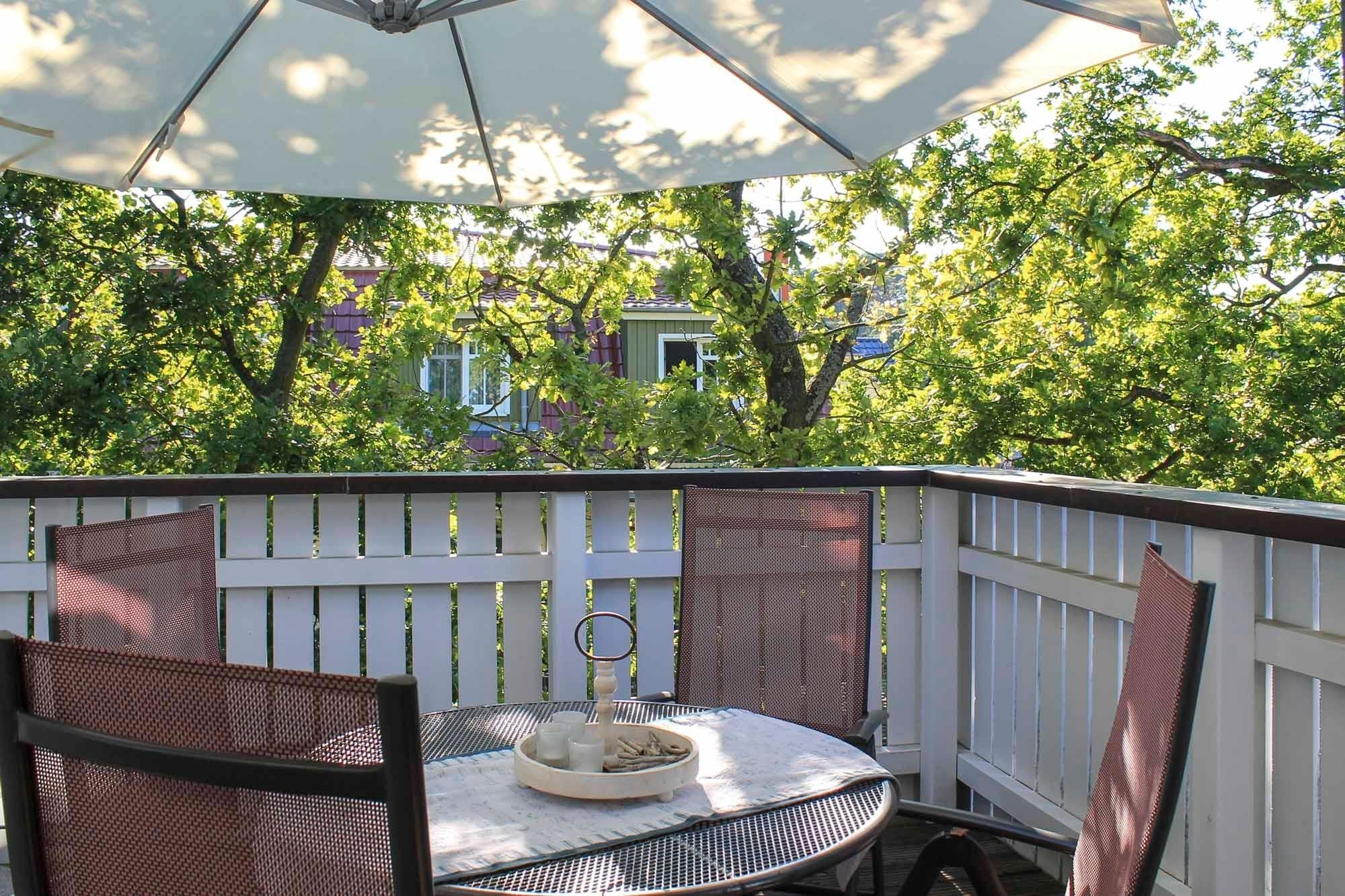 Eigener Balkon mit Gartenmöbeln und Sonnenschirm
