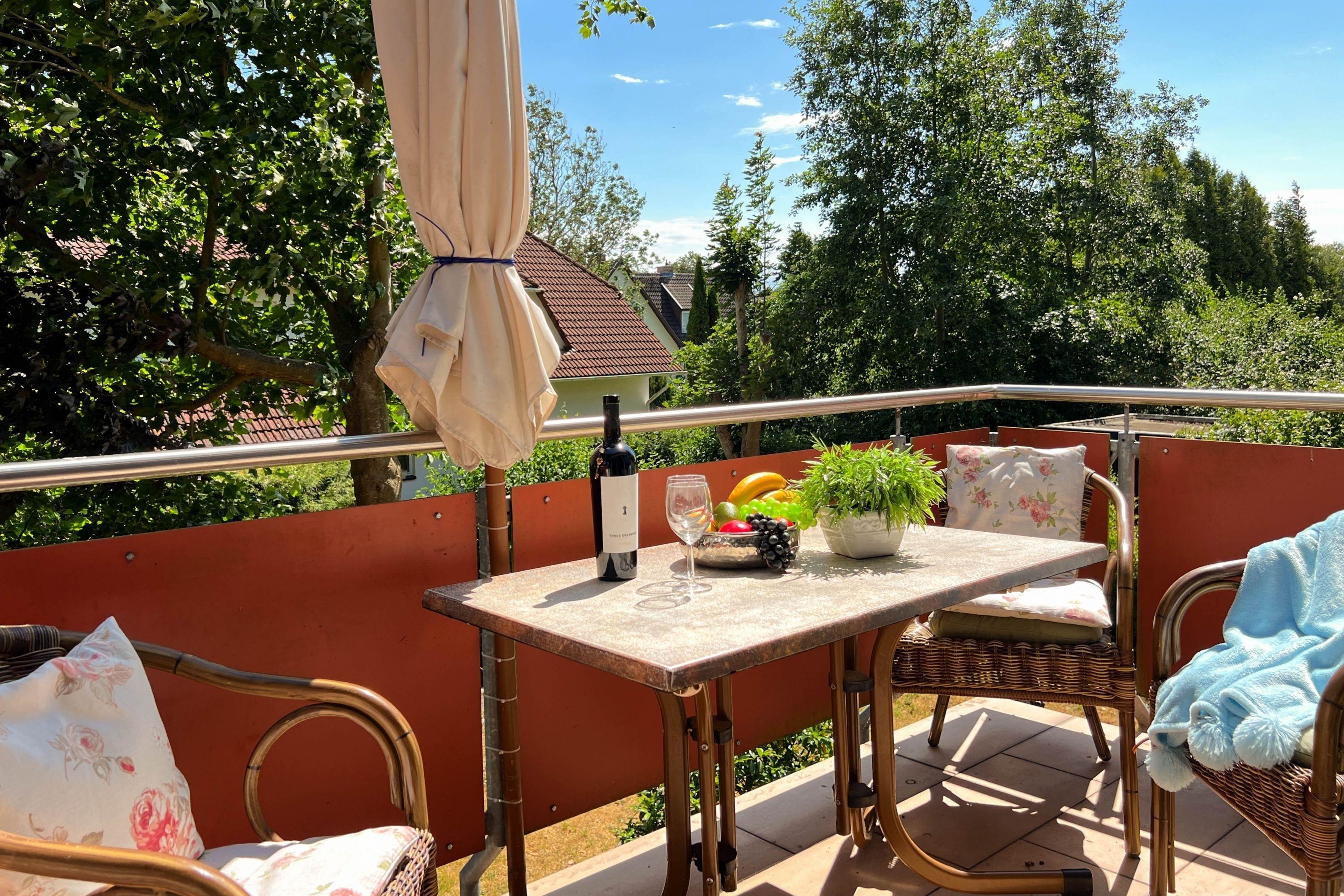 Außenbereich: Terrasse und Balkon mit Gartenmöbeln und Blick ins Grüne, ideal zum Entspannen.