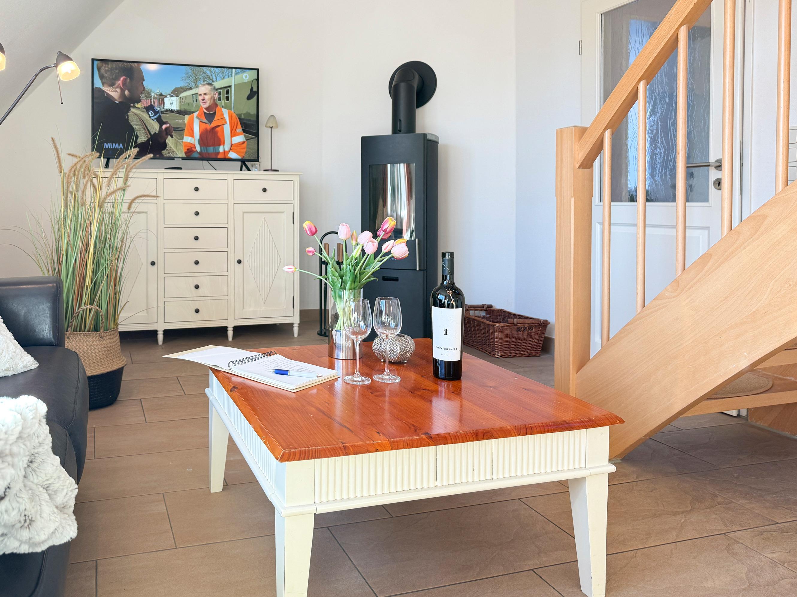 Wohnbereich: Gemütlicher Wohnraum mit Kamin, Sitzgruppe und Flachbild-TV für entspannte Stunden.