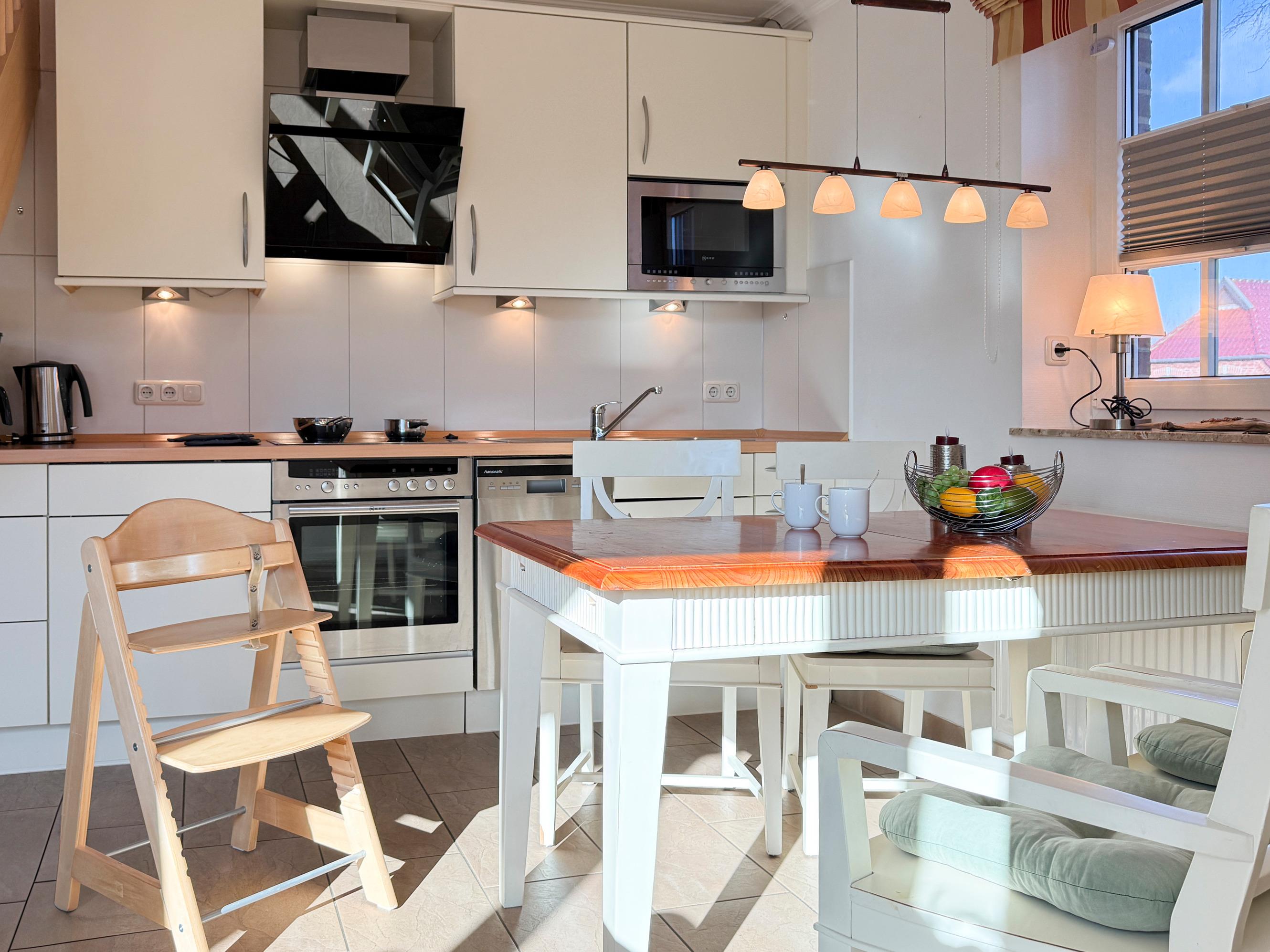 Küche und Essbereich: Voll ausgestattete Küchenzeile mit Backofen, Kochfeld, Geschirrspüler, Kühlschrank mit Gefriermöglichkeit, Filterkaffeemaschine, Toaster, Wasserkocher und Küchenmixer. Die angrenzende Essgruppe lädt zu geselligen Mahlzeiten ein.