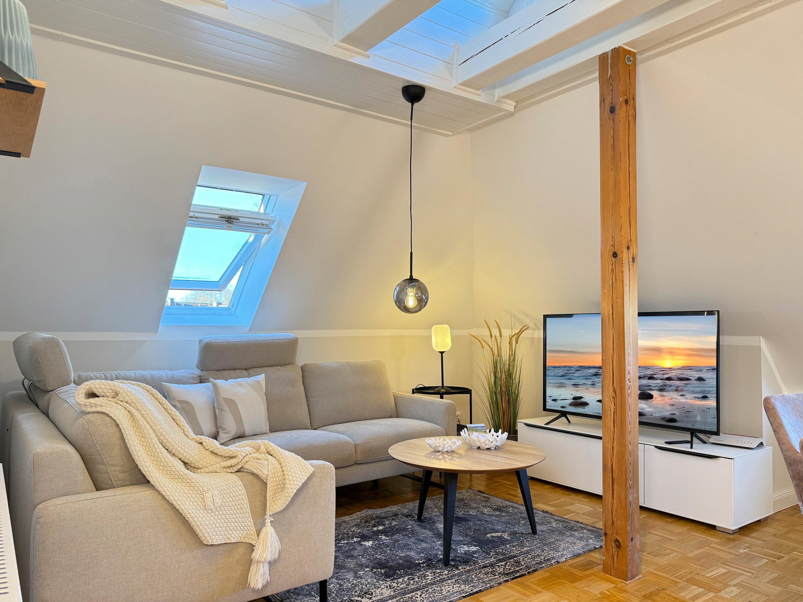 Wohnbereich: Heller Wohnraum mit bequemer Couch, Smart-TV und Sitzgruppe