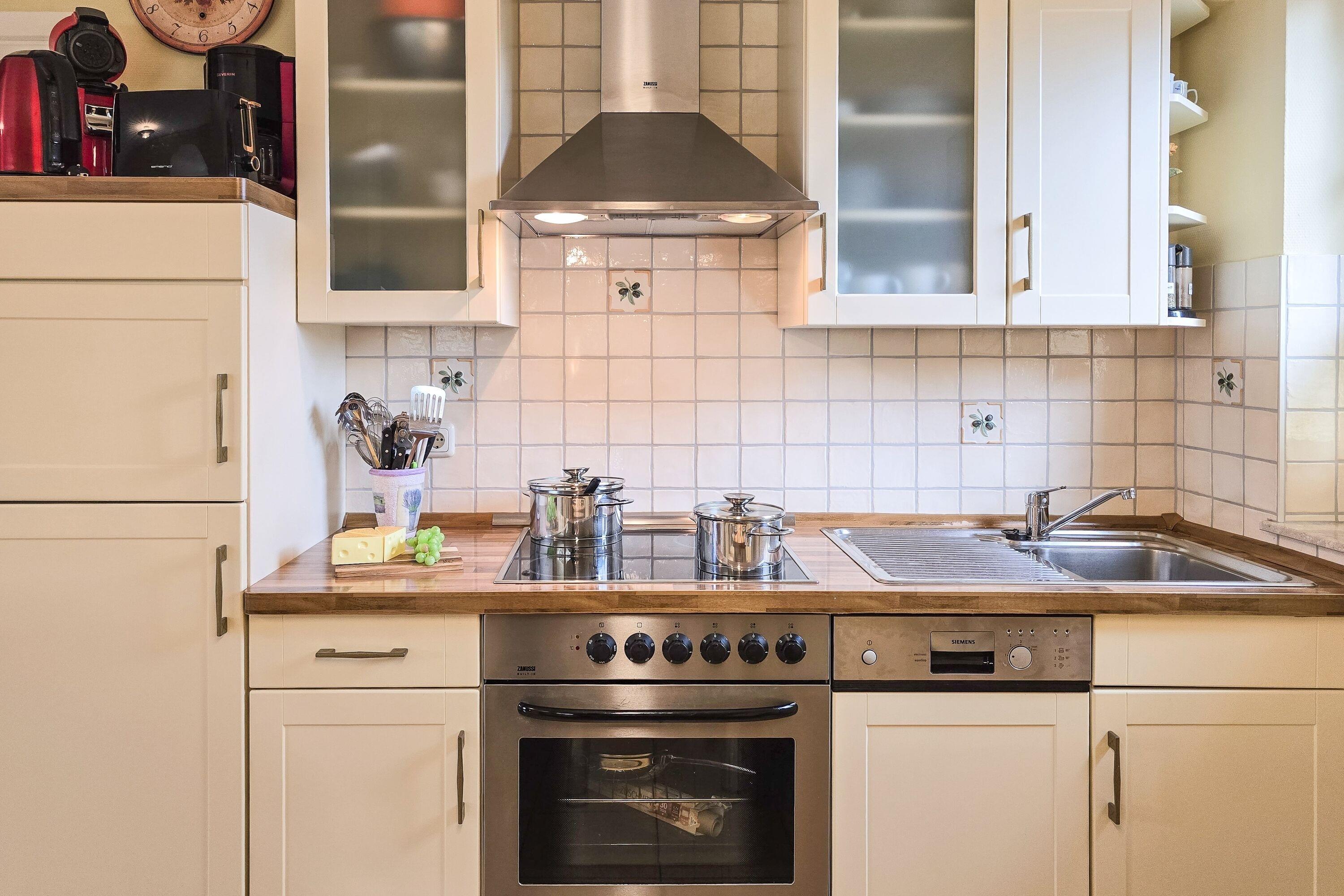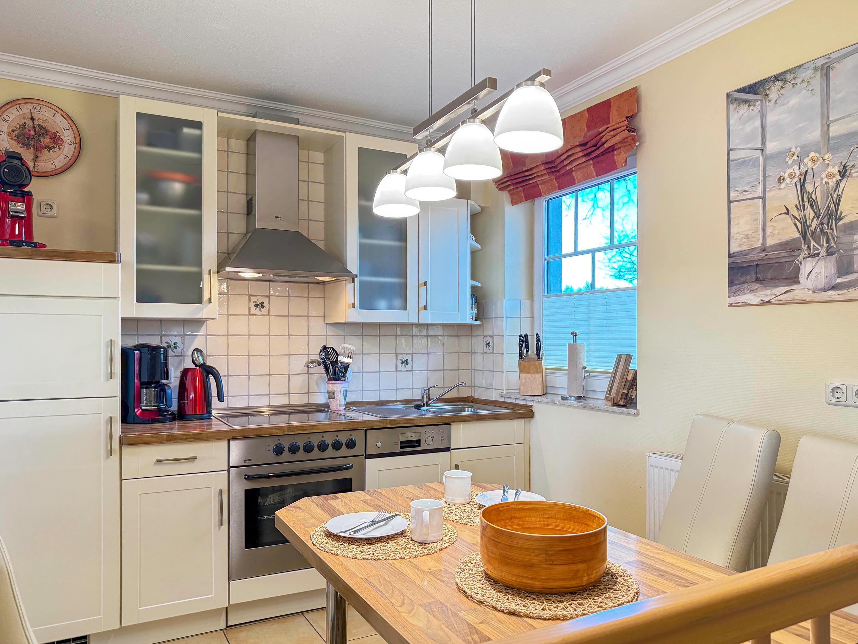 Küche: Voll ausgestattete Küchenzeile mit Spülmaschine, Backofen, Kochfeld, Kühlschrank, Filterkaffeemaschine und Pad-Kaffeemaschine