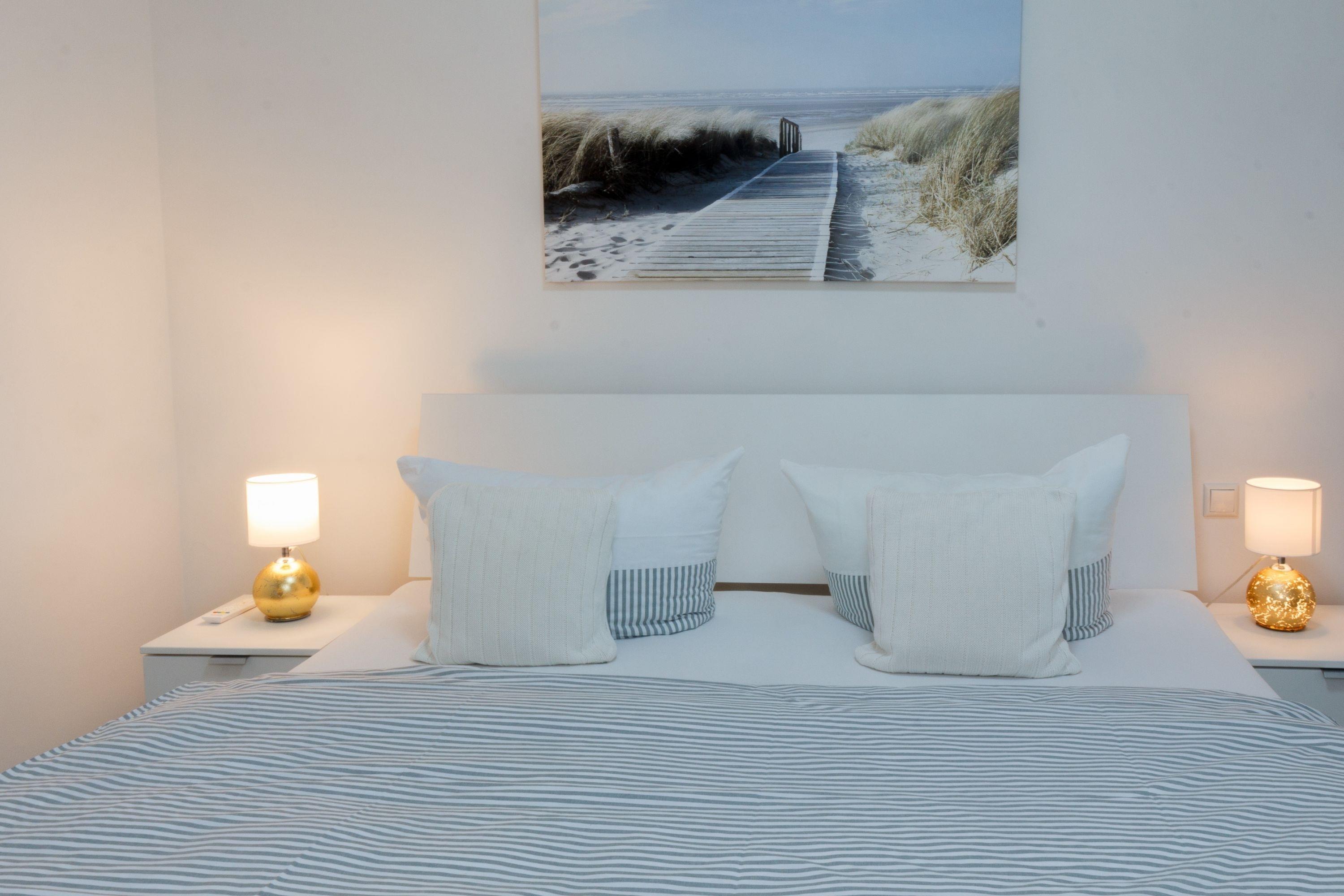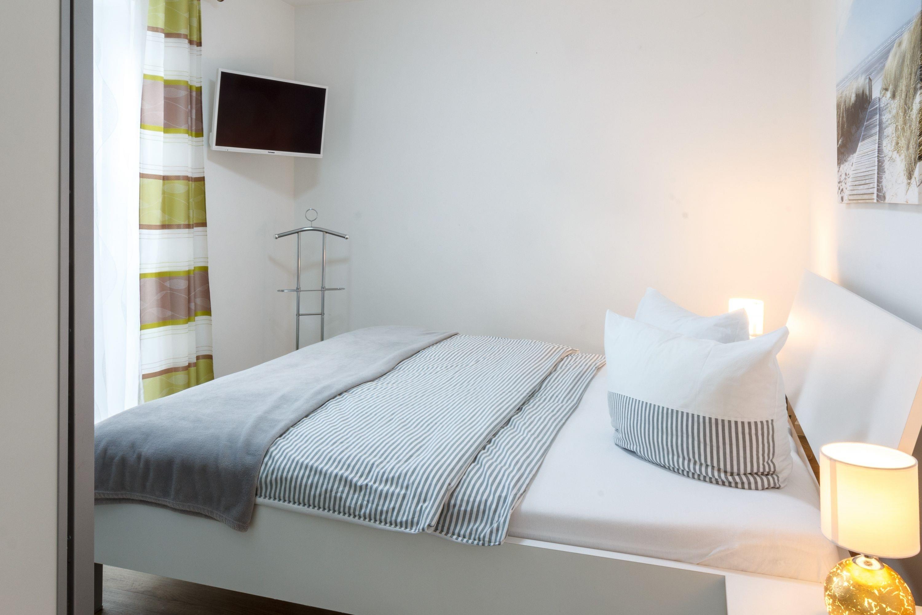 Schlafzimmer: Gemütliches Doppelbett (180 x 200 cm) mit zusätzlichem Flachbild-TV