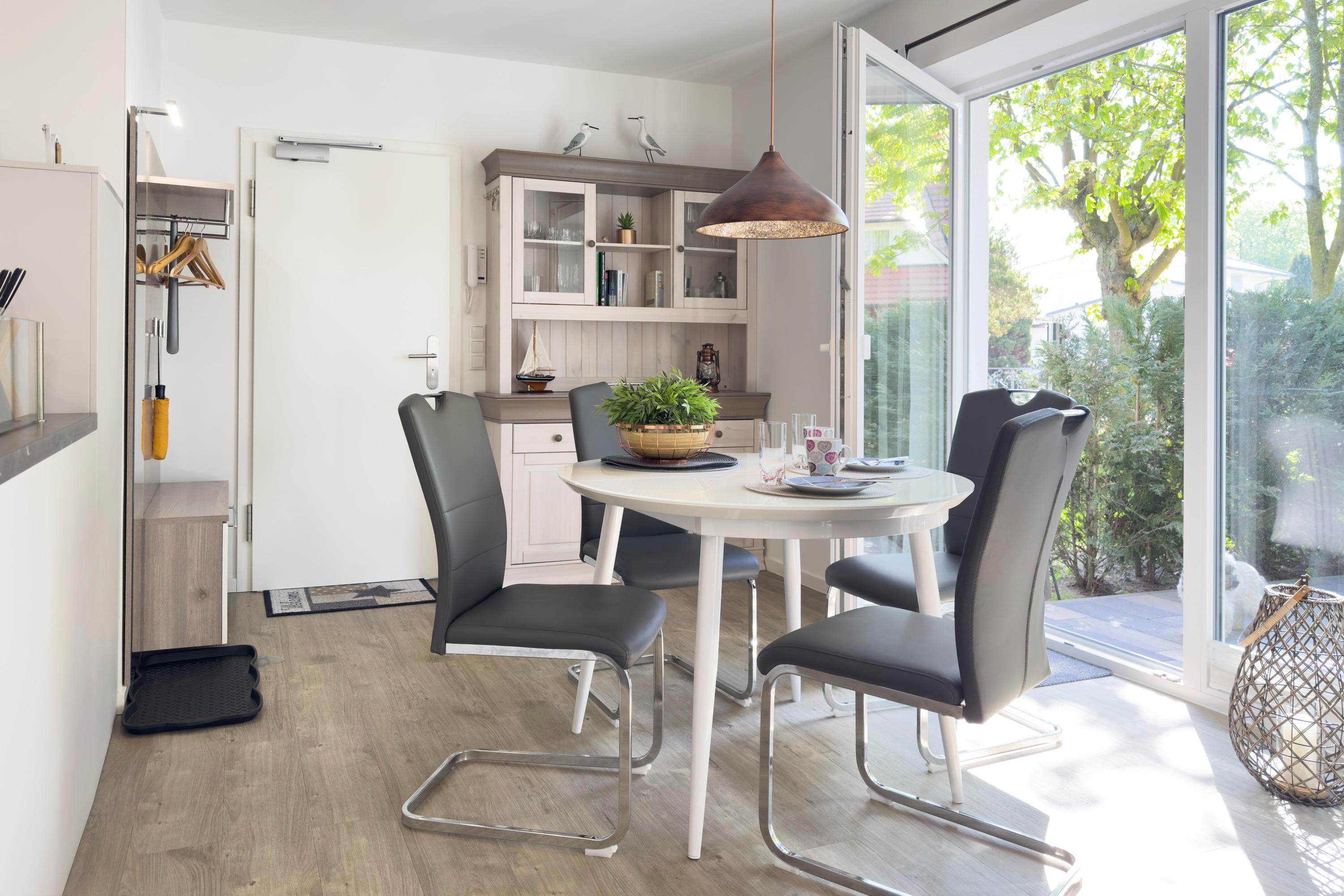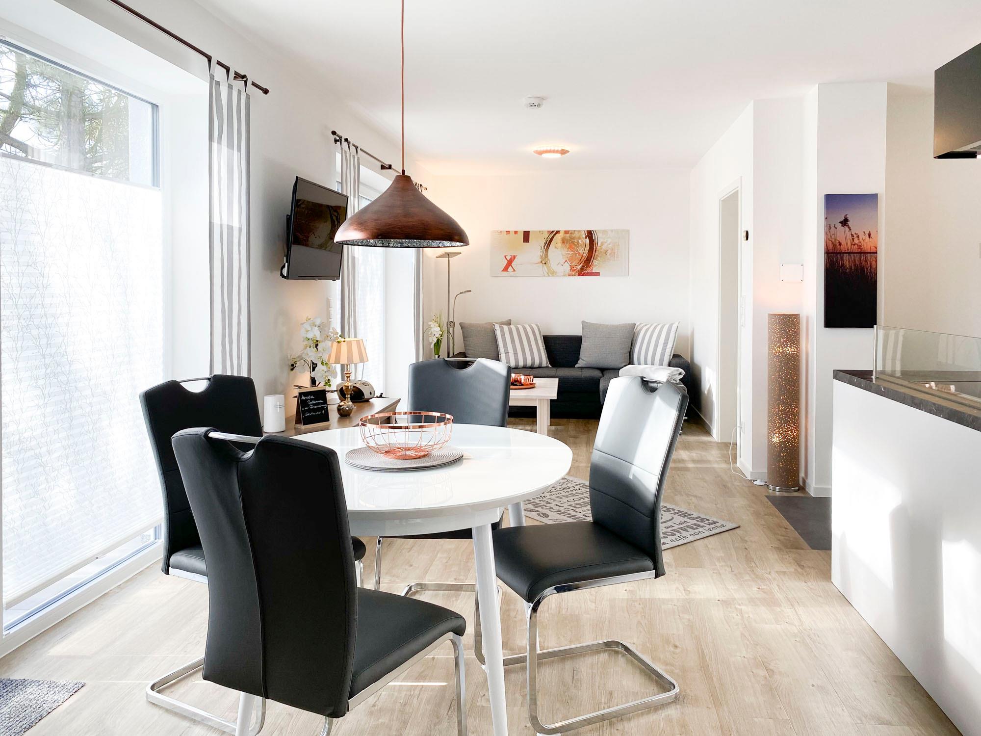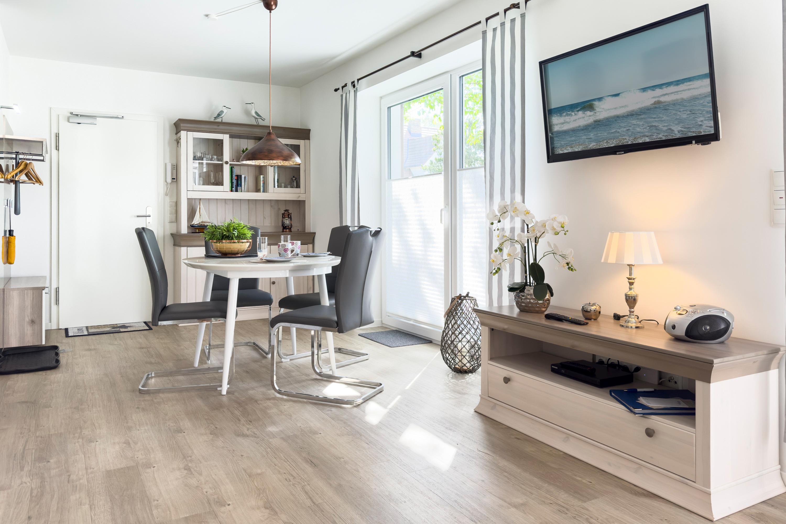 Die Ferienwohnung "Sterntaucher, Whg. 01" empfängt Sie mit einer harmonischen Kombination aus modernem Komfort und maritimem Ambiente. Der helle Wohnbereich lädt zu entspannten Stunden ein, während die voll ausgestattete Küchenzeile keine Wünsche offenlässt. Genießen Sie Ihre Mahlzeiten auf der sonnigen Terrasse mit Blick ins Grüne. Das moderne Badezimmer und das gemütliche Schlafzimmer bieten zusätzlichen Komfort für erholsame Nächte.