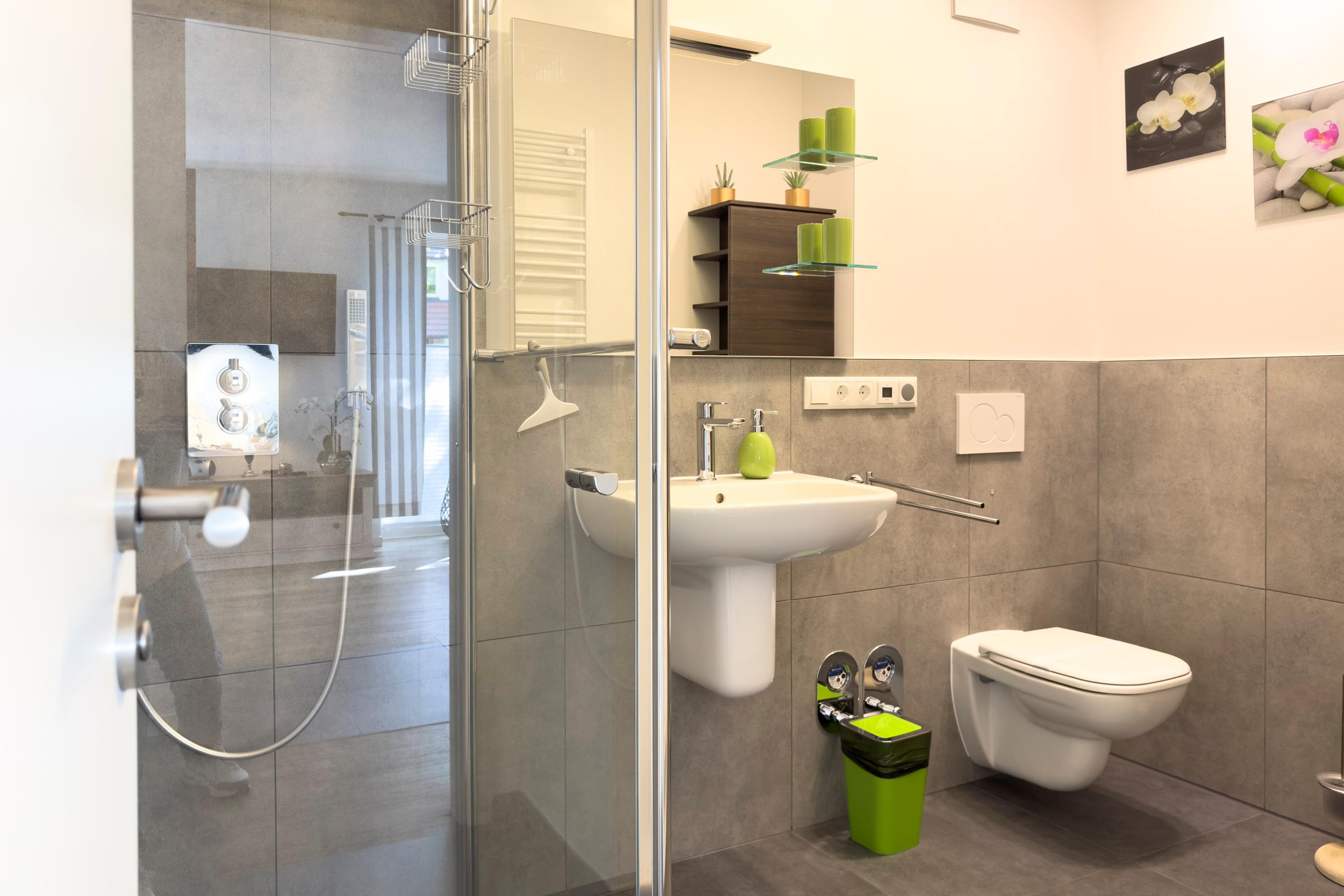 Badezimmer: Modernes Bad mit ebenerdiger Dusche, Fußbodenheizung und Haartrockner