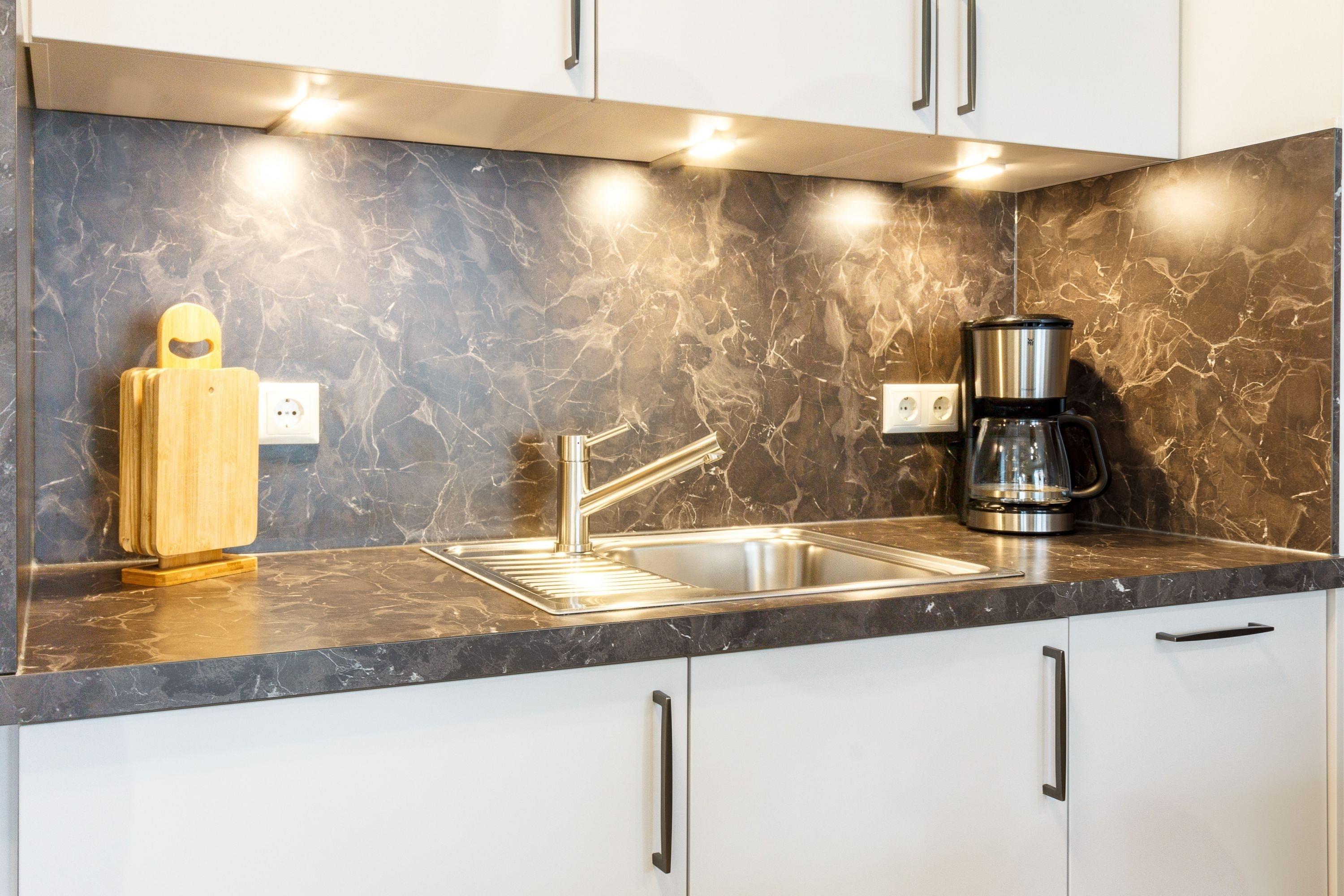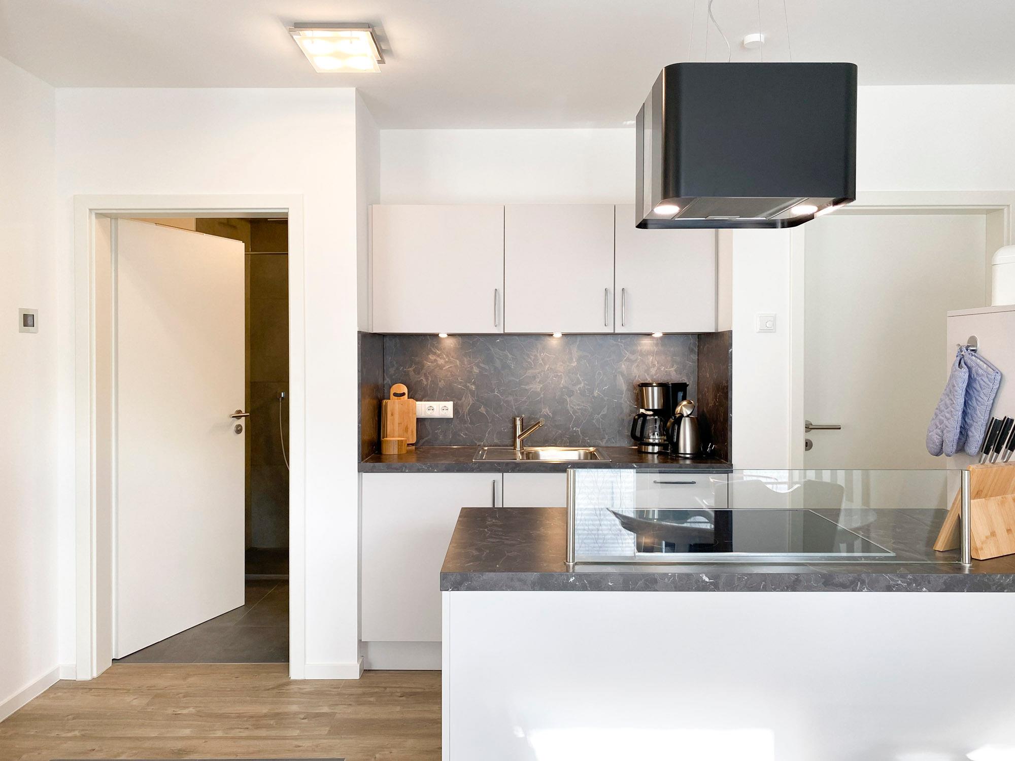 Küche: Voll ausgestattete Küchenzeile mit Backofen, Mikrowelle, Spülmaschine, Kühlschrank, Filterkaffeemaschine, Toaster und Wasserkocher