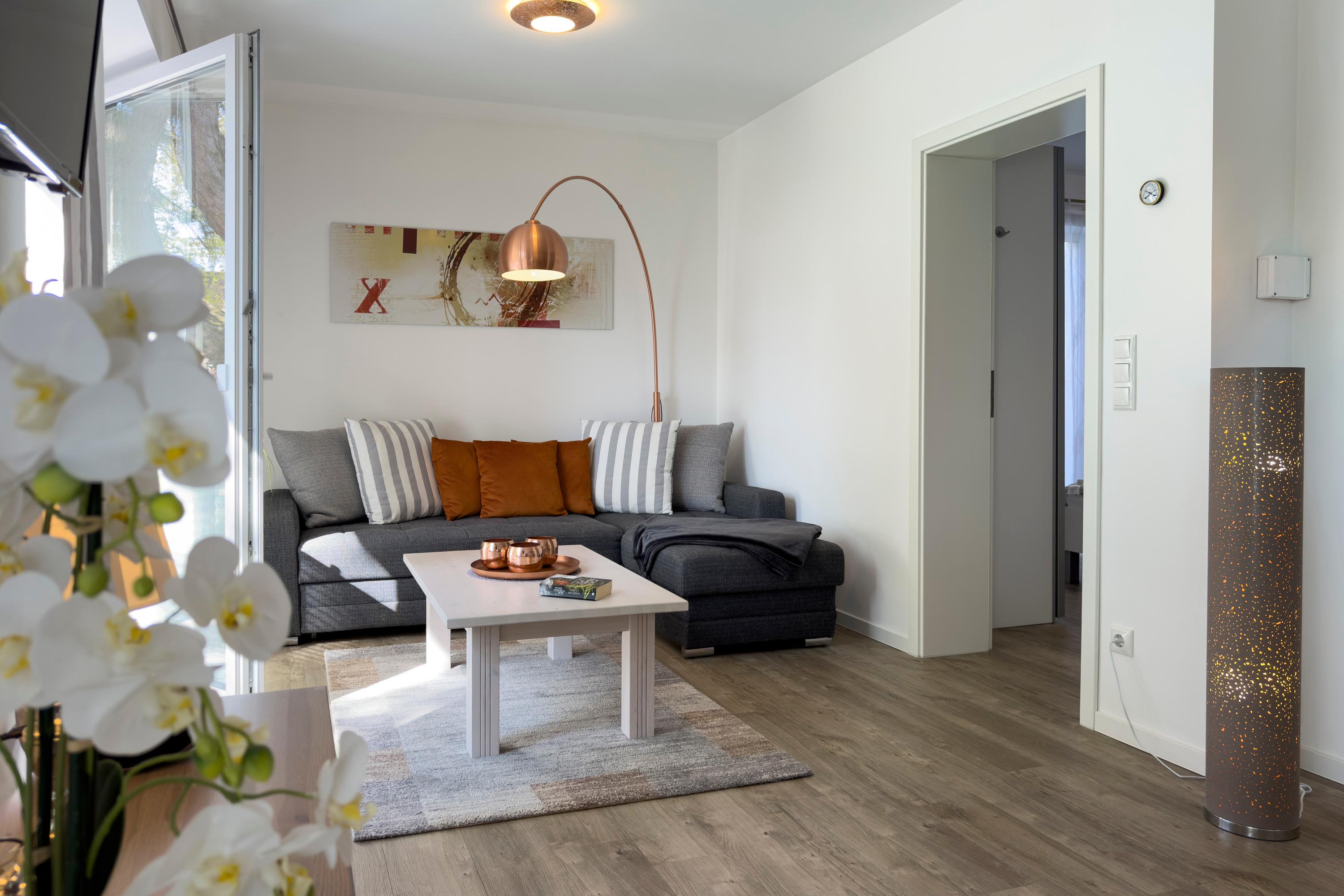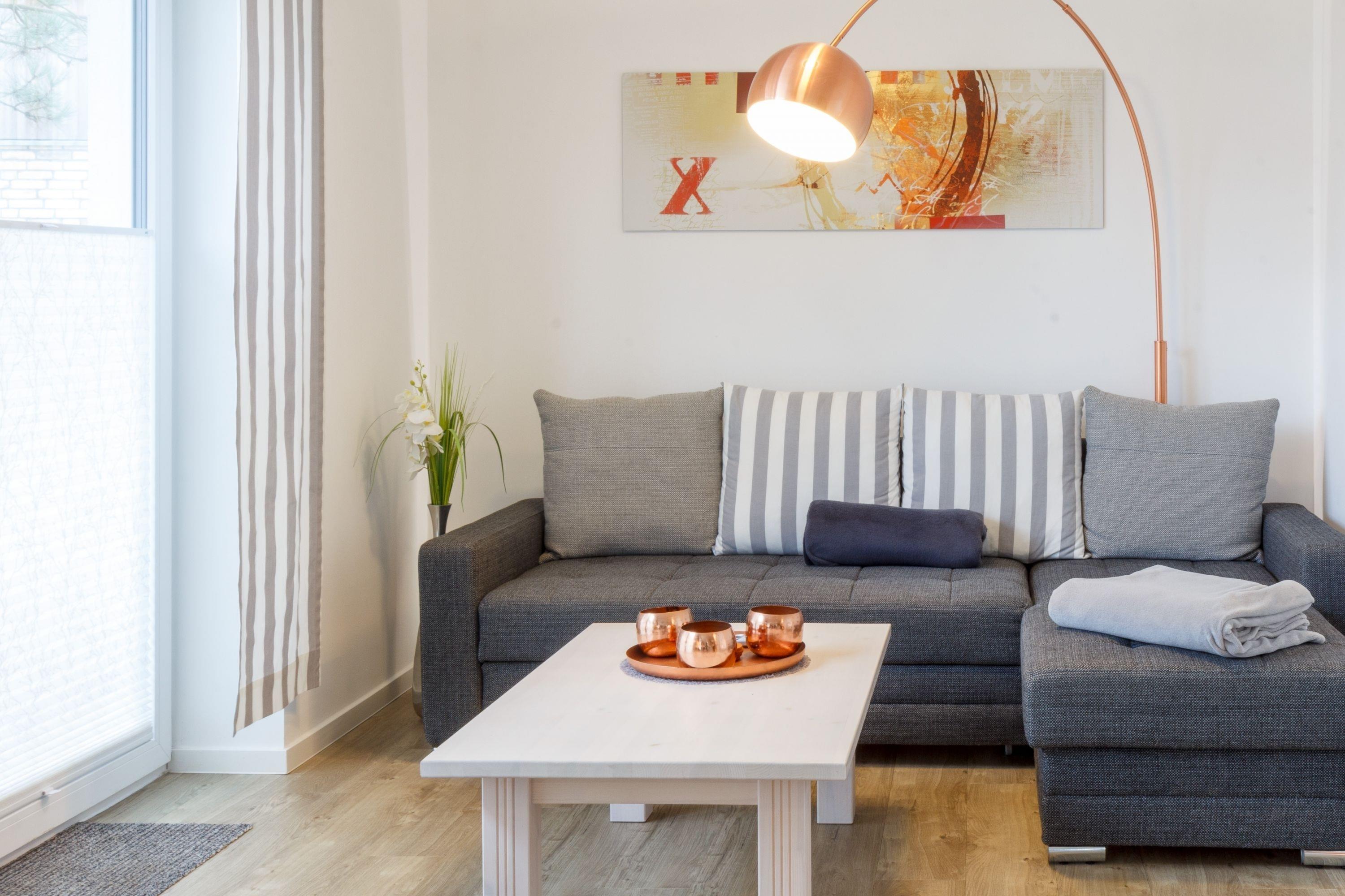 Wohnbereich: Heller Wohnraum mit bequemer Couch, Flachbild-TV und einladender Atmosphäre