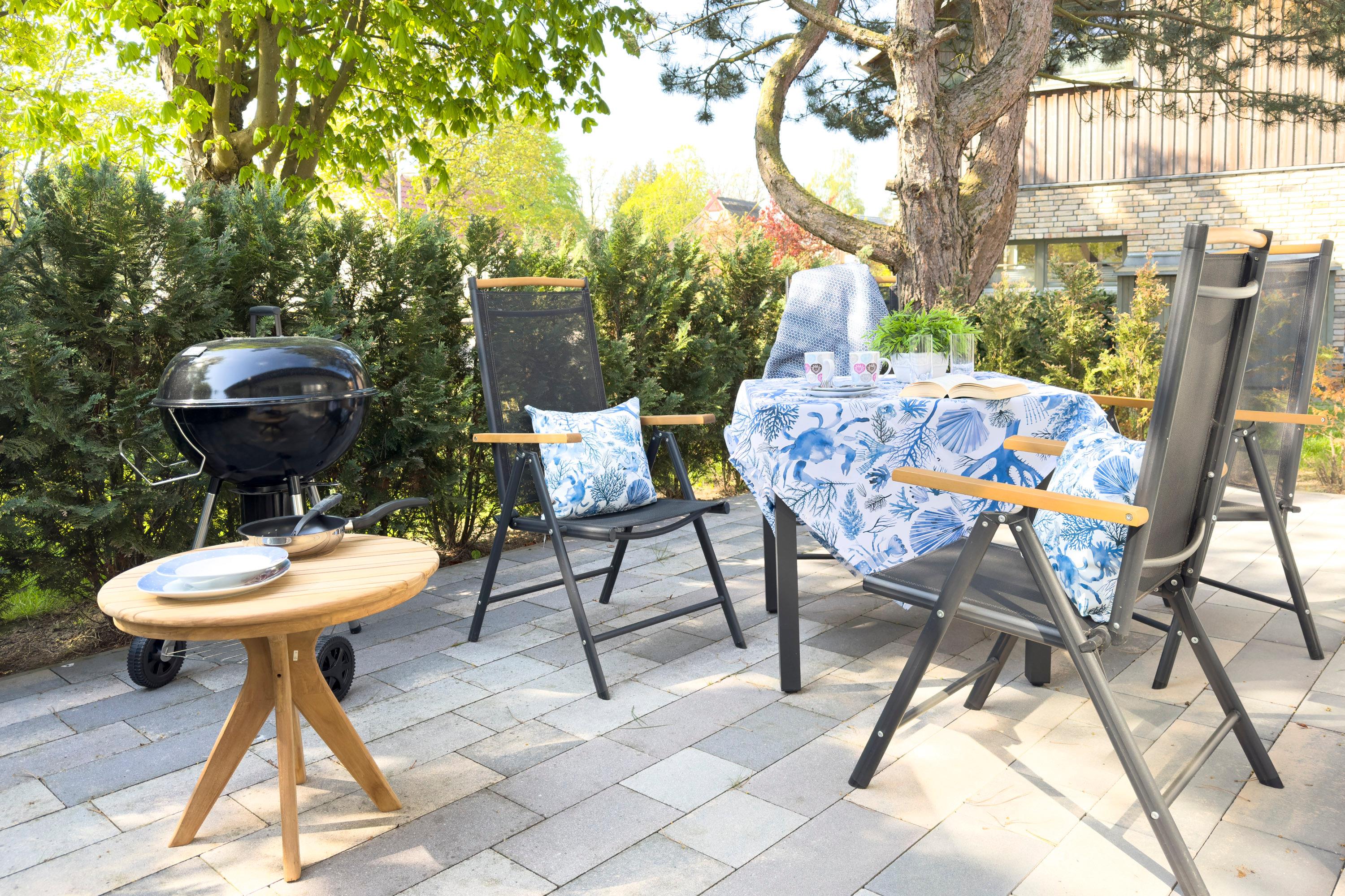 Terrasse: Sonnige Terrasse mit Gartenmöbeln, Sonnenschirm und Grillmöglichkeit