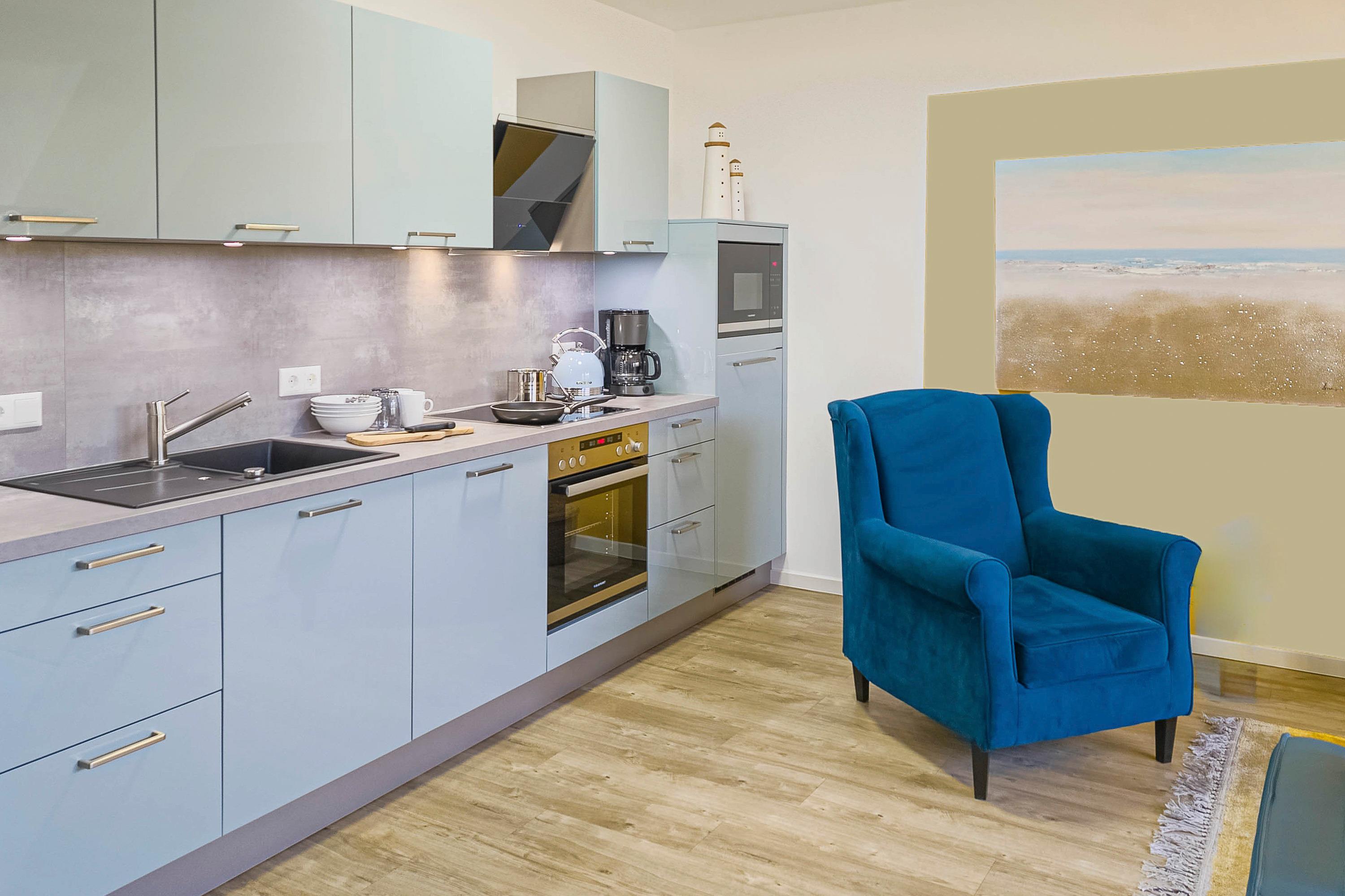 Küche: Voll ausgestattet mit Spülmaschine, Backofen, Cerankochfeld, Mikrowelle, Kaffeemaschine und Toaster.