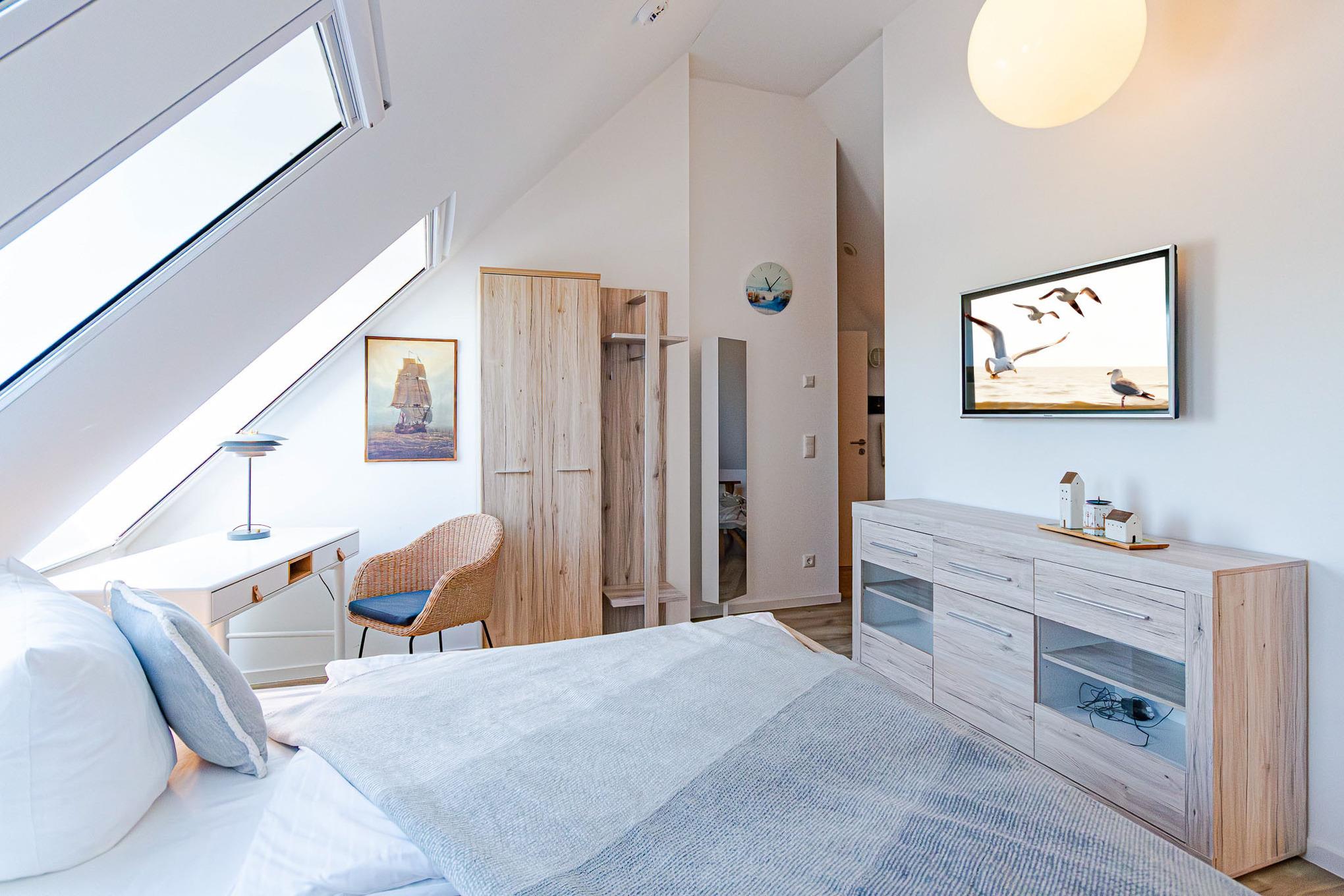 Die Ferienwohnung "Tordalk, Whg. 06" empfängt Sie mit einer harmonischen Kombination aus modernem Komfort und maritimem Ambiente. Der helle Wohnbereich mit Kamin lädt zu entspannten Stunden ein, während die voll ausgestattete Küche keine Wünsche offenlässt. Genießen Sie Ihre Mahlzeiten auf dem westlich ausgerichteten Balkon und lassen Sie den Tag in gemütlicher Atmosphäre ausklingen. Die modernen Badezimmer und die komfortablen Schlafzimmer bieten zusätzlichen Komfort für erholsame Nächte.