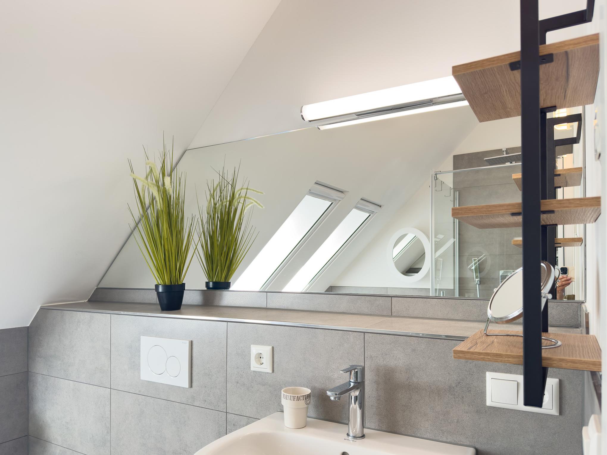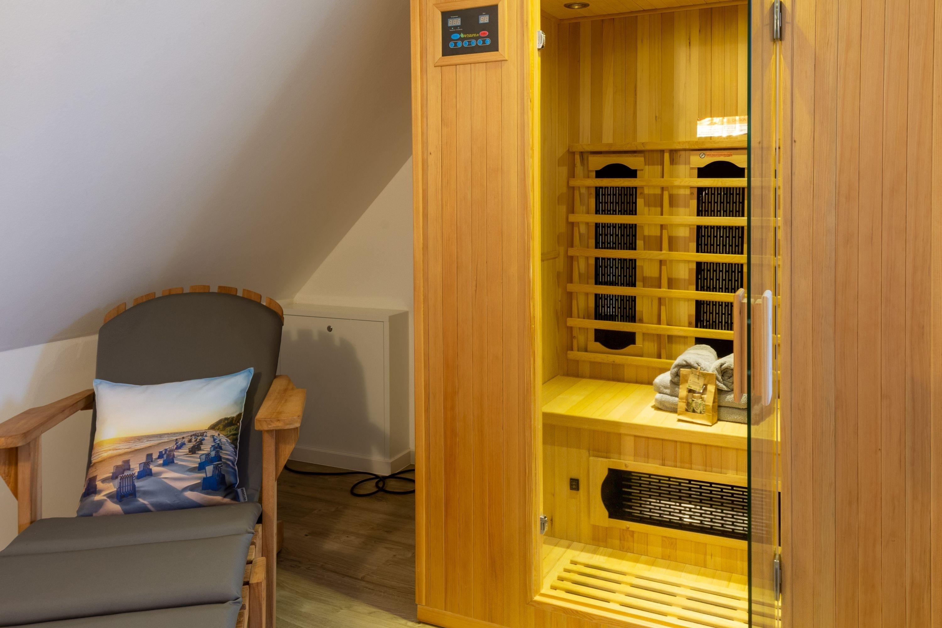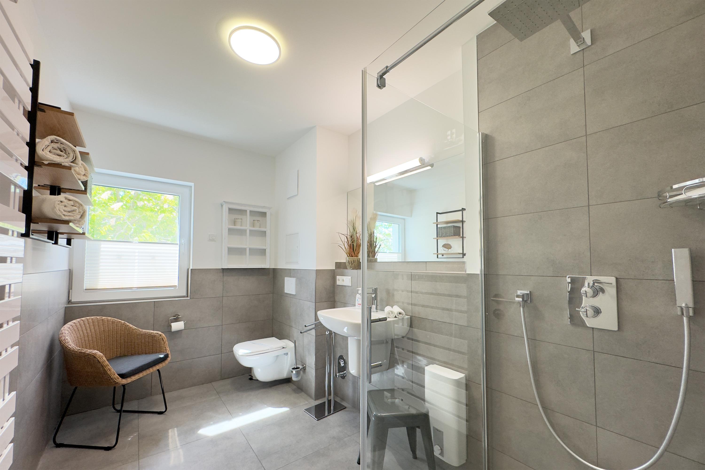 Badezimmer: Fußbodenheizung, ebenerdige Dusche, eigene Infrarot Kabine und eine zusätzliche Dusche für noch mehr Komfort.