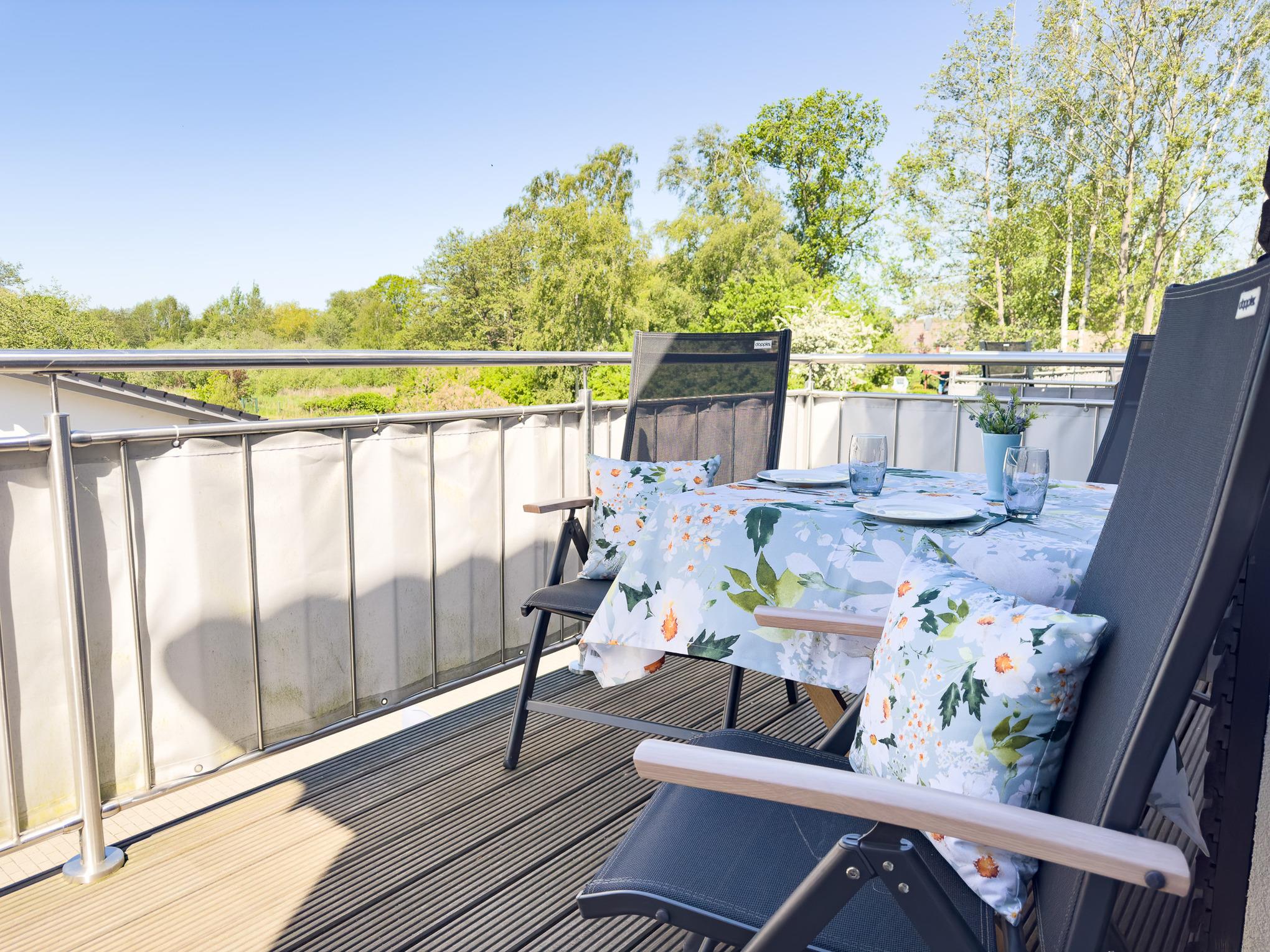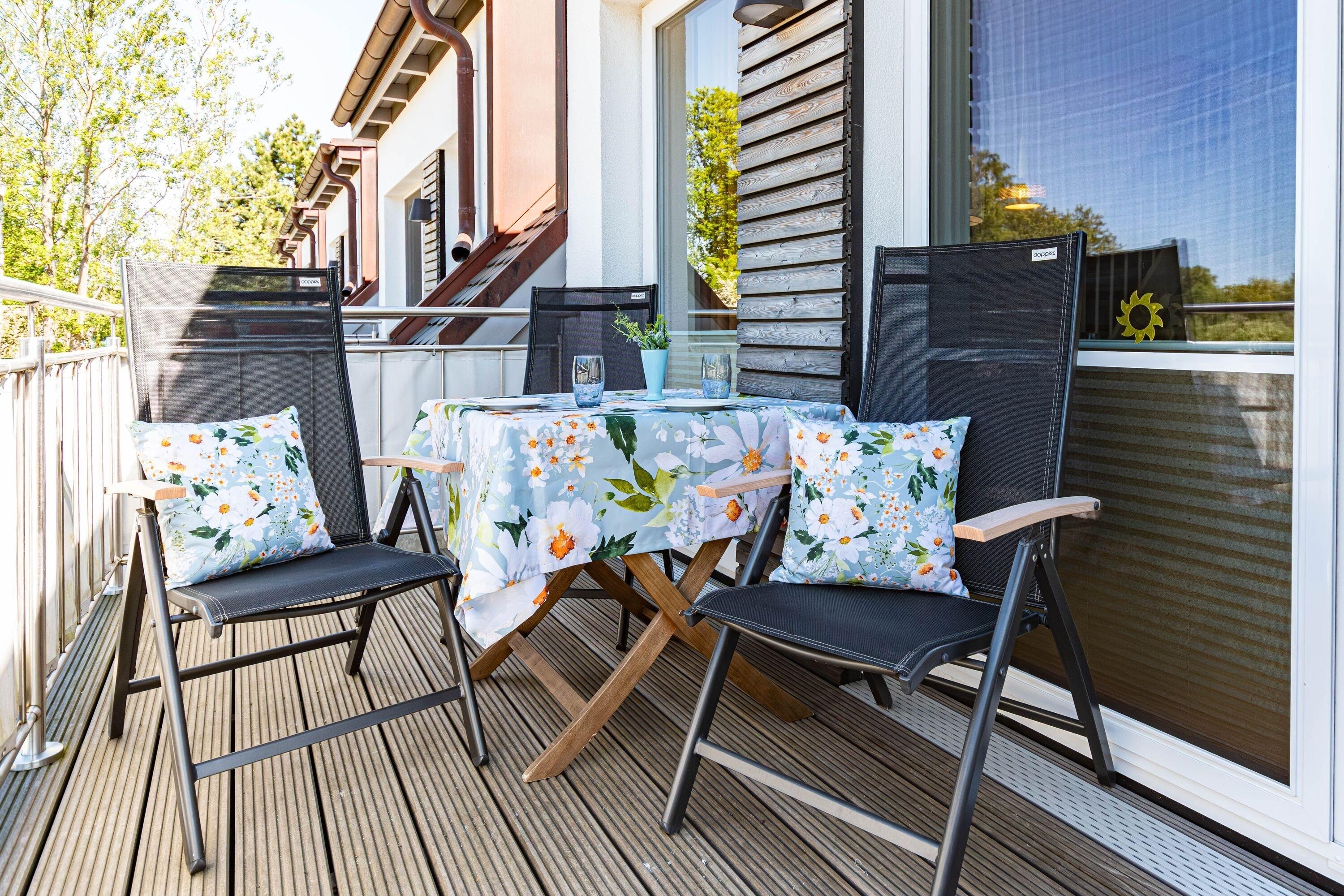 Balkon: Westbalkon ausgestattet mit hochwertigen Balkonmöbeln und Sonnenschirm – perfekt, um die frische Ostseeluft zu genießen.