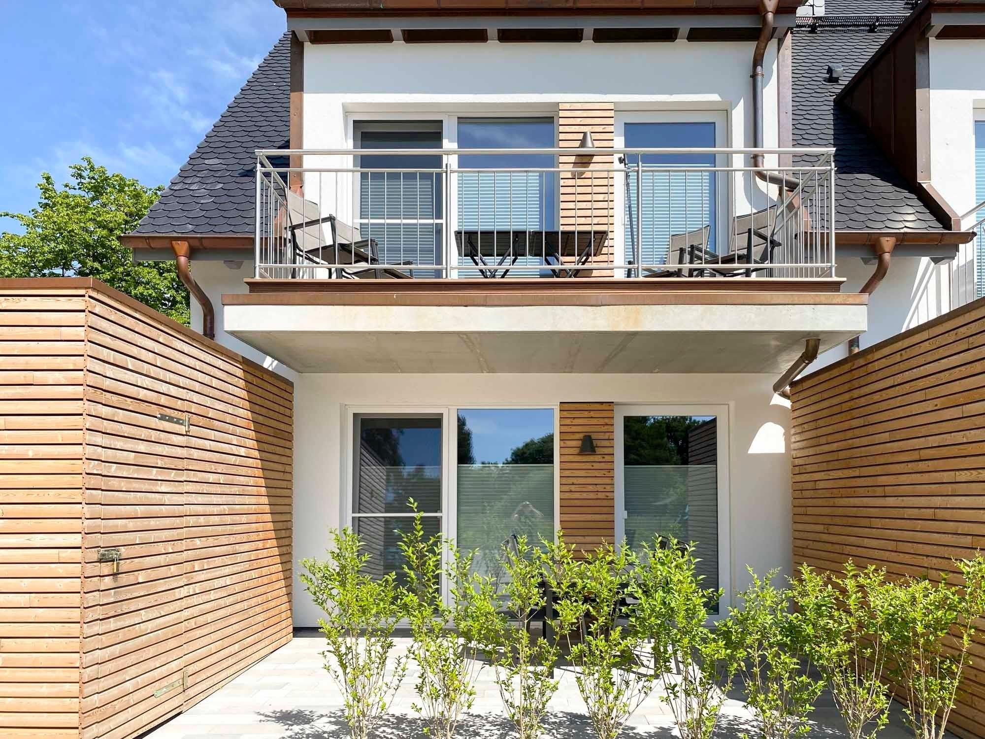 Balkon: Westlich ausgerichteter Balkon mit Gartenmöbeln und Sonnenschirm, ideal zum Entspannen