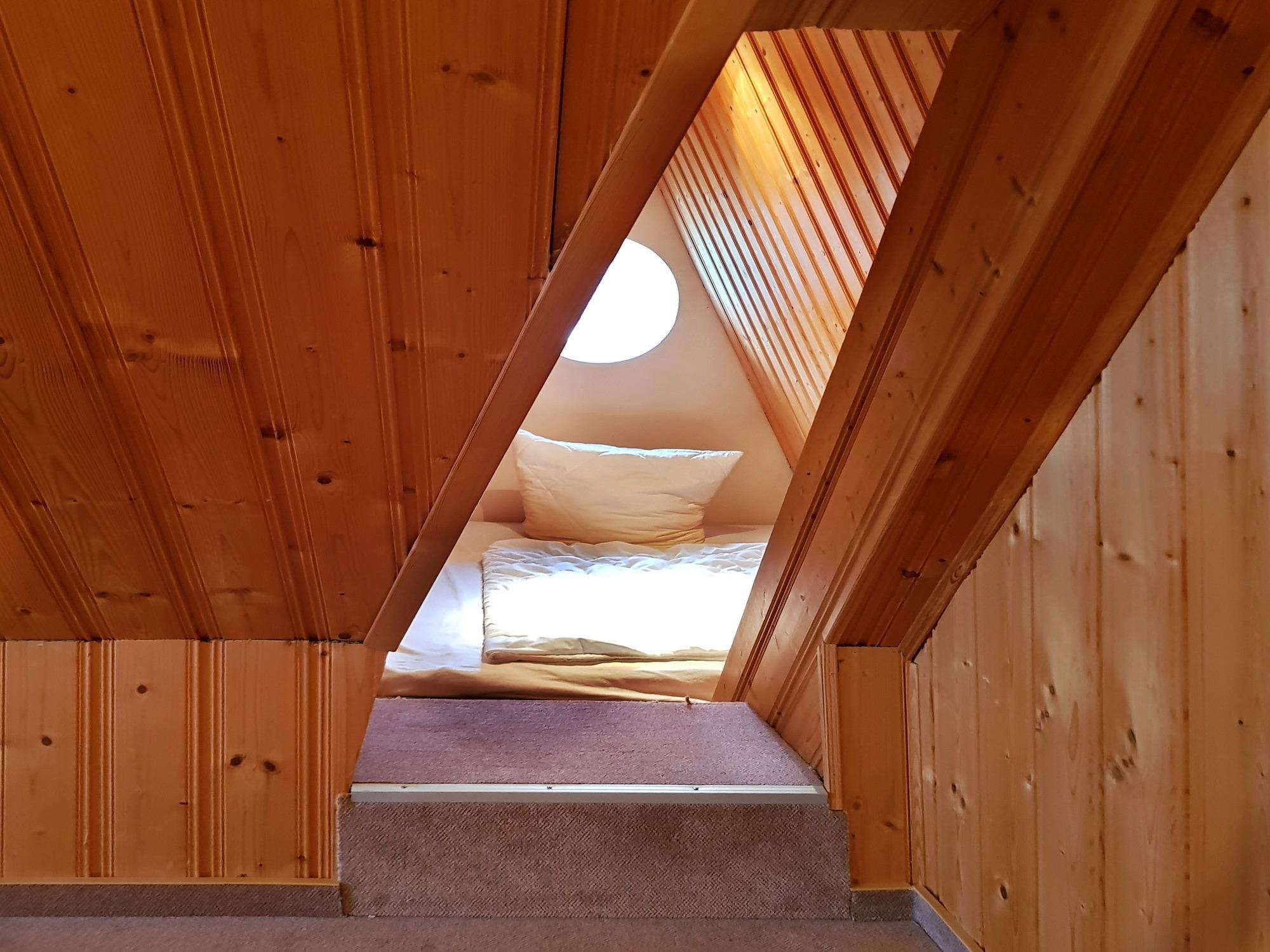 Die gut ausgestattete Ferienwohnung im 1. OG bietet Platz für bis zu 5 Personen. Ein Schlafraum, der Wohnraum mit Küche und das Bad sind im 1.OG. Der 2. Schlafraum ist im DG und über eine zum Wohnraum offene Treppe erreichbar. Vom oberen Schlafraum geht eine Schlafkammer ab, die wie eine kleine Höhle ist und daher bei den meisten Kindern sehr beliebt ist. Diese Schlafhöhle ist mit einer 1,60 x 2m großen Matratze ausgelegt.