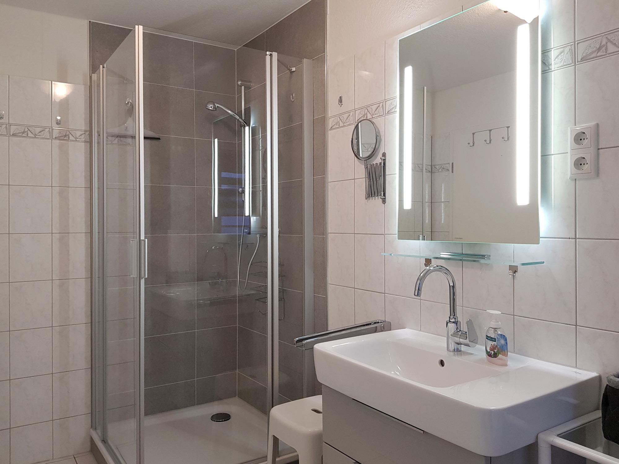 Im großzügigen Duschbad befindet sich die Waschmaschine. Die Dusche hat einen niedrigen Einstieg und verfügt über eine automatische Mischbatterie für das Duschwasser. Der nach Süden gehende Balkon ist mit einem Sichtschutz versehen und bietet ausreichend Platz für einen angenehmen Aufenthalt im Freien. Gartenmöbel mit passenden Sitzauflagen und ein Sonnenschirm gehören zur Ausstattung.