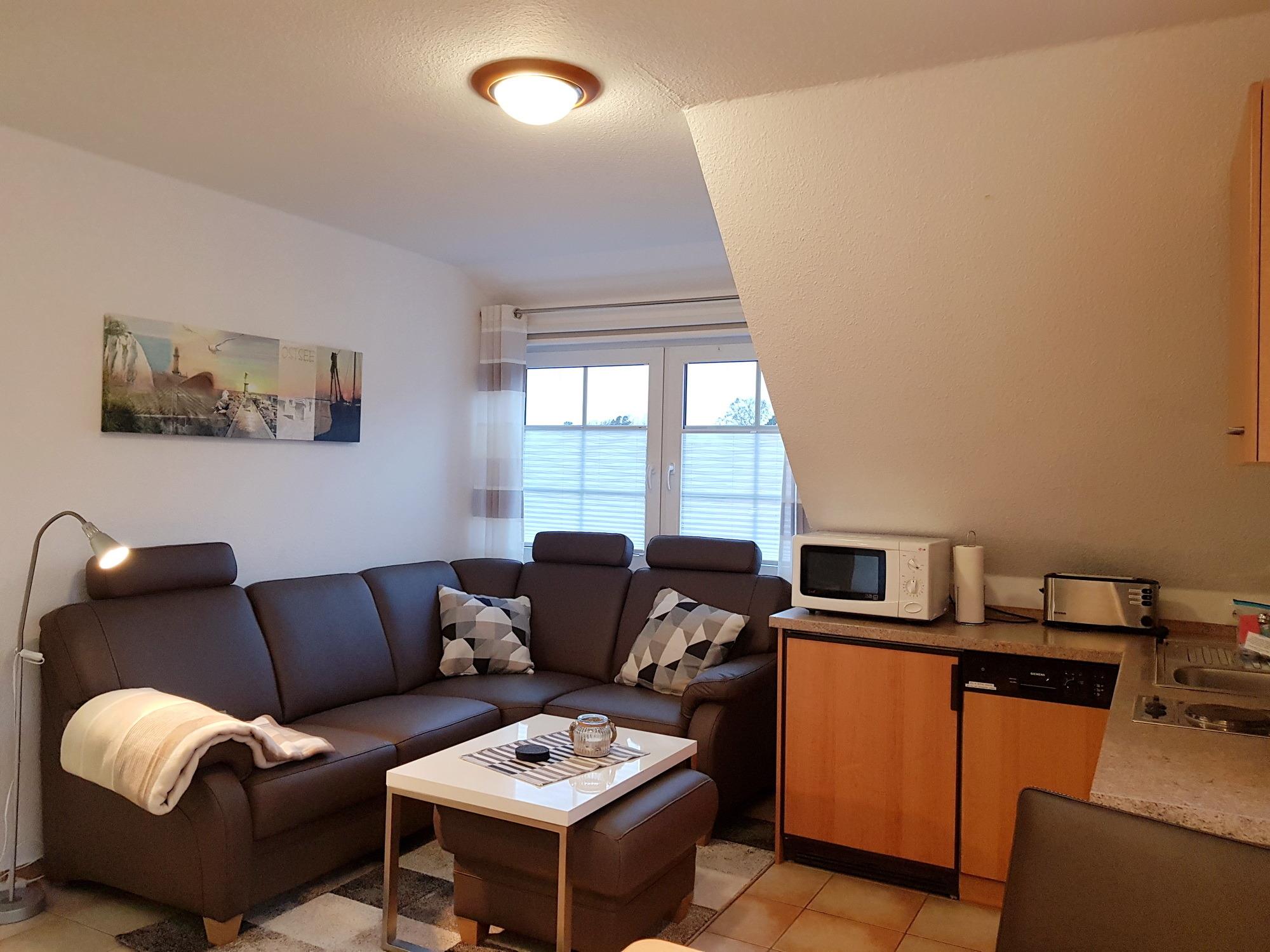 Die Fewo (36 qm) ist hell und freundlich eingerichtet und mit allem Komfort ausgestattet. In der Küchenzeile gehören eine Mikrowelle, eine Geschirrspülmaschine sowie ausreichend Geschirr mit zur Ausstattung. Die Küche wurde 2022 komplett erneuert.