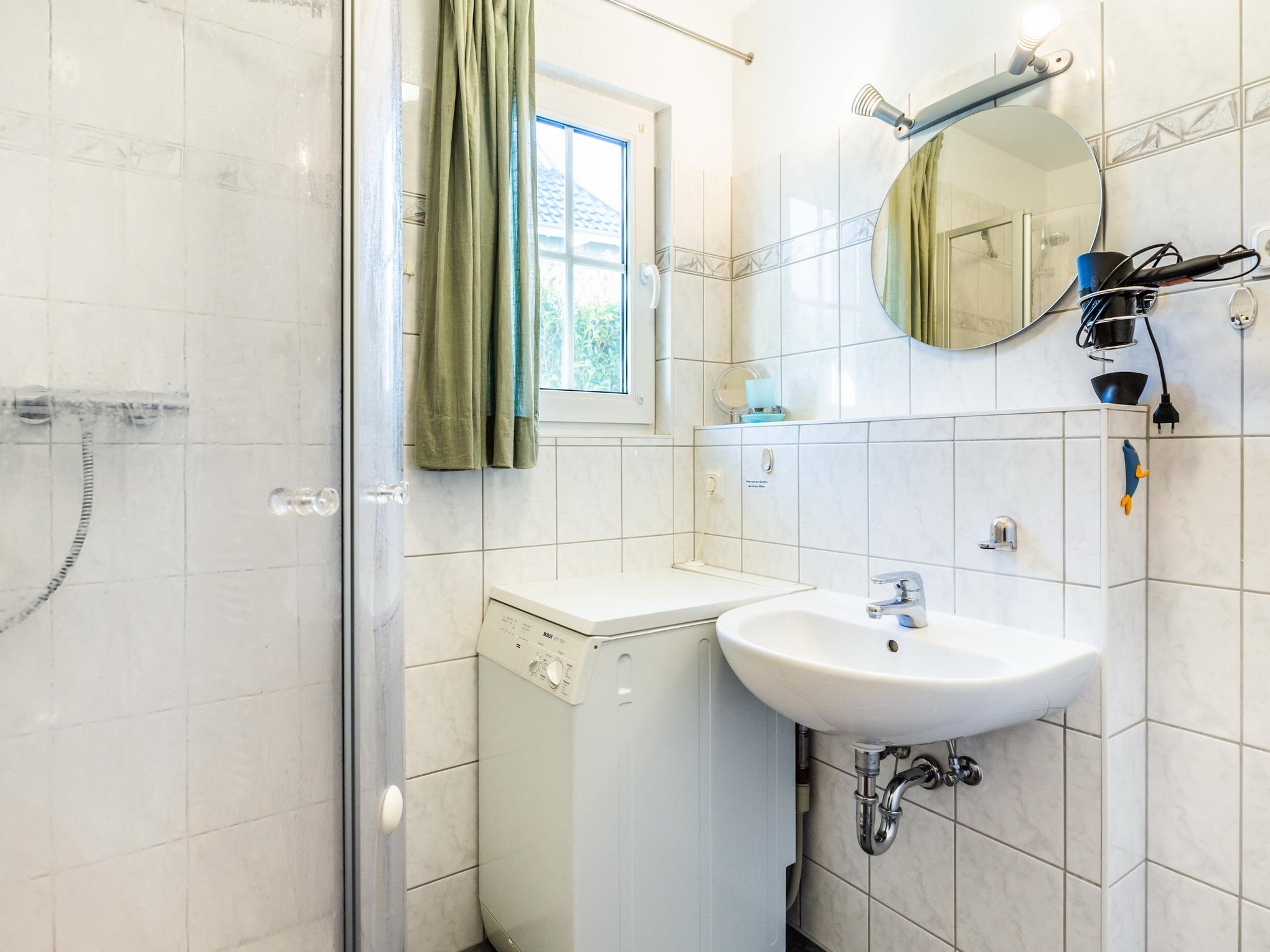 Im Bad mit Dusche und WC sorgt die integrierte Waschmaschine schnell und bequem für saubere Wäsche.