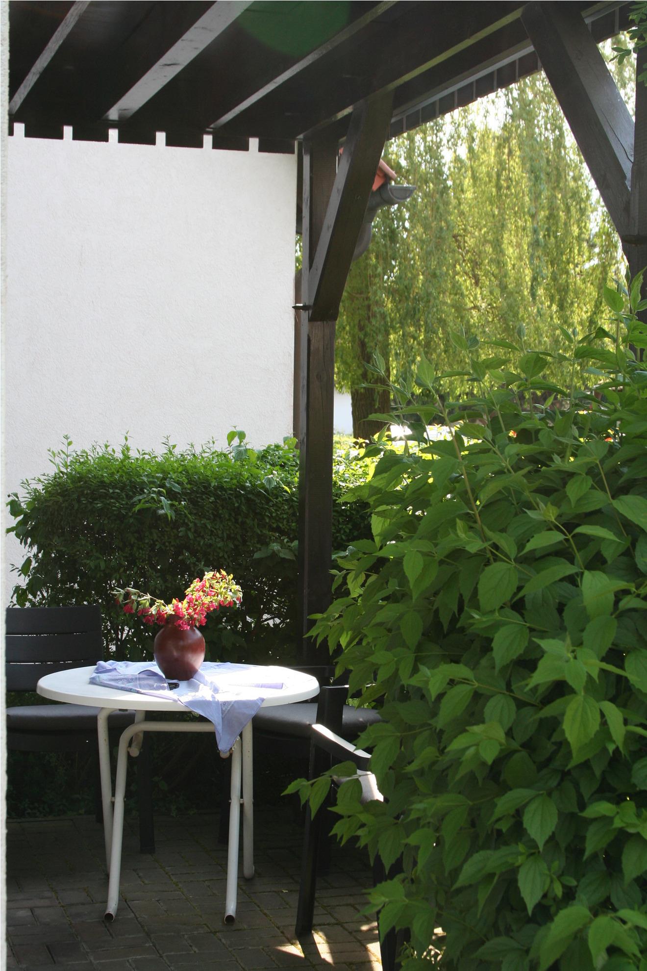 Die Wiese vor der Wohnung ist ruhig und sonnig. Ein Hund ist nach Voranmeldung willkommen.