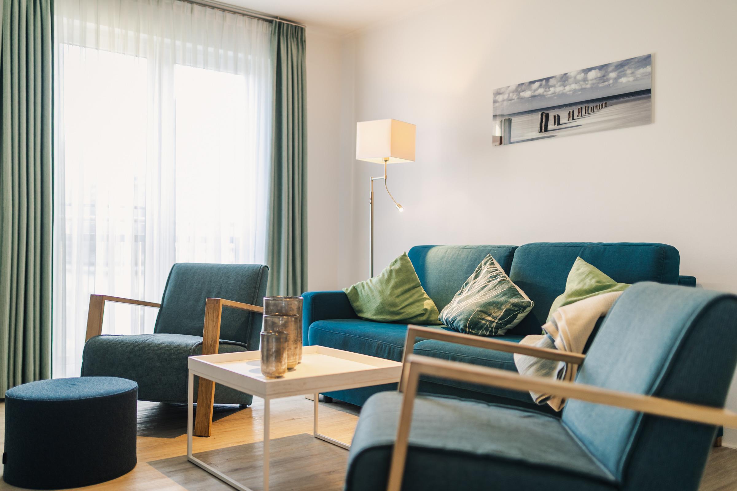 Zwei separate Schlafzimmer mit komfortablen Boxspring-Doppelbetten und TV sorgen für erholsame Nächte. Der gemütliche Wohnbereich mit großer Schlafcouch und Flat-TV lädt zu entspannten Stunden und gemeinsamen Abenden ein.
