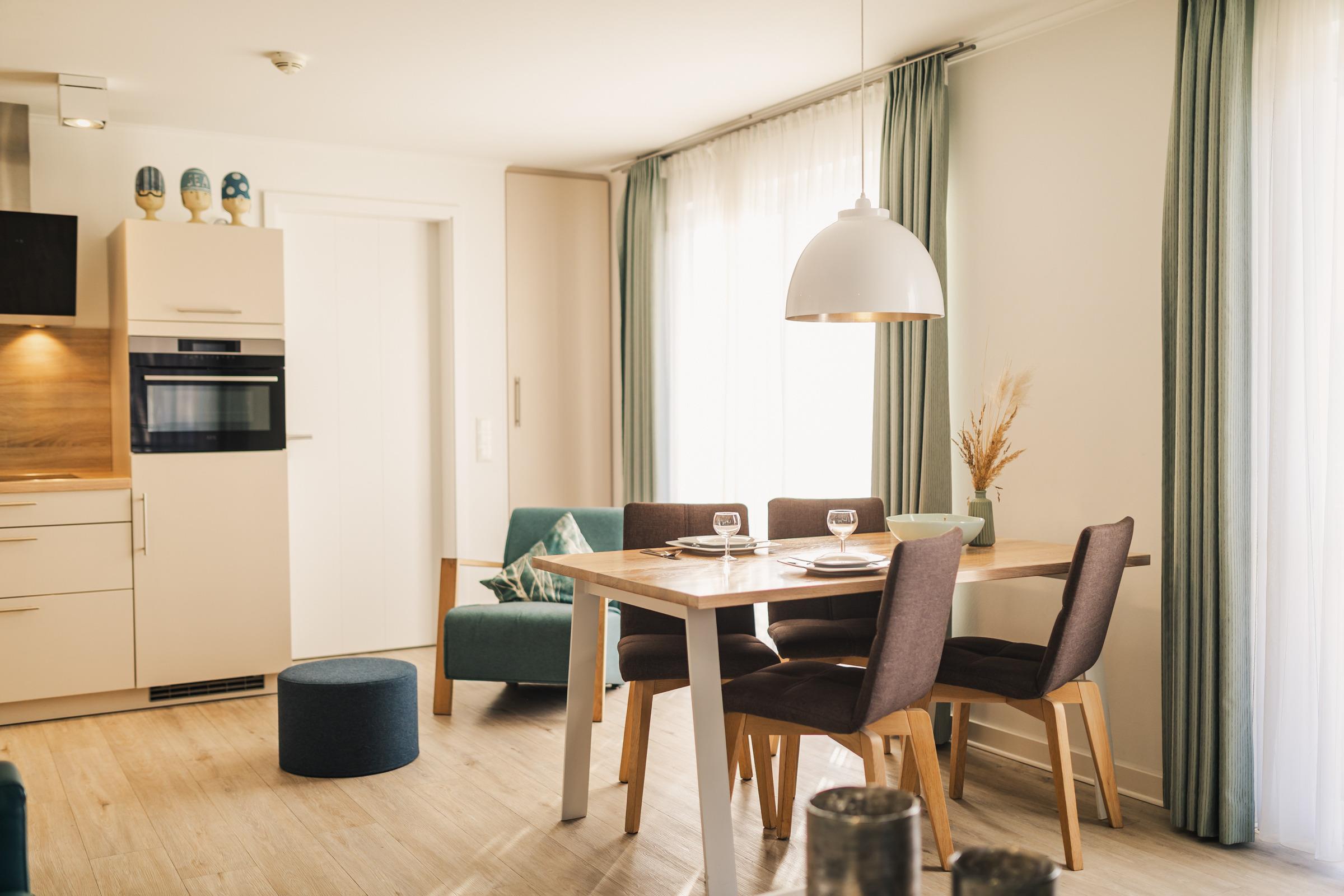 Der offene Essbereich und die voll ausgestattete Küche mit Backofen, Cerankochfeld, Geschirrspüler, Kaffeemaschine, Wasserkocher, Toaster u.v.m. machen das gemeinsame Kochen und Genießen im Urlaub ganz unkompliziert. Ein besonderer Lieblingsplatz ist der Balkon – perfekt, um den Tag bei frischer Ostseeluft ruhig ausklingen zu lassen.