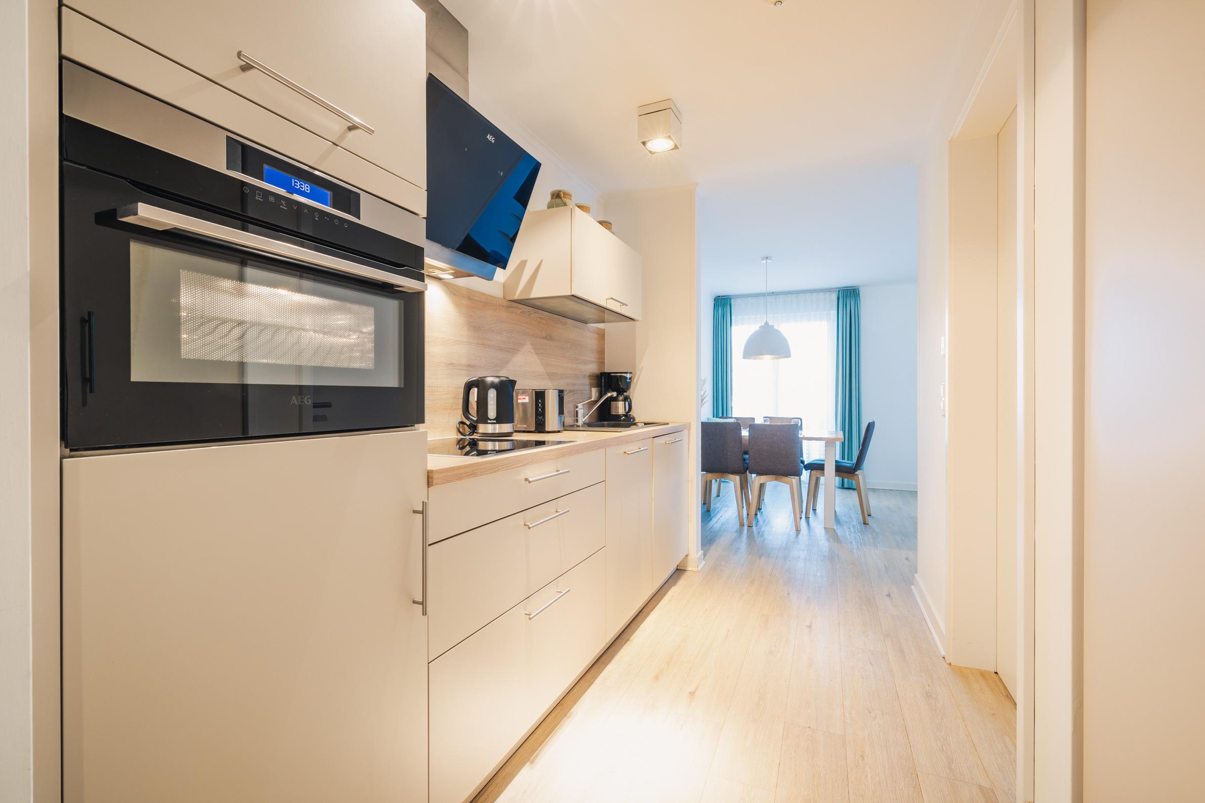 Die voll ausgestattete Küche bietet mit Spülmaschine, Backofen, Cerankochfeld und Mikrowelle alles, was Sie für eine flexible Selbstversorgung benötigen. Direkt vom Wohnbereich aus gelangen Sie auf die private Terrasse – ideal für ein Frühstück im Freien oder ruhige Abendstunden.