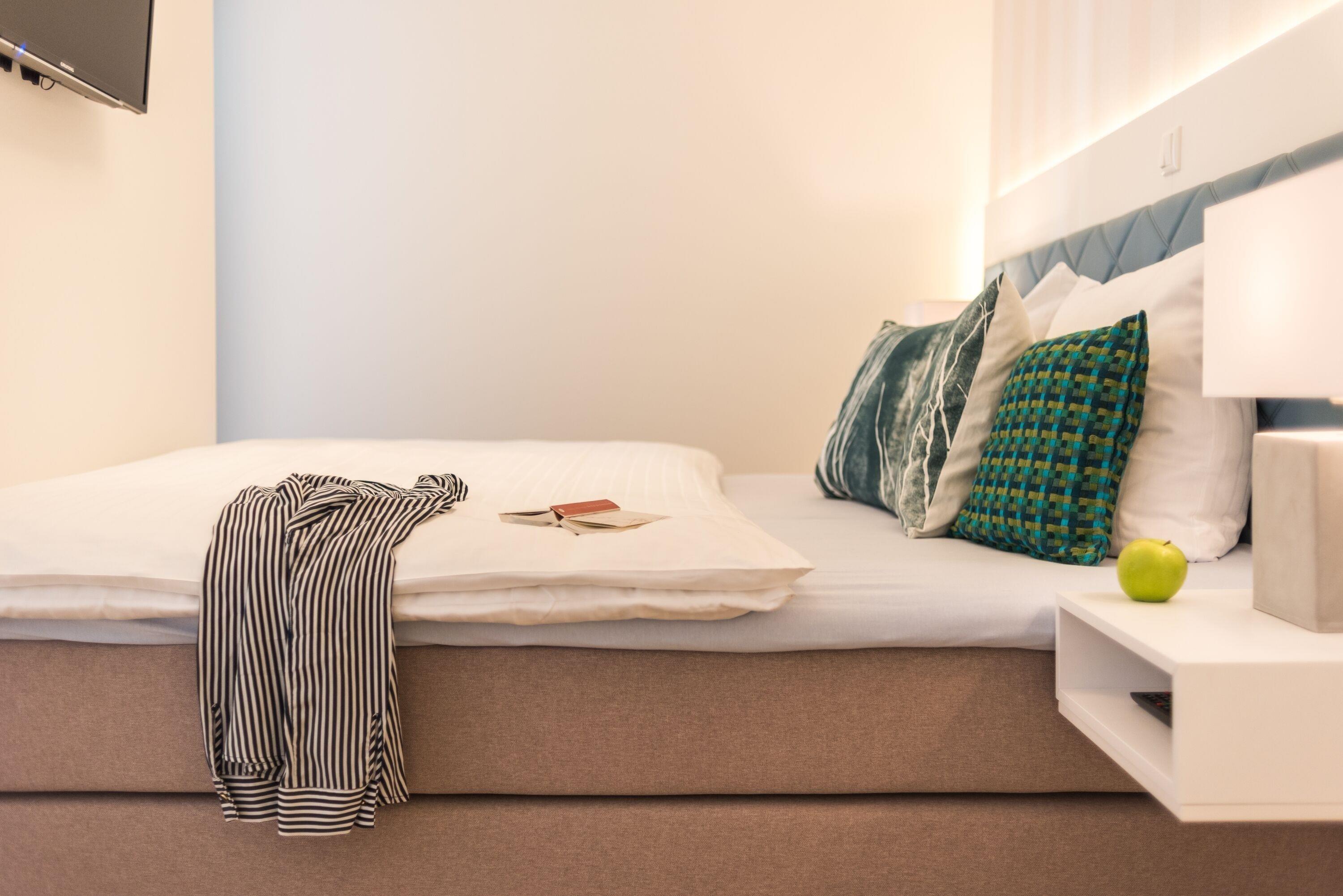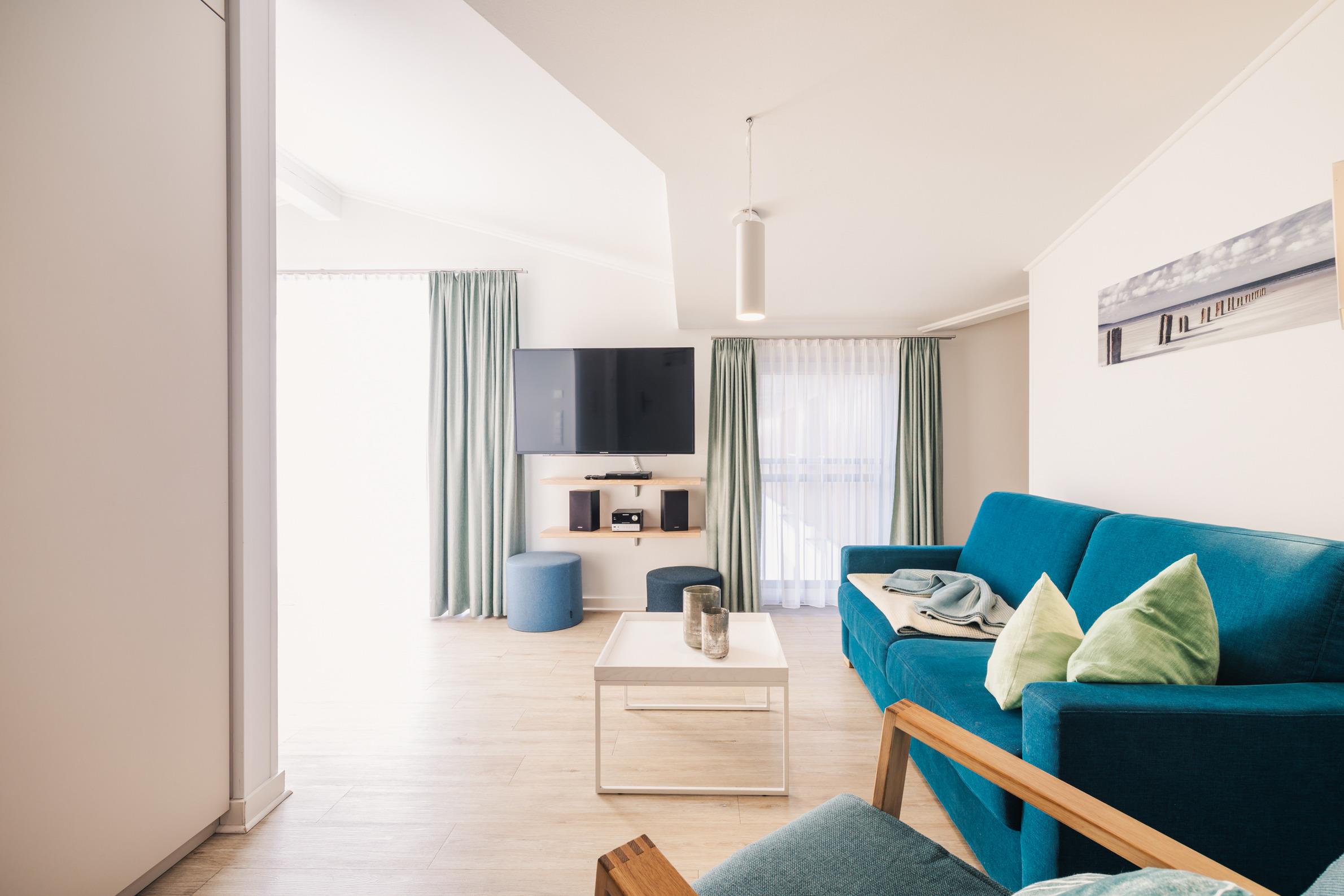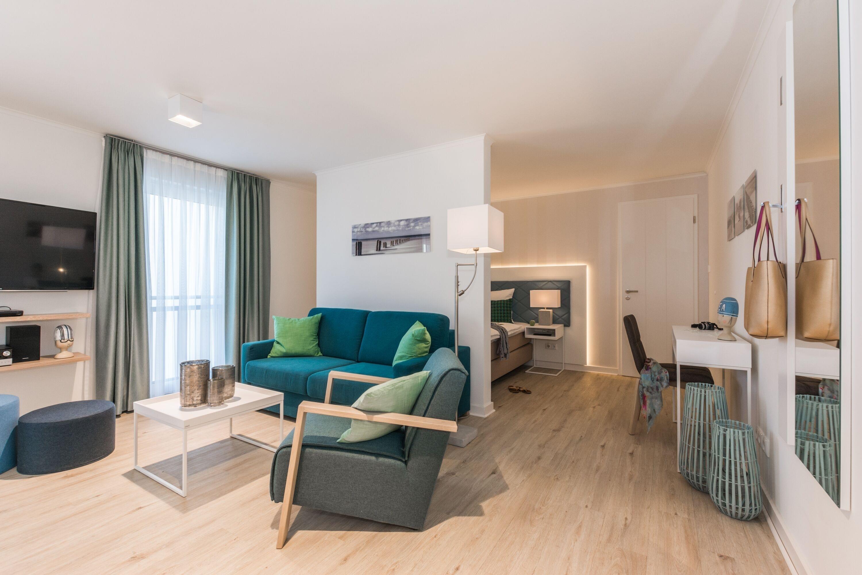 Auf 40 m² erwartet Sie ein modernes, maritimes Ambiente, das Leichtigkeit und Wärme ausstrahlt. Der offene Wohn- und Schlafbereich mit komfortablem Boxspring-Doppelbett lädt zu entspannten Abenden ein – vielleicht mit einem Film, einem guten Buch oder einfach einem Glas Wein nach einem langen Strandspaziergang.