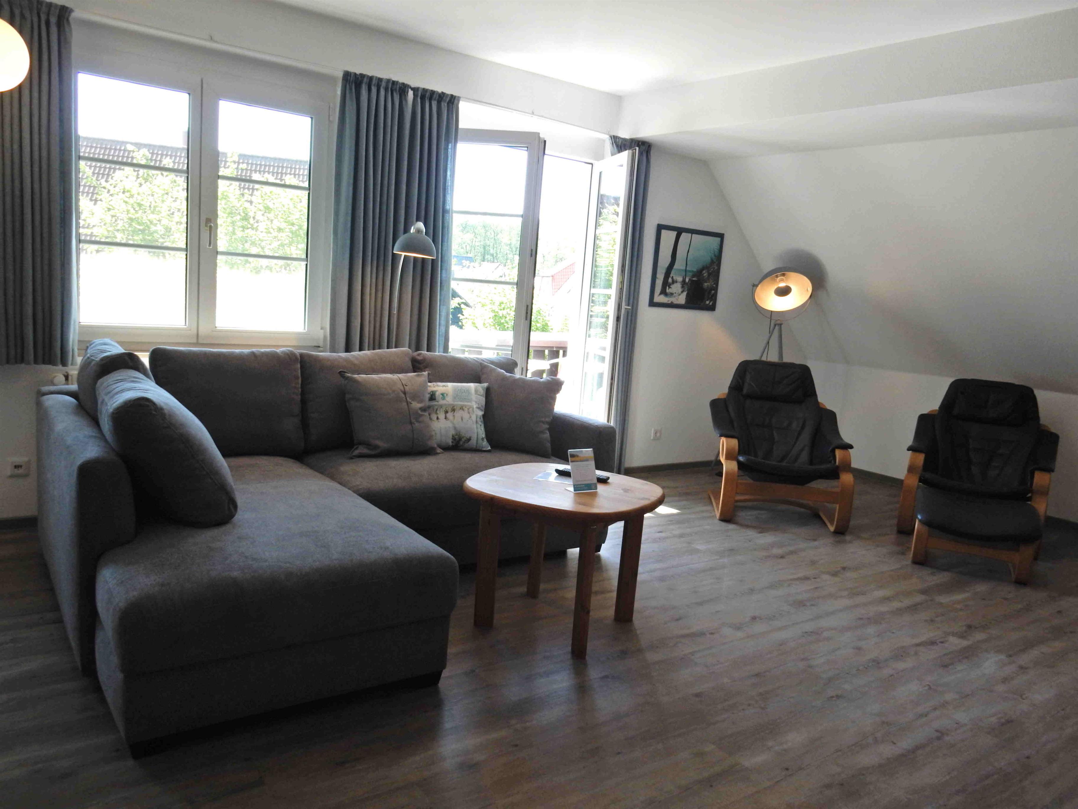 3 Zimmer-Maisonette ca. 75 qm für 2-6 Personen, Haus A in der Residenz Kormoran, Grüne Straße 45A-R, Ostseebad Prerow. 1.OG: Wohnzimmer mit Schlafcouch, Sitzgarnitur, Kleiderschrank, SAT-TV/Radio, WLAN, Duschbad/WC, Balkon, Essecke mit Küchenzeile (Spülmaschine). 2.OG: 2 Schlafzimmer, 1x Doppelbett, 1x 2 Einzelbetten, Dusche/WC