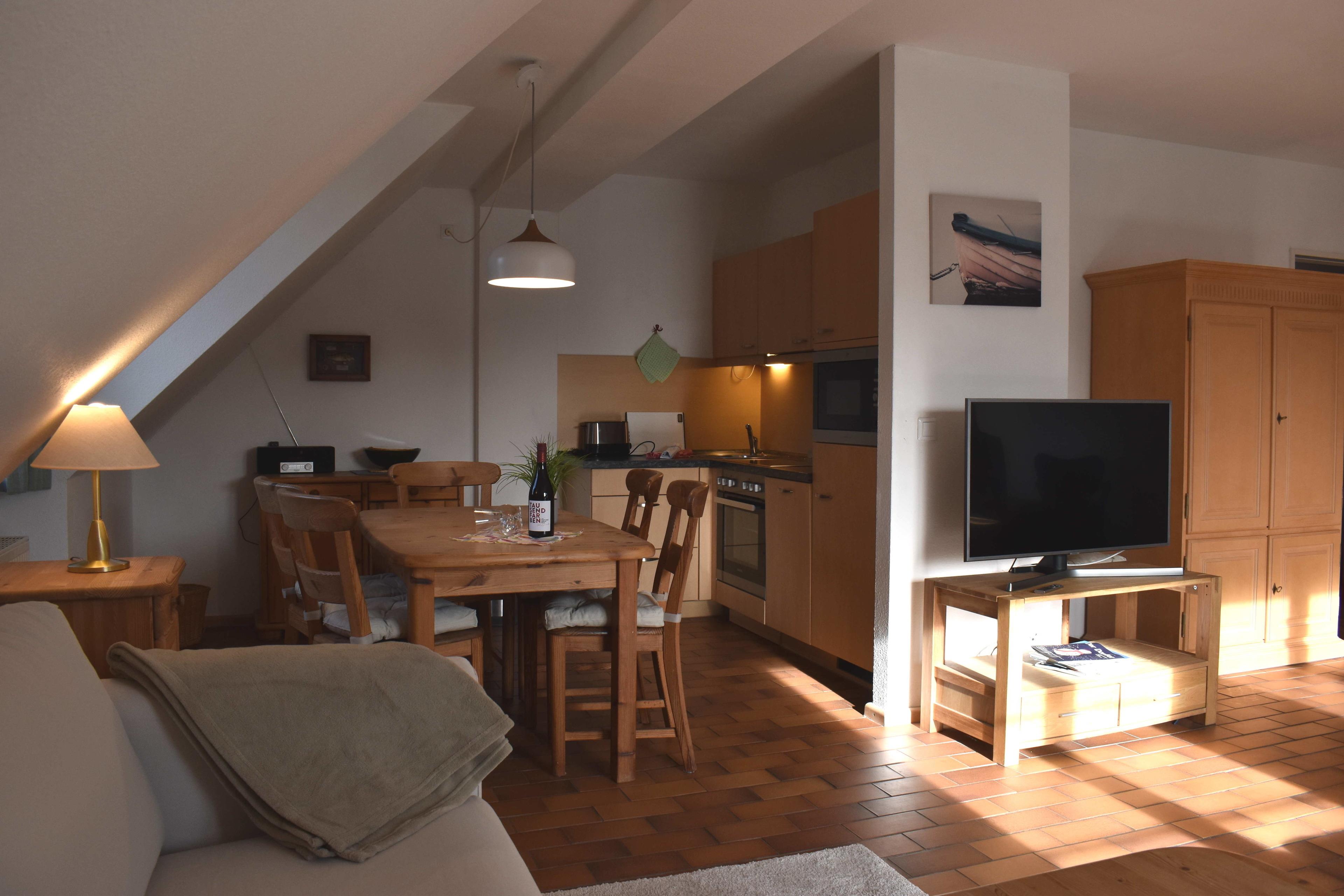 3 Zimmer-Maisonette ca. 75 qm für 2-6 Personen, Haus I in der Residenz Kormoran, Grüne Straße 45A-R, Ostseebad Prerow. 1.OG: Wohnzimmer mit Schlafcouch, Sitzgarnitur, Kleiderschrank, SAT-TV/Radio, WLAN, Duschbad/WC, Balkon, Essecke mit moderner Küche (Spülmaschine, Backofen, Mikrowelle). 2.OG: 2 Schlafzimmer, 1x Doppelbett, 1x 2 Einzelbetten, Dusche/WC.