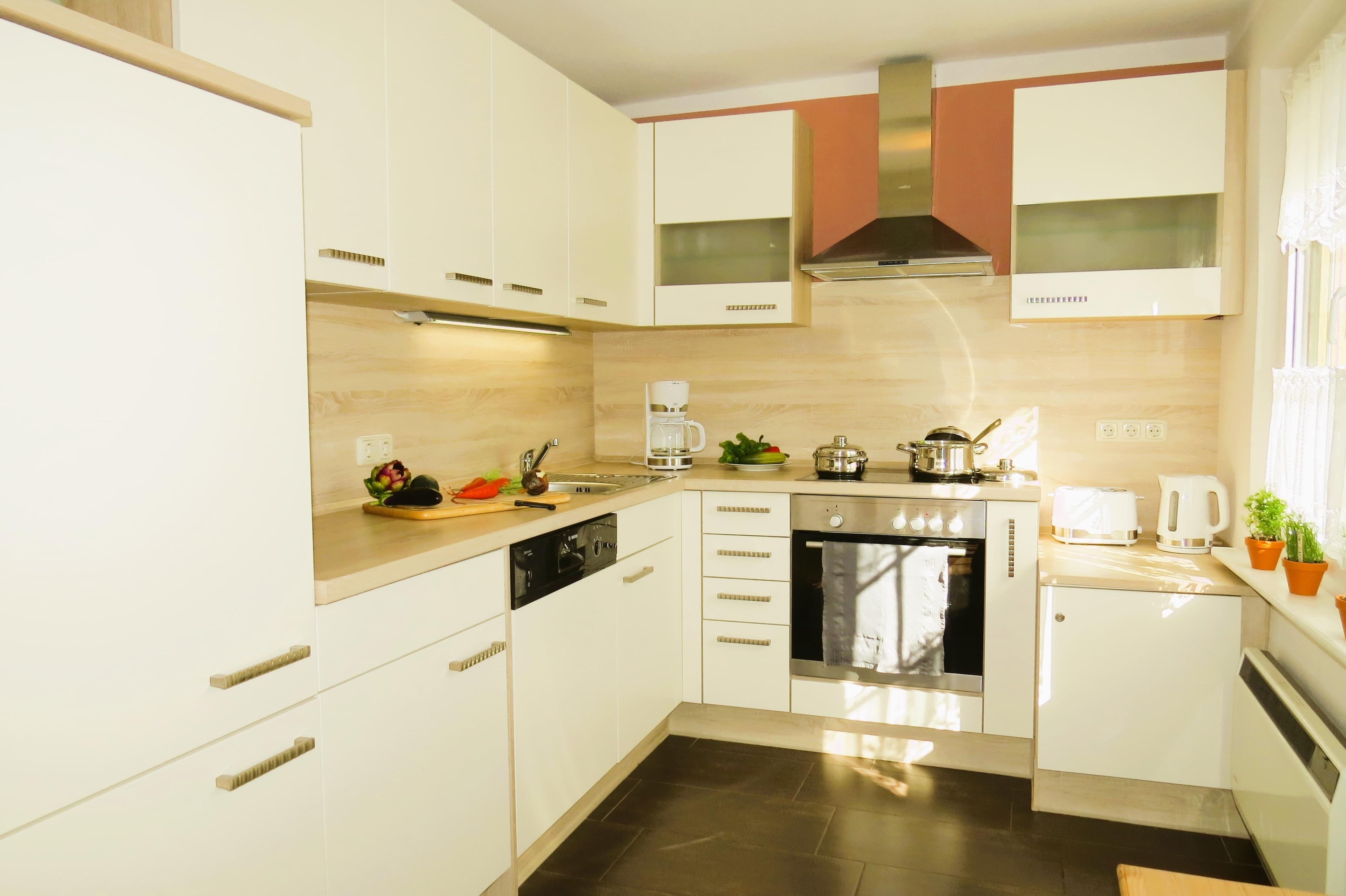 In der unteren Etage finden Sie alles, was Ihren Aufenthalt so angenehm wie möglich gestaltet. Wir möchten, dass Sie sich wie Zuhause fühlen. Unser modernes Bad ist mit einer großzügigen Dusche und WC ausgestattet. Die offene Küche lädt mit modernem Standard zum Kochen ein. Hier finden Sie genügend Freiraum und Ausstattung um kulinarisch kreativ zu werden. Es ist ein Cerankochfeld, Backofen, Geschirrspüler, Toaster, Kaffeemaschine, Kühlschrank und notwendiges Geschirr und Töpfe vorhanden. Auch für Ihre Wäsche steht Ihnen eine Waschmaschine zur Verfügung.