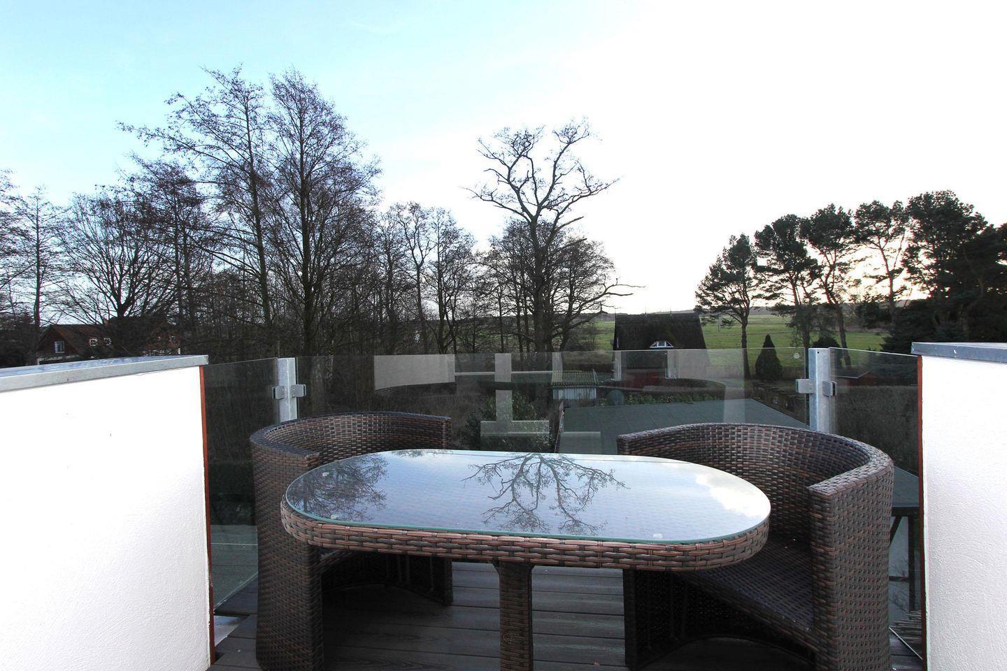 Auf dem Balkon im Dachgeschoss kann man sein Frühstück mit Blick auf die Wiesen gen Süden genießen und auch auf der naturbelassenen Terrasse mit Süd-Ost-Ausrichtung lassen sich die Sonnenstunden genießen.