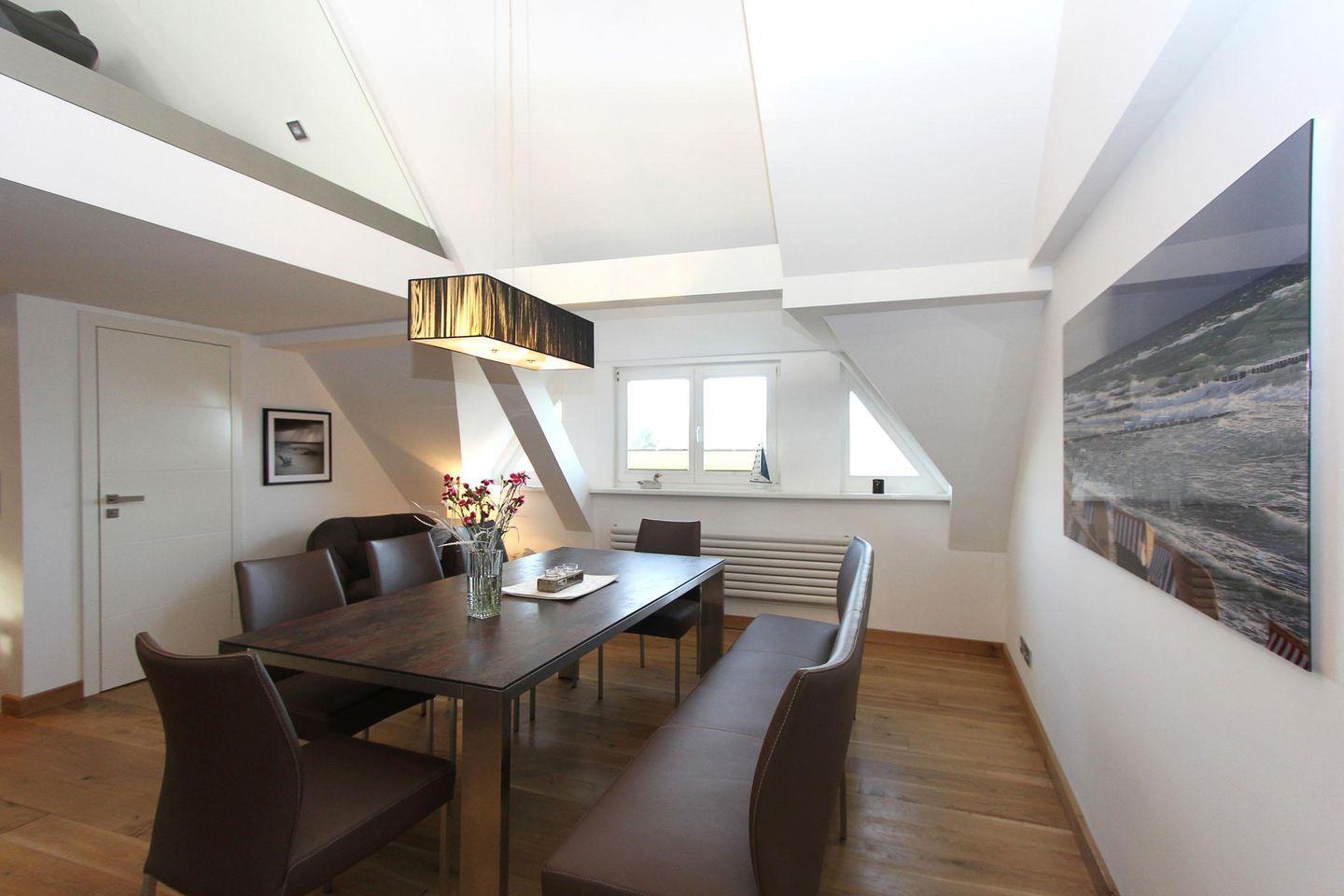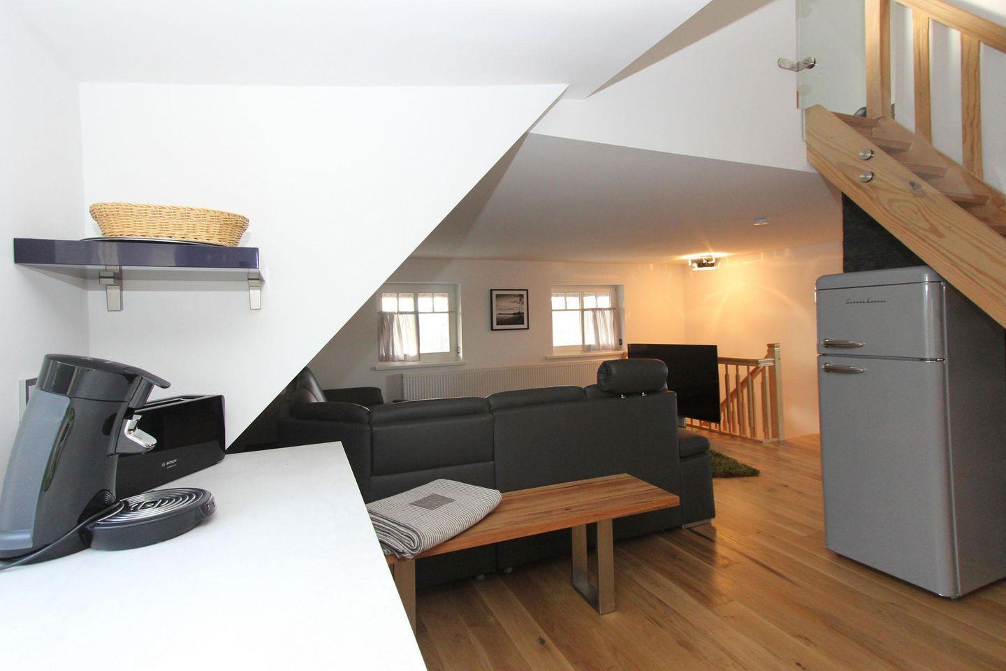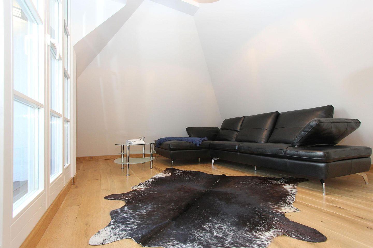 Das Herz dieser exklusiven rohrgedeckten Doppelhaushälfte bildet der Wohn- und Essbereich in den oberen Etagen. Ob gemeinsame Kochstunden an der geräumigen und hellen Küche, gesellige Mahlzeiten und Spielabende am großen Esstisch, gemütliche Fernsehabende auf der Couch oder Lesestunden mit Wiesenblick im Dachgeschoss - hier bleiben keine Wünsche offen. Im Obergeschoss befindet sich ein separates WC.