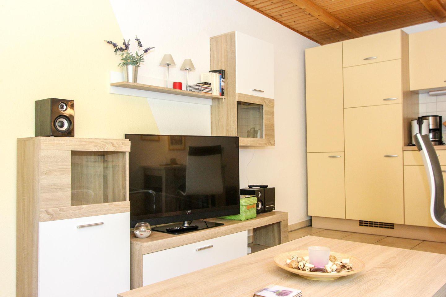 Durch den hellen Eingangsbereich betritt man alle weiteren Räume. Der gemütliche Wohn- und Essbereich mit einer Küchenzeile, bietet den Blick Richtung Süden auf den Garten und die dahinter befindlichen Wiesen. Ein Schlafzimmer mit großem Fenster Richtung Osten und ein Badezimmer, ausgestattet mit einer Dusche, Fenster und WC, runden das Feriendomizil ab.