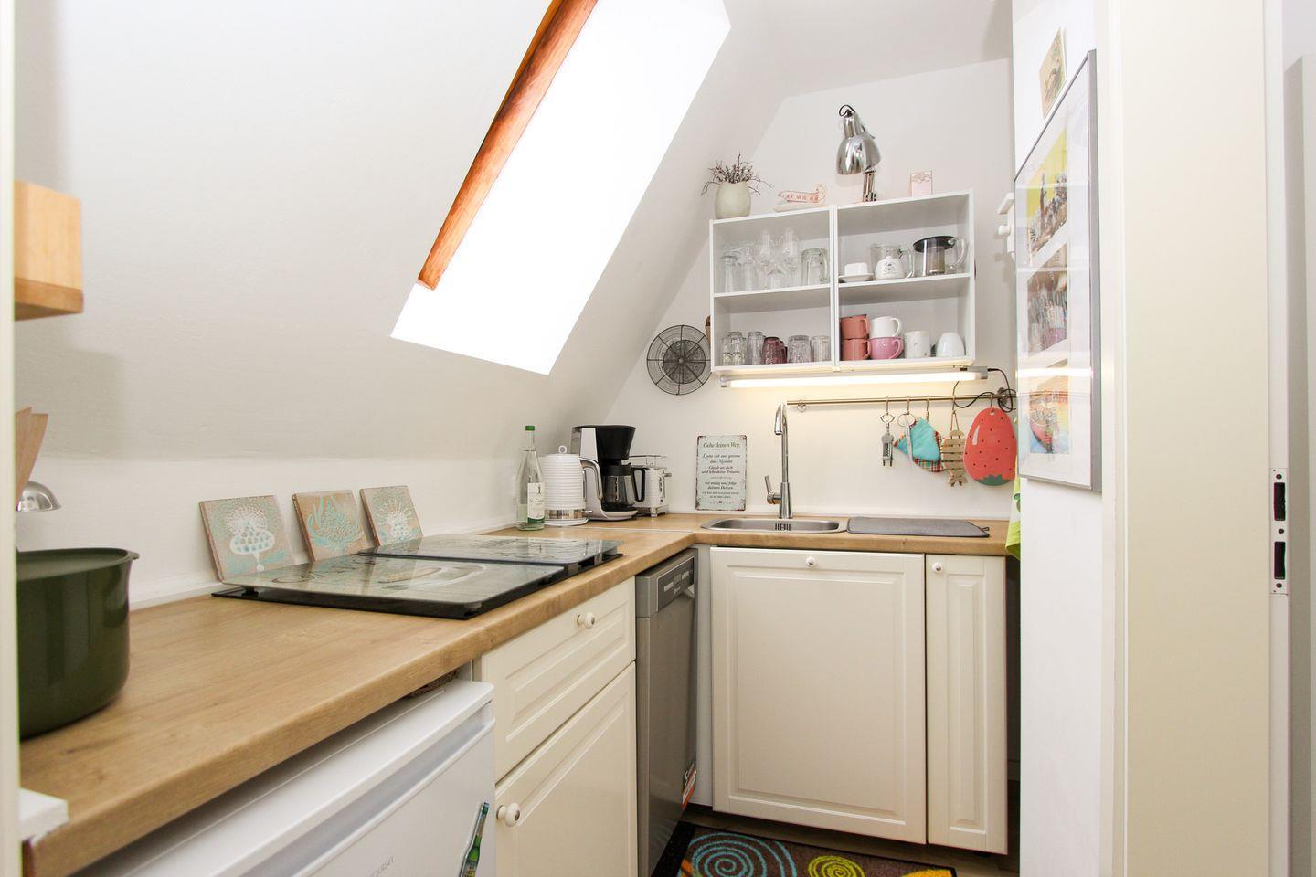 Gleich nebenan, getrennt durch eine Tür, befindet sich der Küchenbereich, der mit einer gut durchdachten Arbeitsstrecke ausgestattet ist.