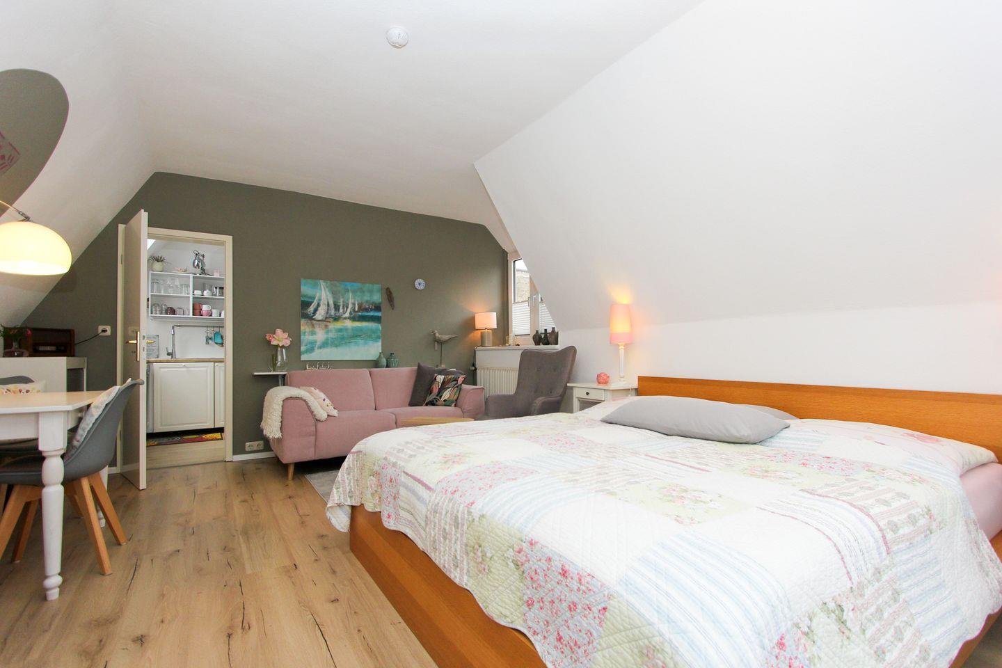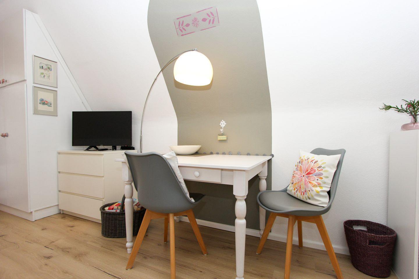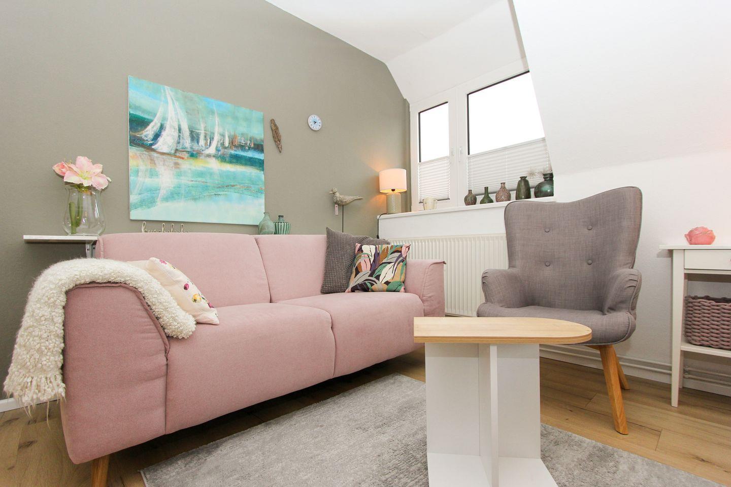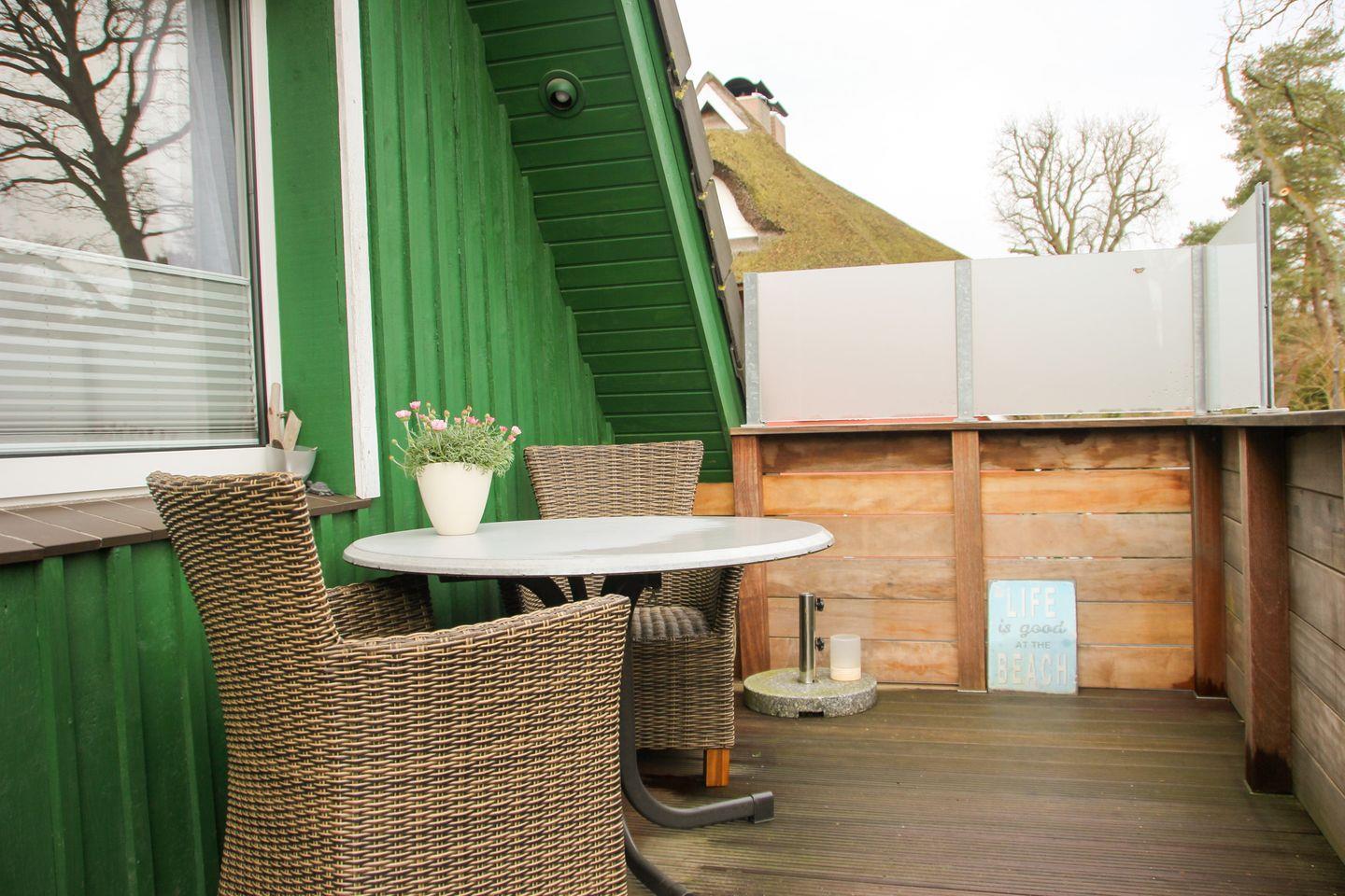 Über eine separate Treppe gelangen Sie auf den großzügigen Balkon der Wohnung und betreten dann direkt den Wohn- und Schlafbereich. Hier finden Sie sicher alles, was man für einen erholsamen Urlaub zu zweit braucht.