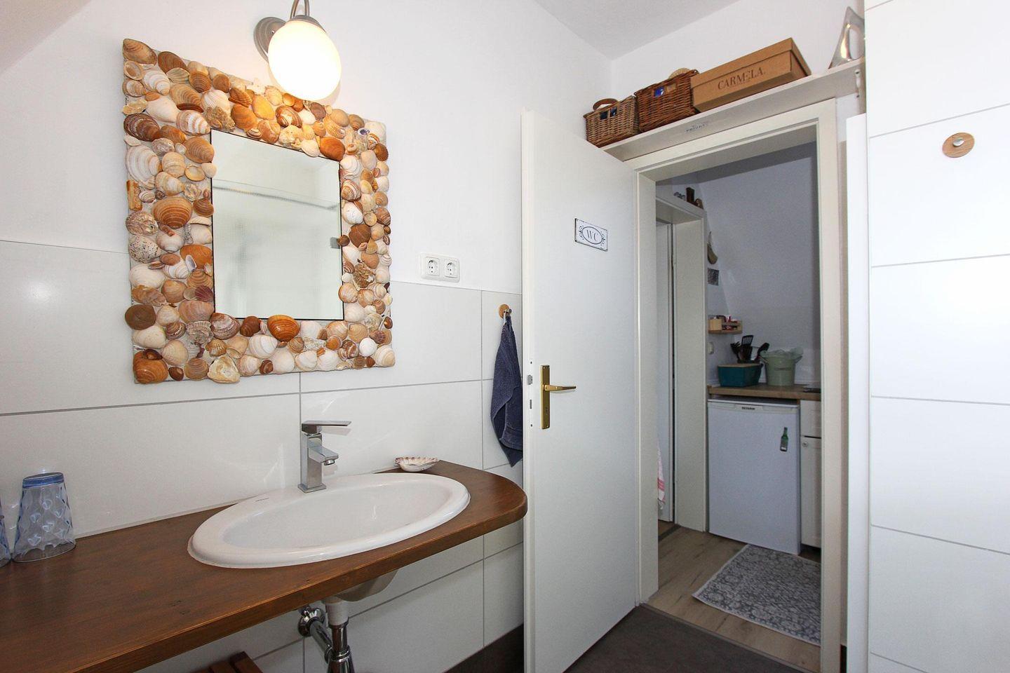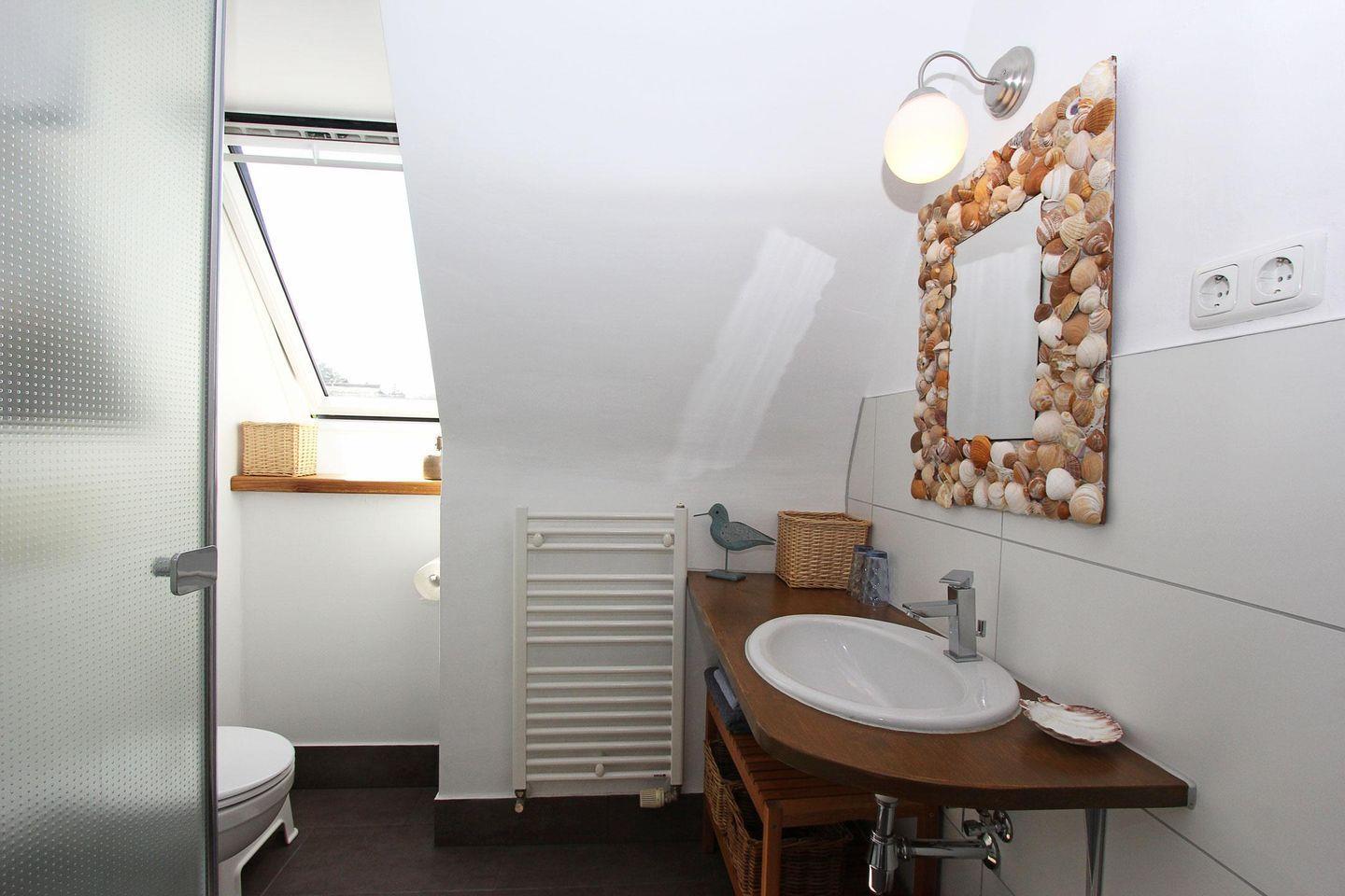Durch eine weitere Tür gelangt man in das Bad. Es ist geräumig, hat eine ebenerdige Dusche, Fußbodenheizung und verfügt über ein großes Dachfenster.