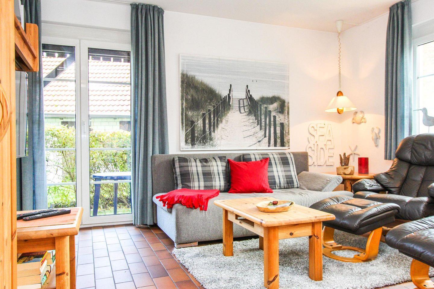 Durch die eigens genutzte, ortstypische Darßer Haustür gelangen Sie in das helle Wohnzimmer und den großen Essbereich der Wohnung mit der gut ausgestatteten, angrenzenden Küche. Über die Terrassentür betreten Sie die schöne Holzterrasse.