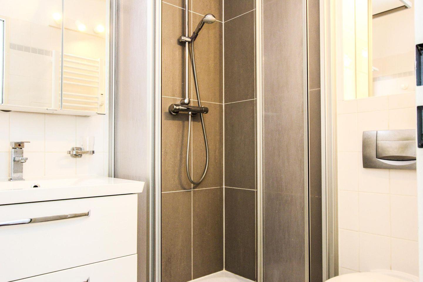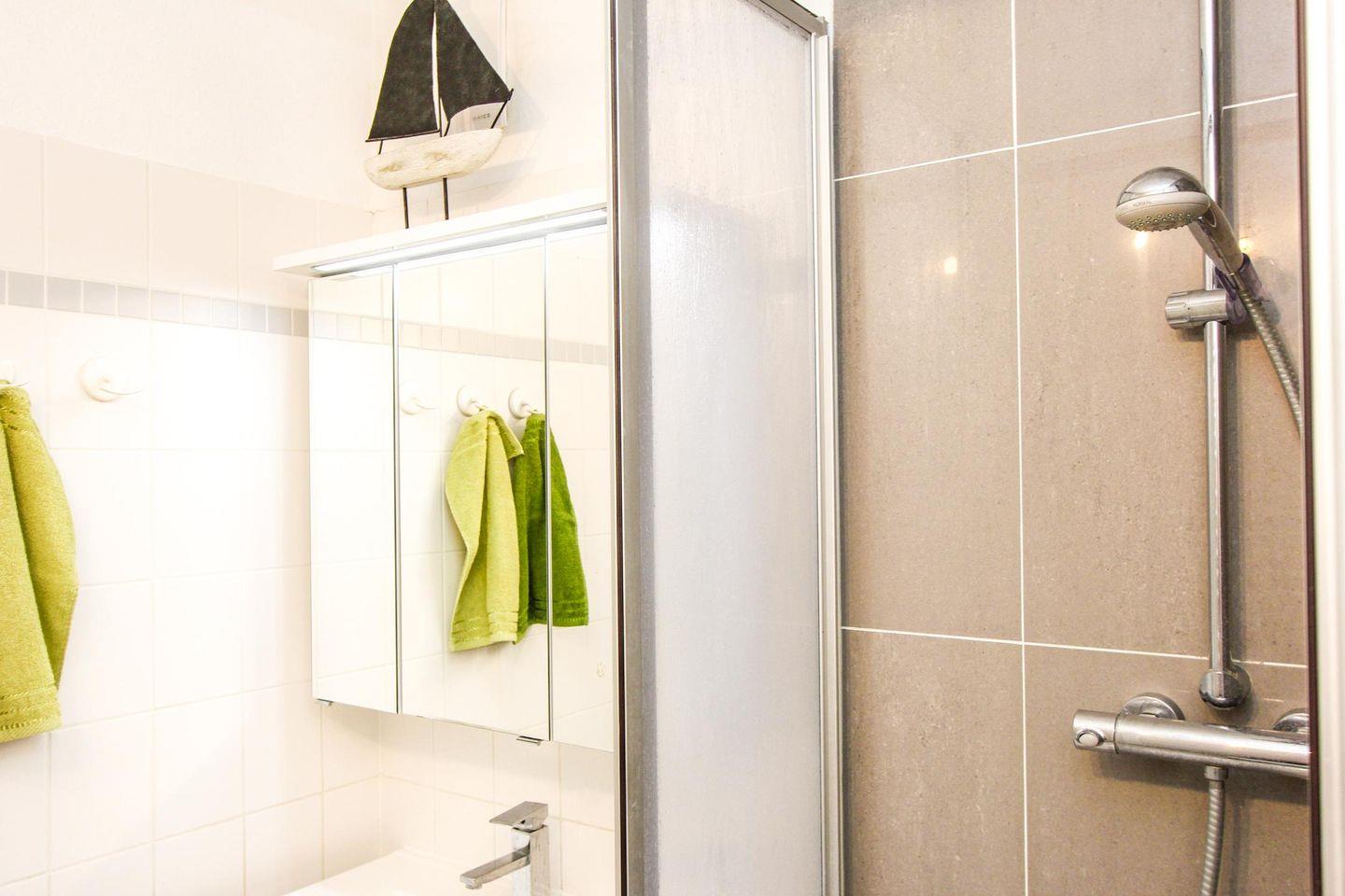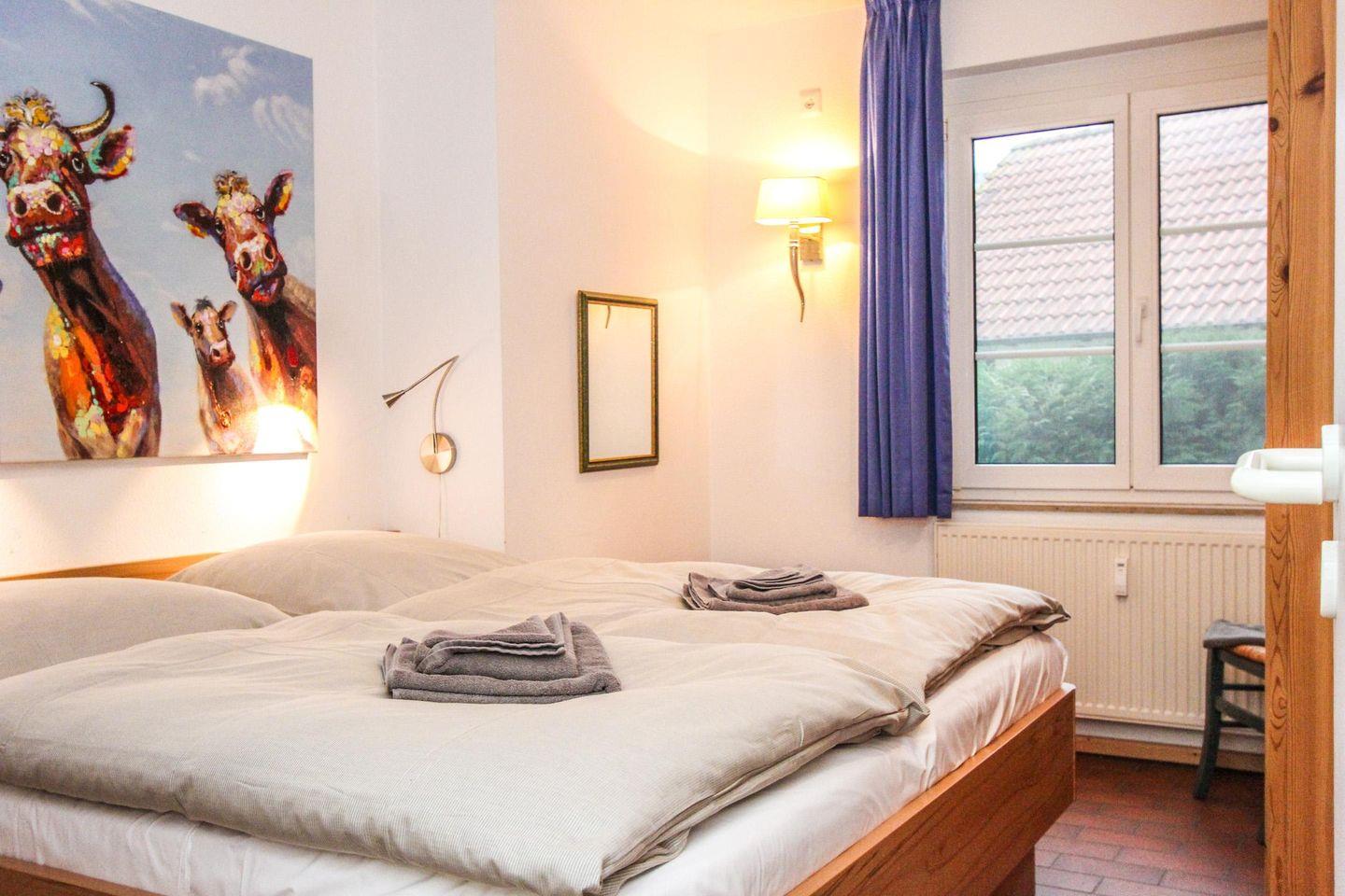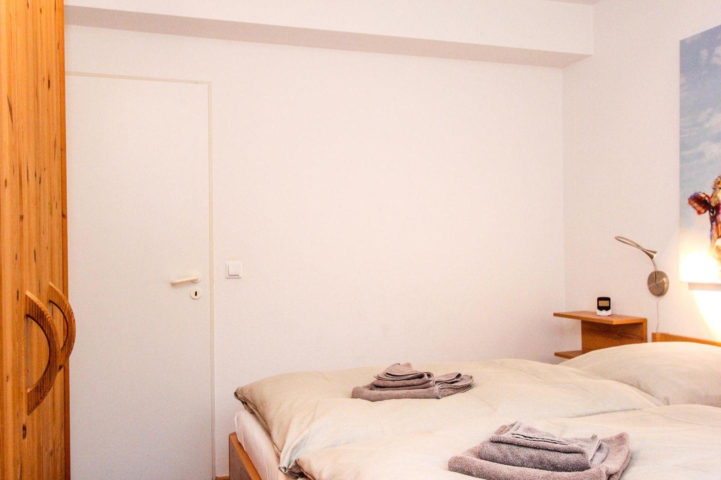 Im hinteren Teil der Wohnung befindet sich das großzügige Schlafzimmer, mit gemütlichem Doppelbett und einem großzügigen Kleiderschrank. Hinter den gegenüberliegenden Türen befinden sich das Duschbad und ein Gäste-WC.