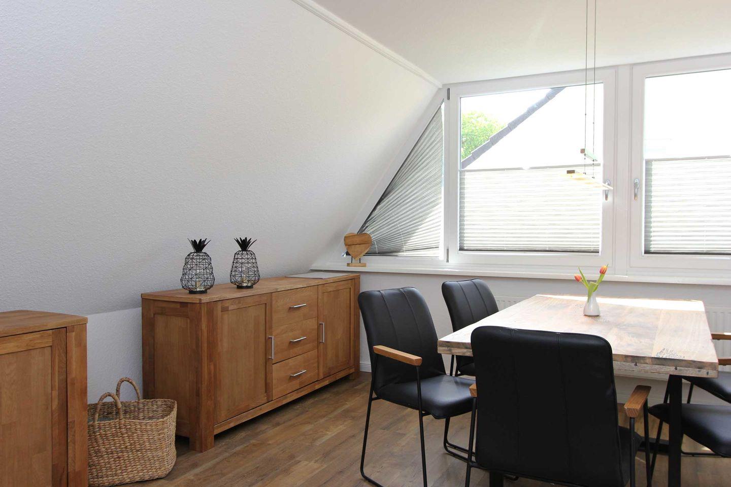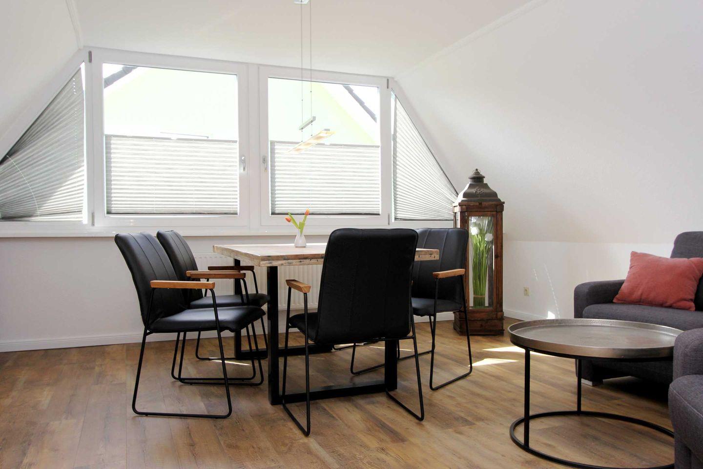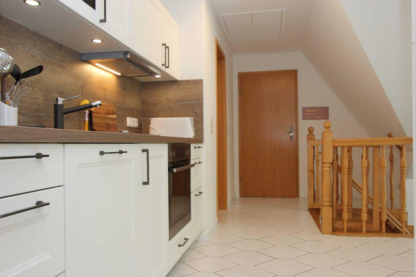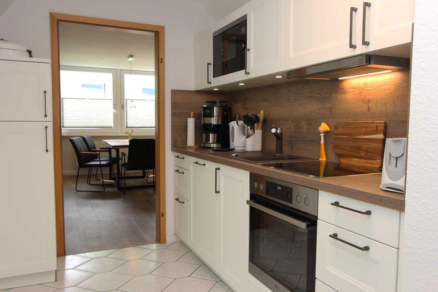 Die Wohnung ist liebenswert eingerichtet und bietet Platz für bis zu vier Personen. Neben dem offenen Wohnbereich befindet sich die moderne Küche. Hier stehen Ihnen ein Herd, eine Mikrowelle, ein Kühlschrank mit Gefrierfach, eine Spülmaschine, ein Toaster und eine Kaffeemaschine zur Verfügung – alles, um kulinarische Köstlichkeiten zuzubereiten.