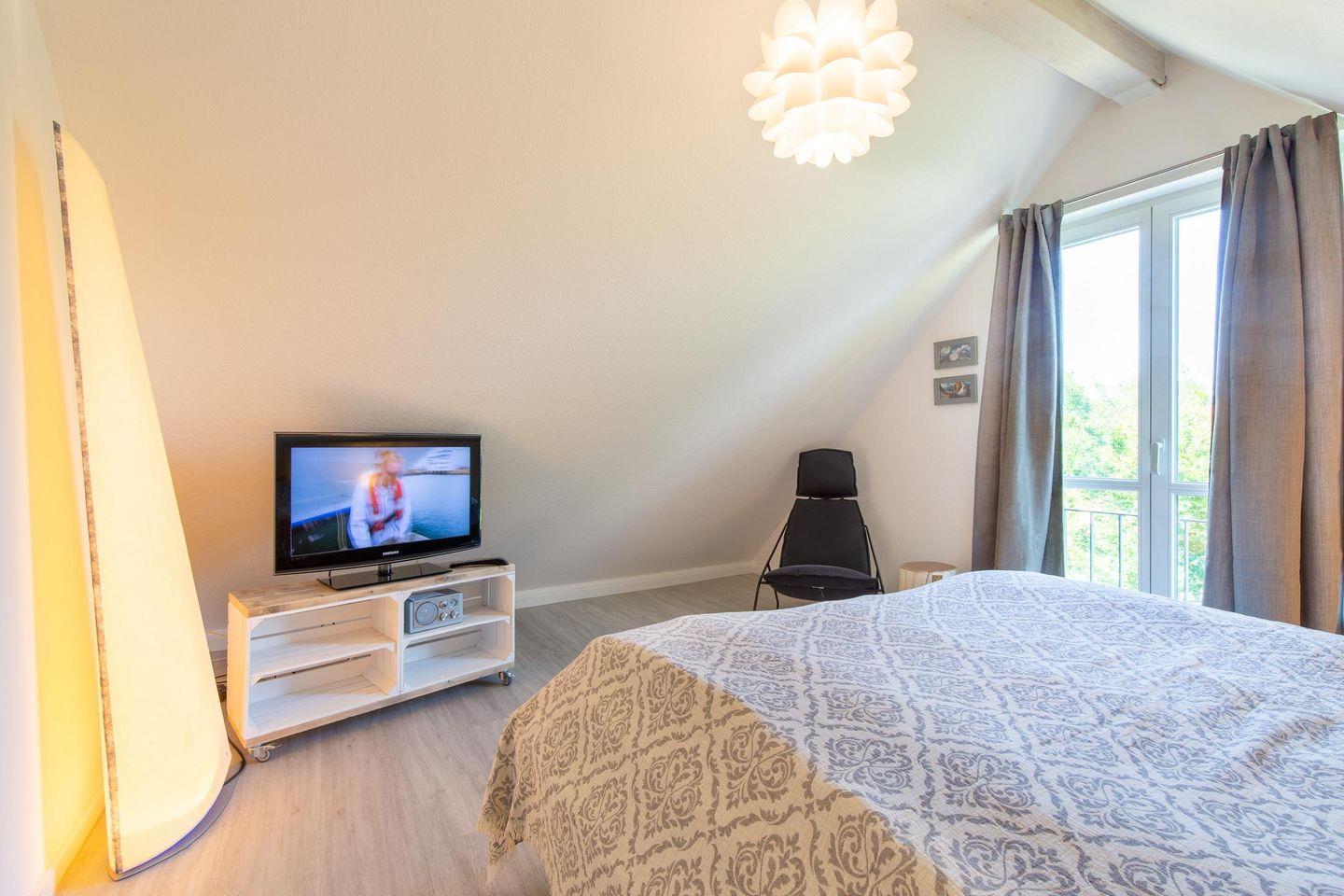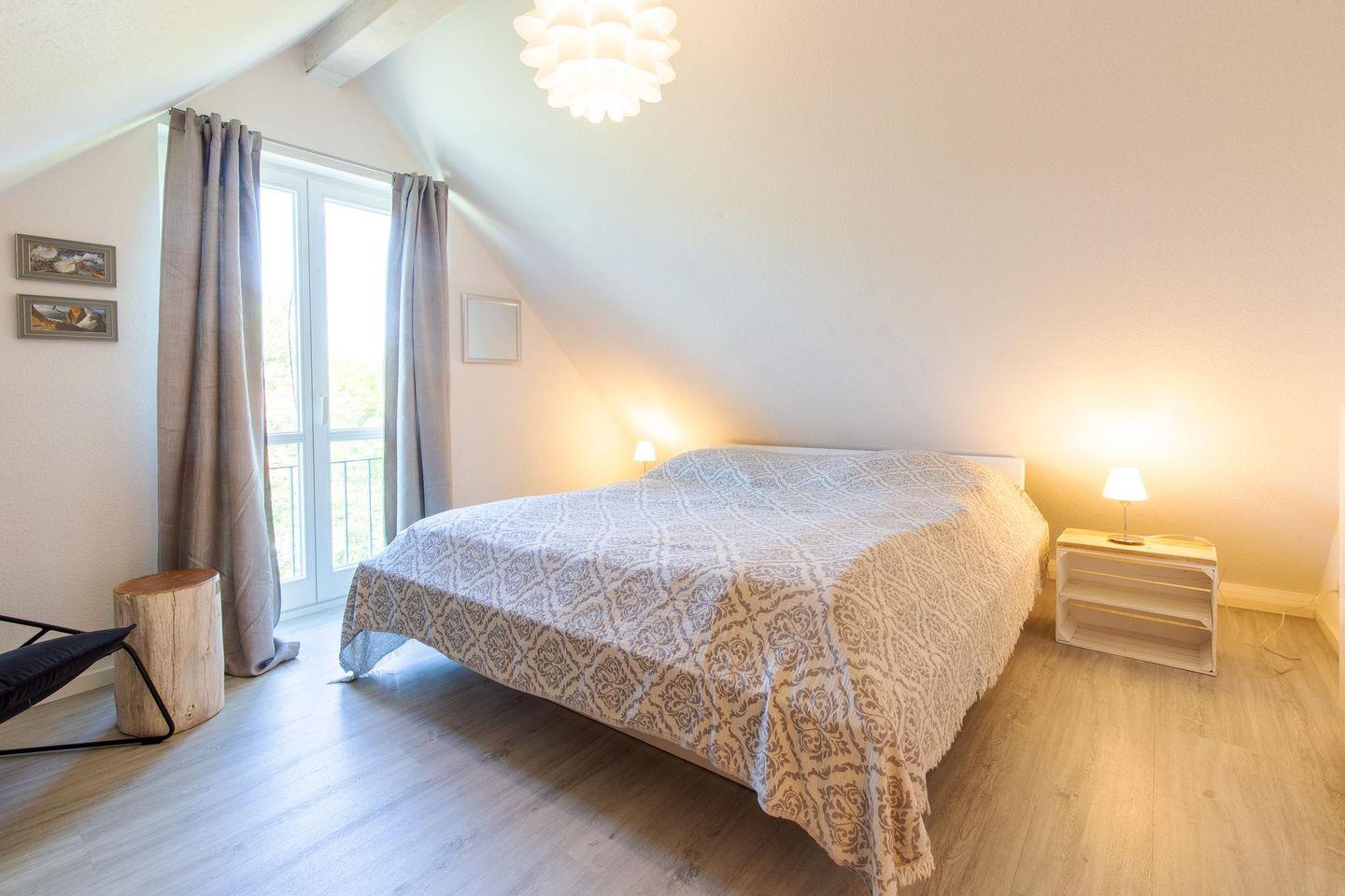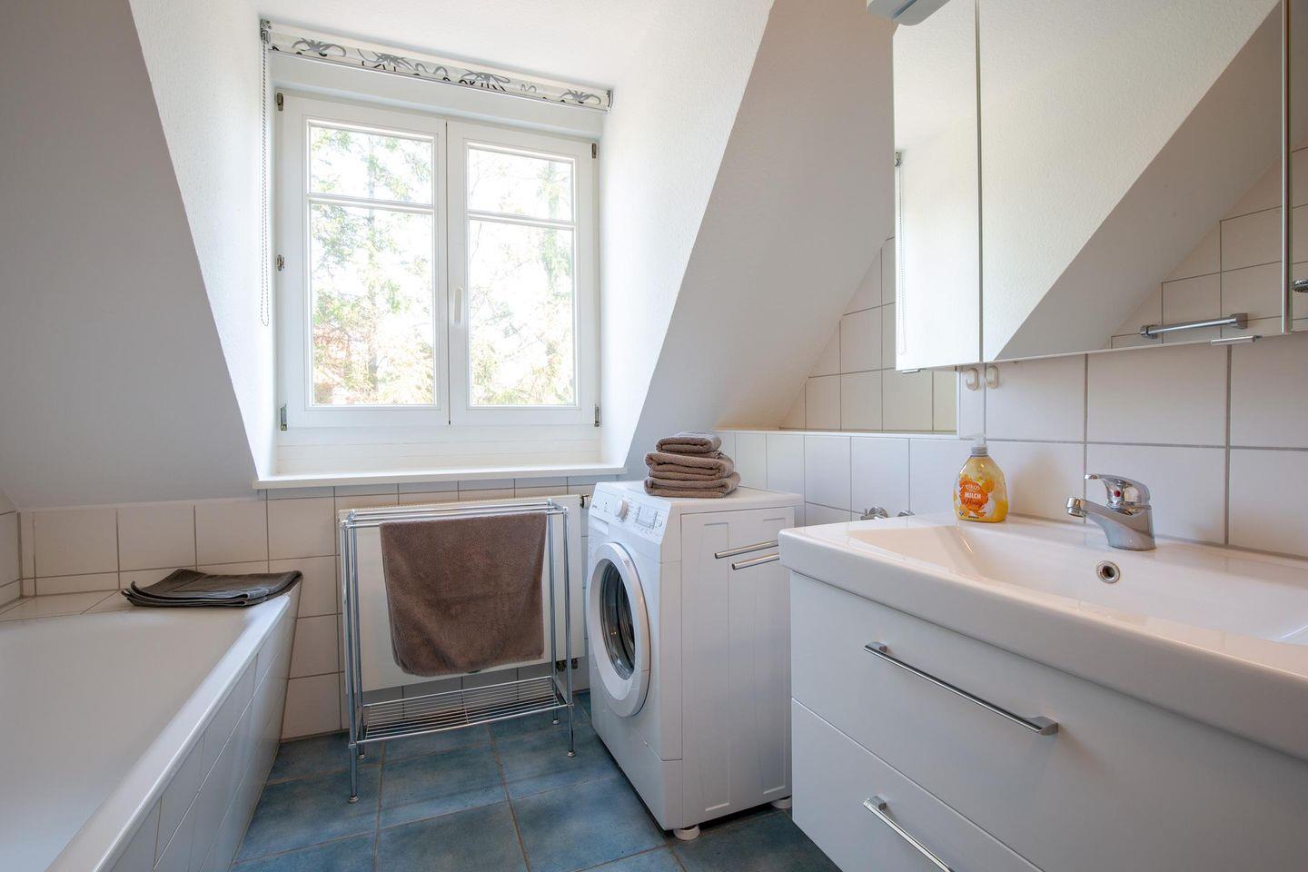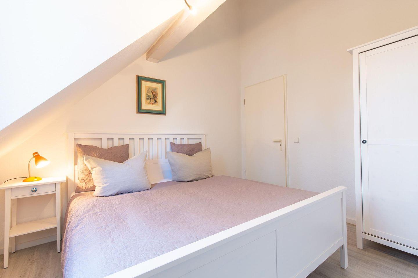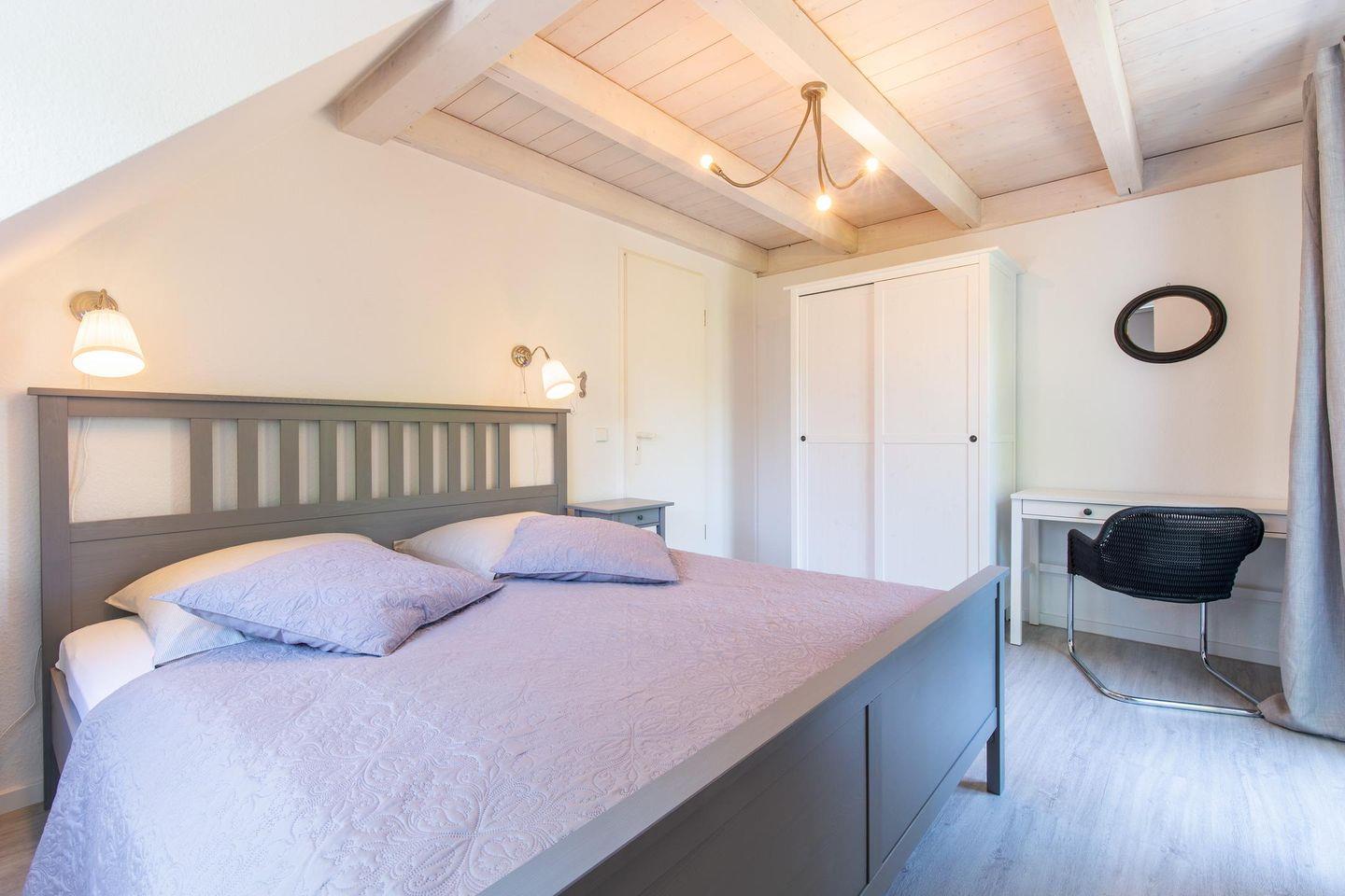 Auf dieser Etage befinden sich auch die zwei neu ausgestatteten Schlafzimmer mit je einem Doppelbett und Kleiderschrank, zum Teil nach oben offener, luftiger Decke und weißem Dachgebälk. Das Tageslicht-Badezimmer mit Dusche und Badewanne verfügt auch über eine Waschmaschine.