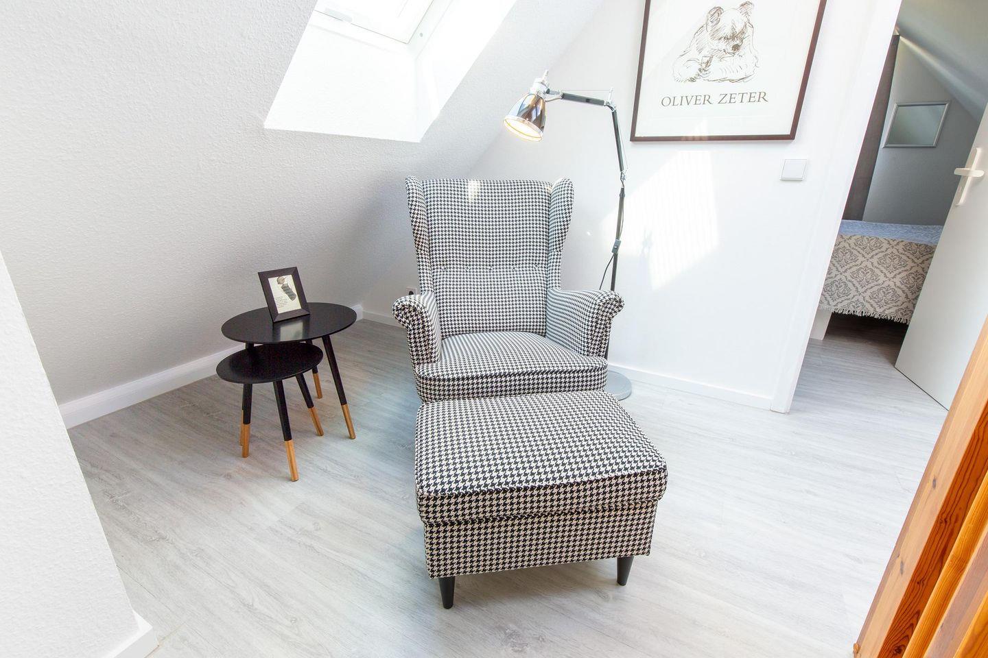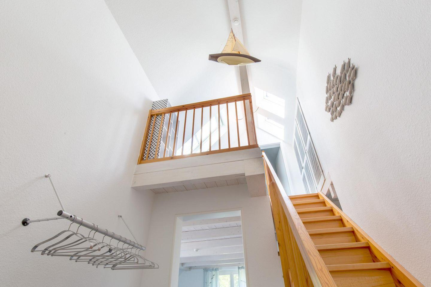 Die zweite Ebene betreten Sie über eine bequeme Treppe im Eingangsbereich. Dort befindet sich die helle Galerie, die zum Lesen und Verweilen einlädt. Das angrenzende Atelier bietet einen großartigen Ausblick mit vollwertigem Doppelbett, einem Fernseher und Musikanlage und ist als drittes Schlafzimmer nutzbar.