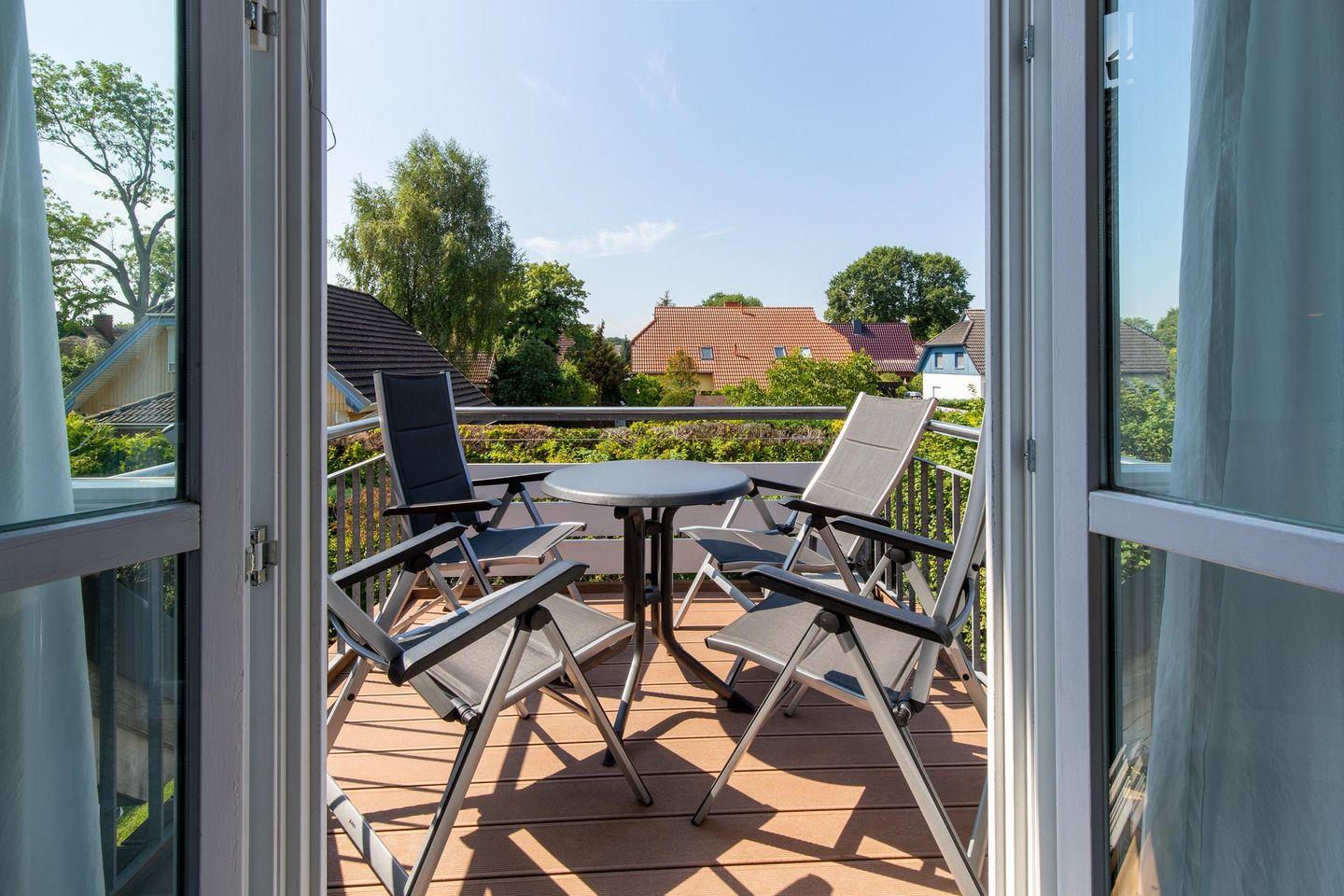 Auf dem angrenzenden Balkon in Westausrichtung können Sie ein ausgedehntes Frühstück an der frischen Ostseeluft genießen oder den Abend bei einem Glas Wein ausklingen lassen.