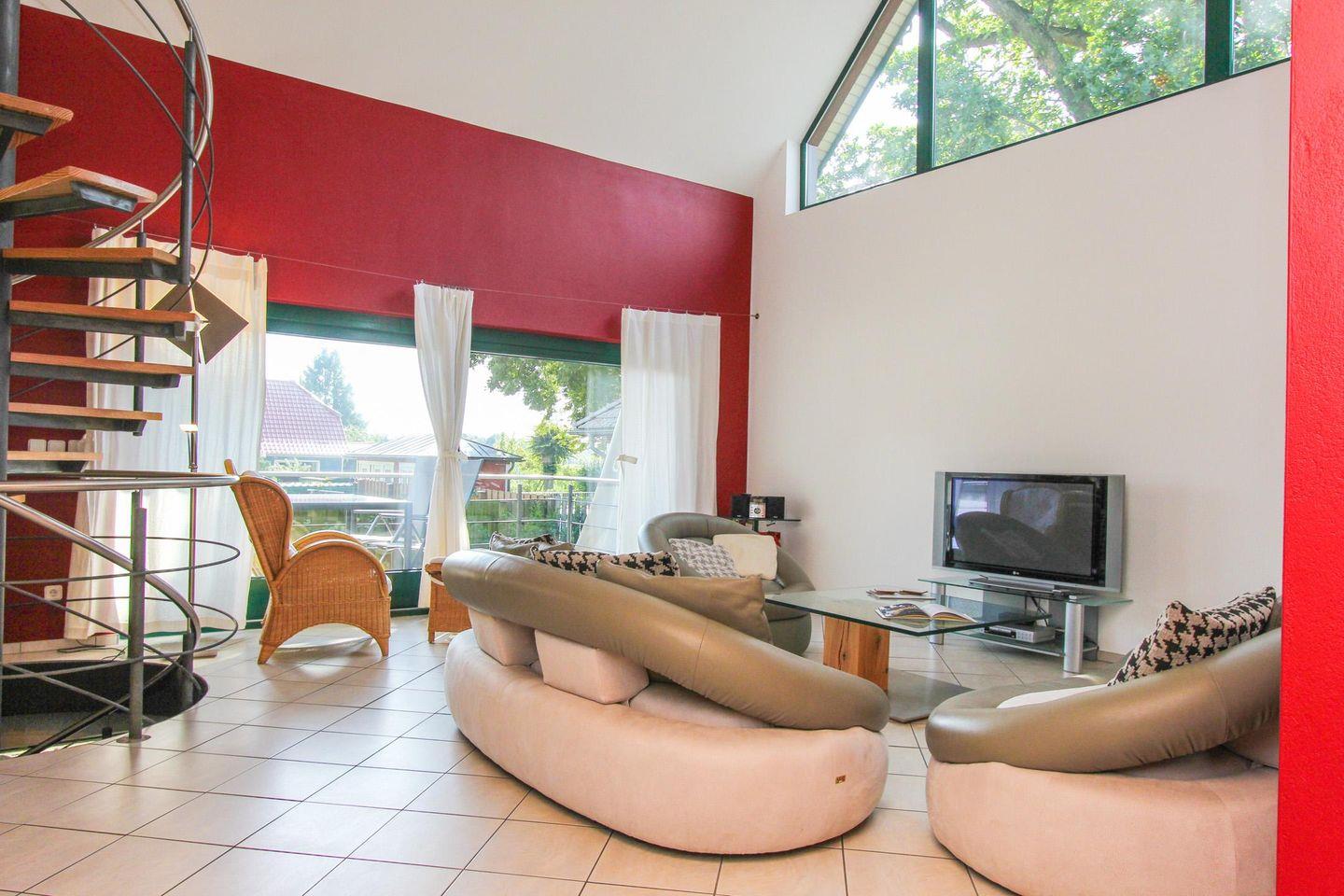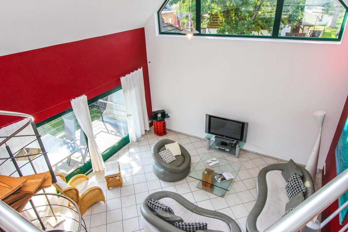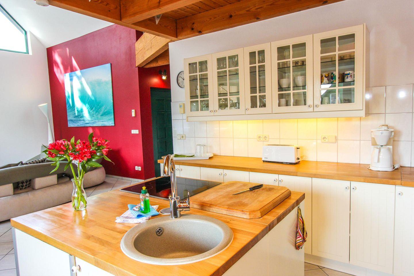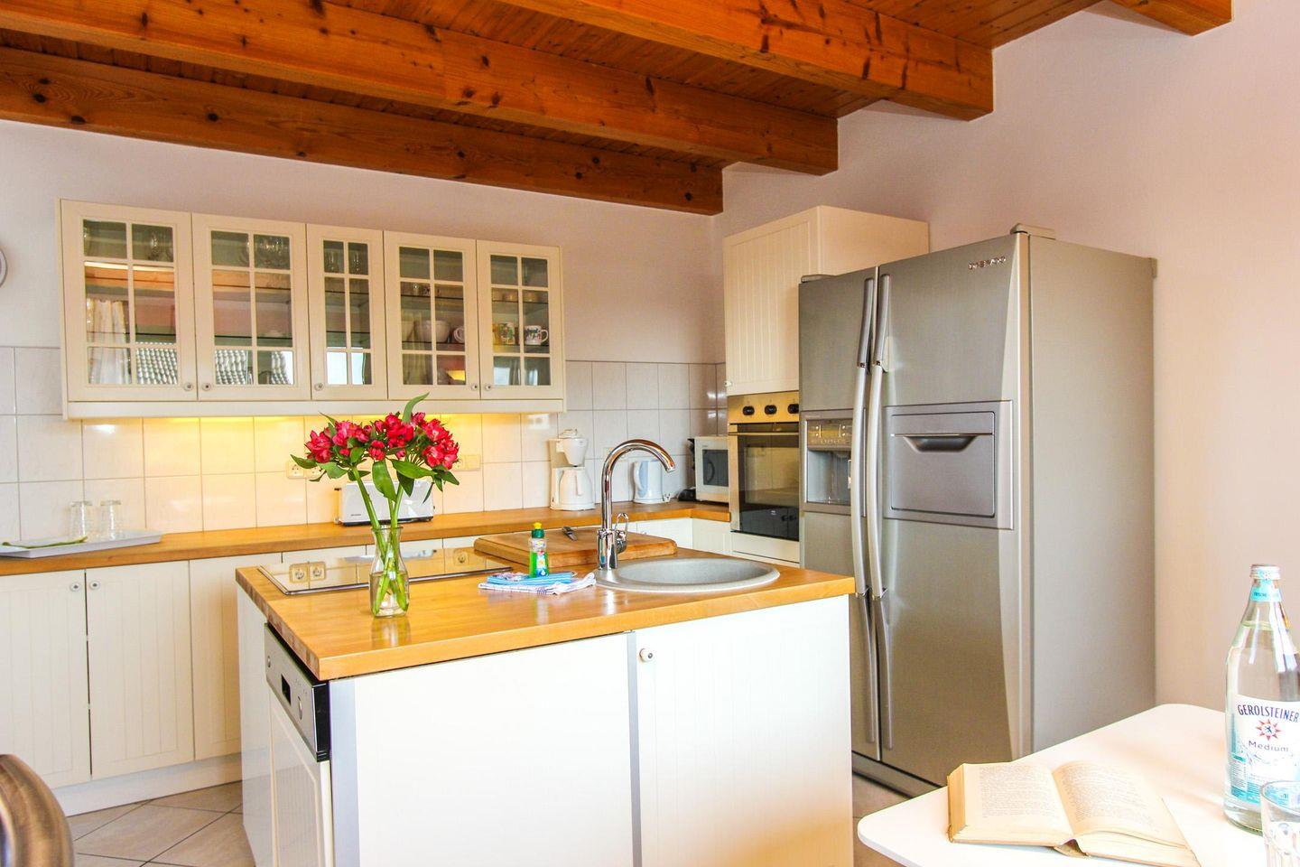 Die offene Wohnküche, die sich harmonisch zum Wohnzimmer hin öffnet, ist komplett ausgestattet und lässt keine Wünsche offen. Eine Spülmaschine, ein Ceran-Herd, ein Kühlschrank und eine Mikrowelle gehören zur Ausstattung. Der lichtdurchflutete Wohnbereich verfügt über zwei Sofa und einem TV.