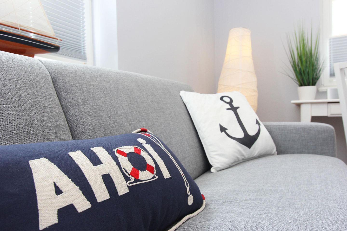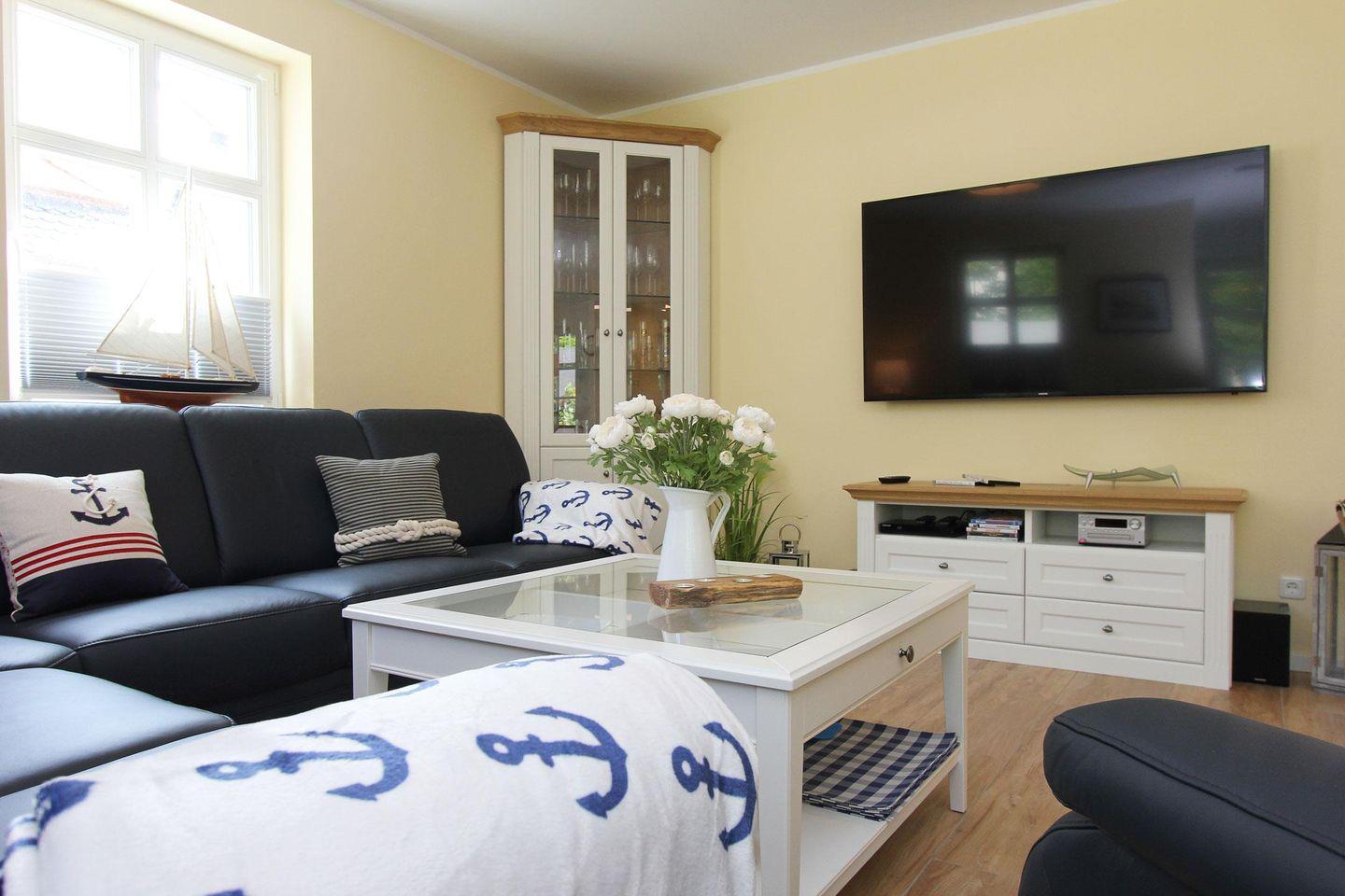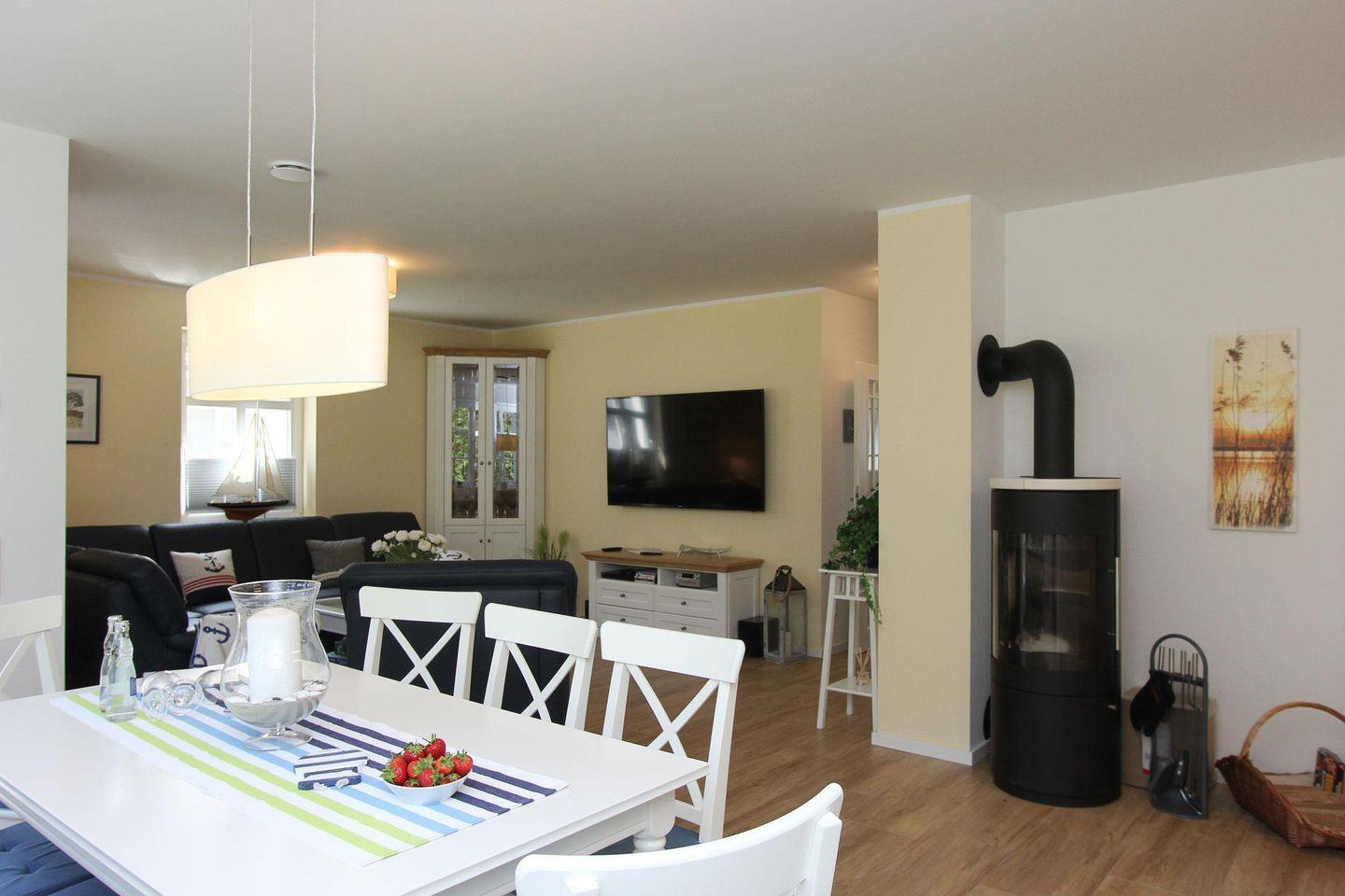 Im Erdgeschoss des im nordisch maritimen Stil eingerichteten Hauses beeindruckt das große Wohnzimmer mit Ledercouch und 65-Zoll HD-TV, das in den Essbereich mit Kaminofen übergeht und in die offene Küche mündet. Die Sonnenterrassen sind mit Gartenmöbeln, Sonnenschirm und Strandkorb ausgestattet. Schon morgens werden Sie hier von der Sonne verwöhnt und abends bietet sich hier die Gelegenheit für gemütliche Grillabende. Im Obergeschoss erwarten Sie drei Schlafzimmer mit Doppelbett, von welchem eins mit einem Fernseher ausgestattet ist.