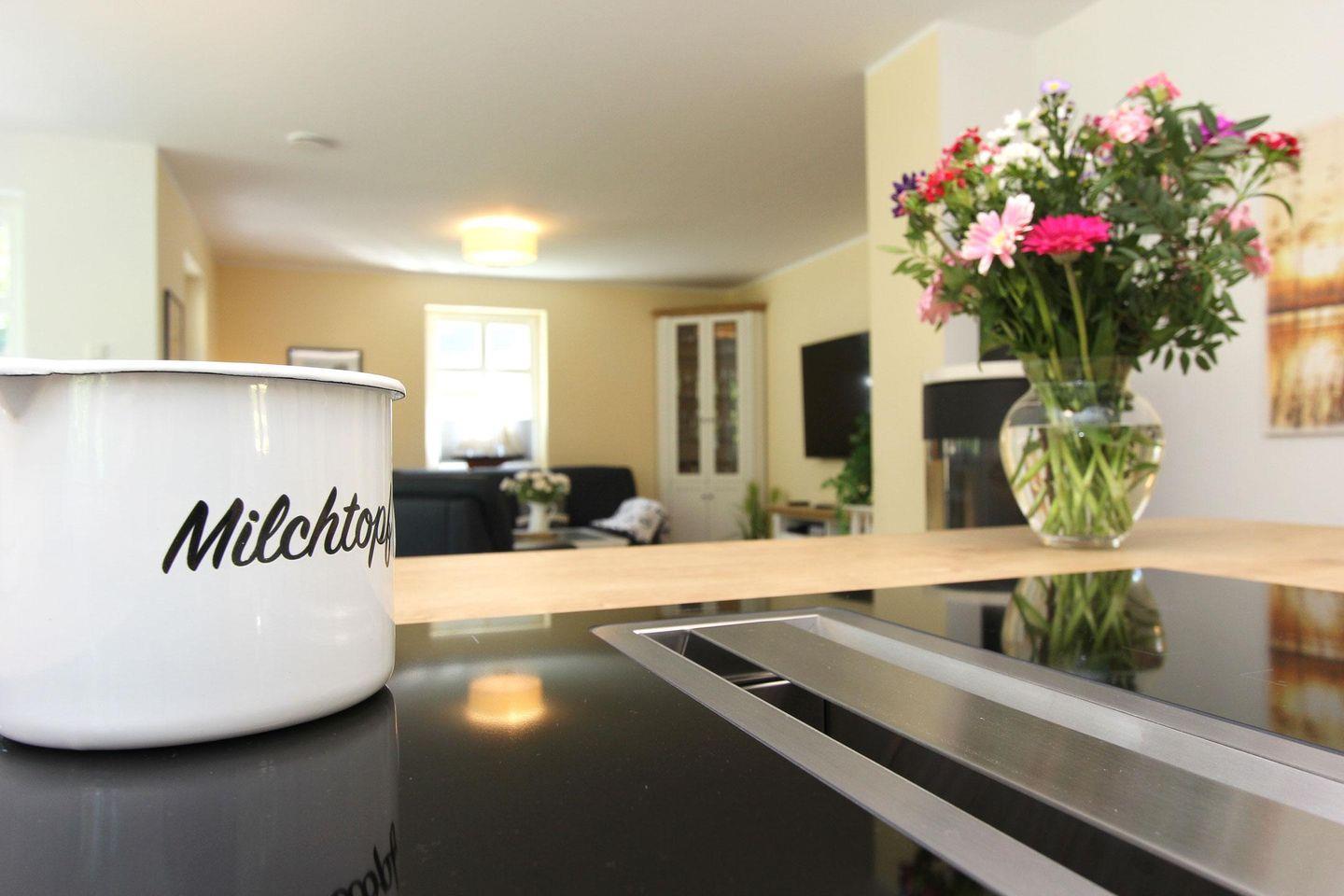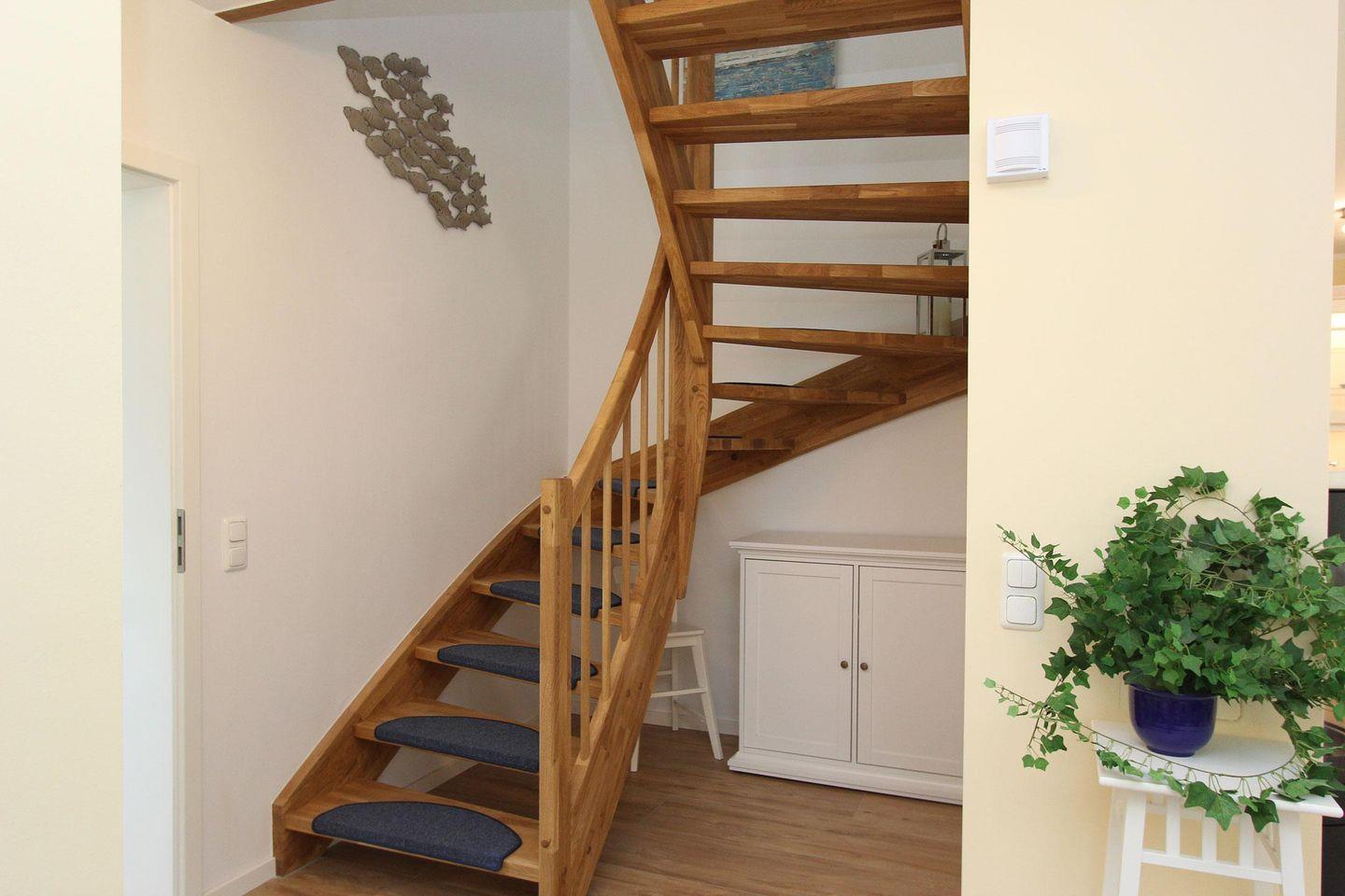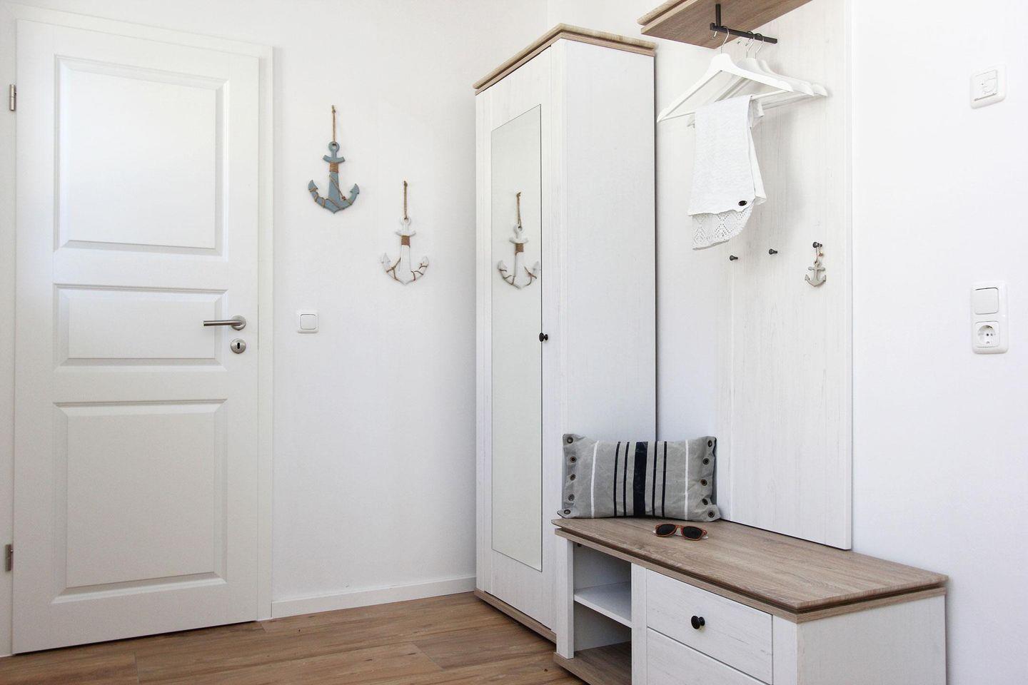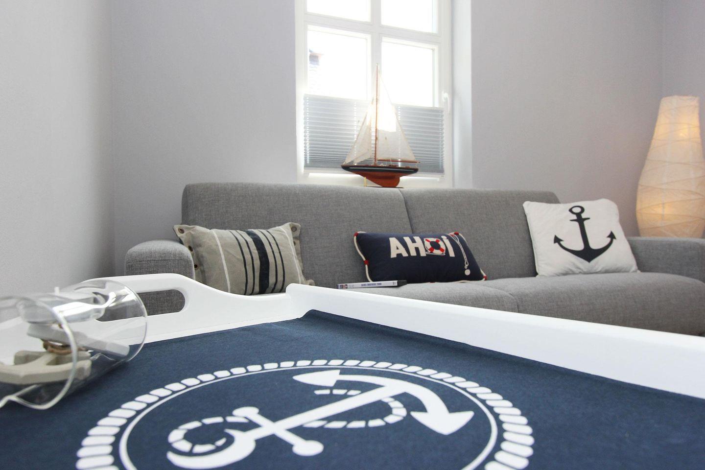 Im Erdgeschoss des im nordisch maritimen Stil eingerichteten Hauses beeindruckt das große Wohnzimmer mit Ledercouch und 65-Zoll HD-TV, das in den Essbereich mit Kaminofen übergeht und in die offene Küche mündet. Die Sonnenterrassen sind mit Gartenmöbeln, Sonnenschirm und Strandkorb ausgestattet. Schon morgens werden Sie hier von der Sonne verwöhnt und abends bietet sich hier die Gelegenheit für gemütliche Grillabende. Im Obergeschoss erwarten Sie drei Schlafzimmer mit Doppelbett, von welchem eins mit einem Fernseher ausgestattet ist.