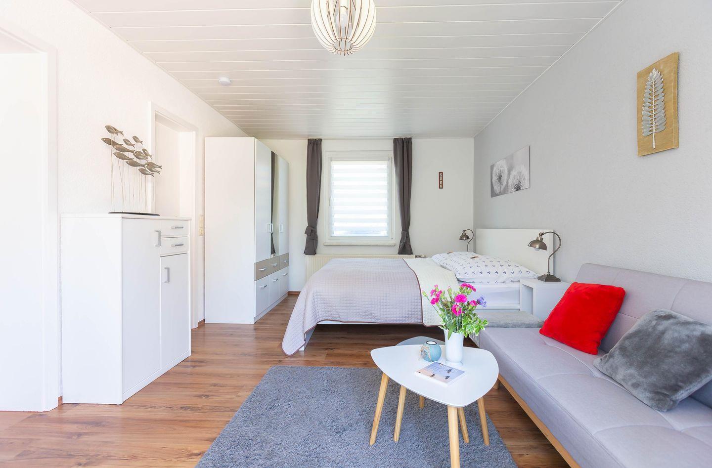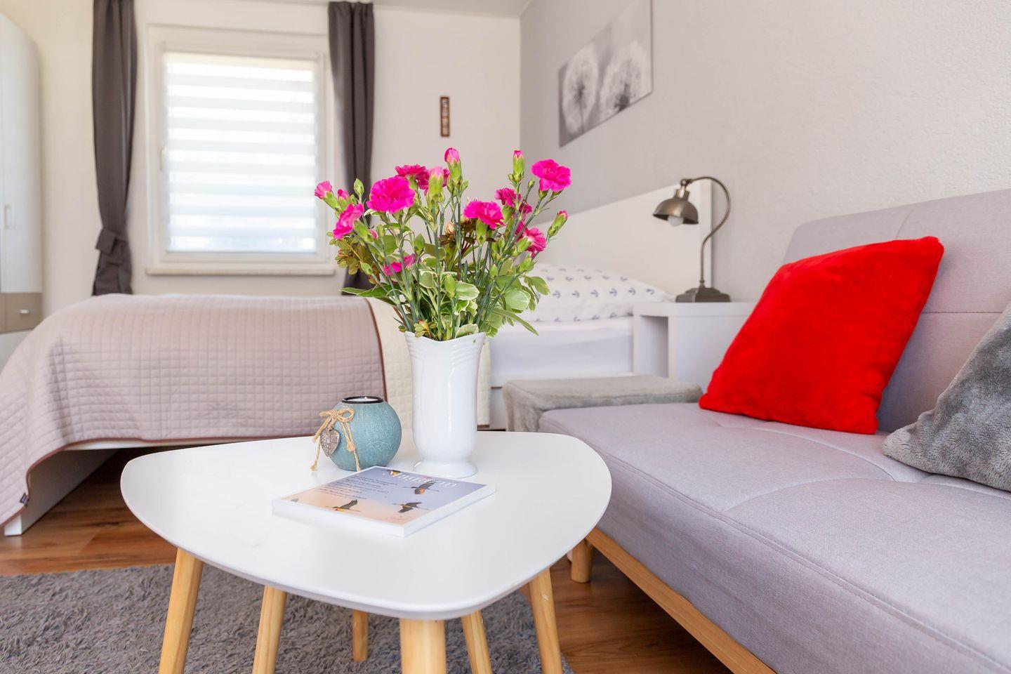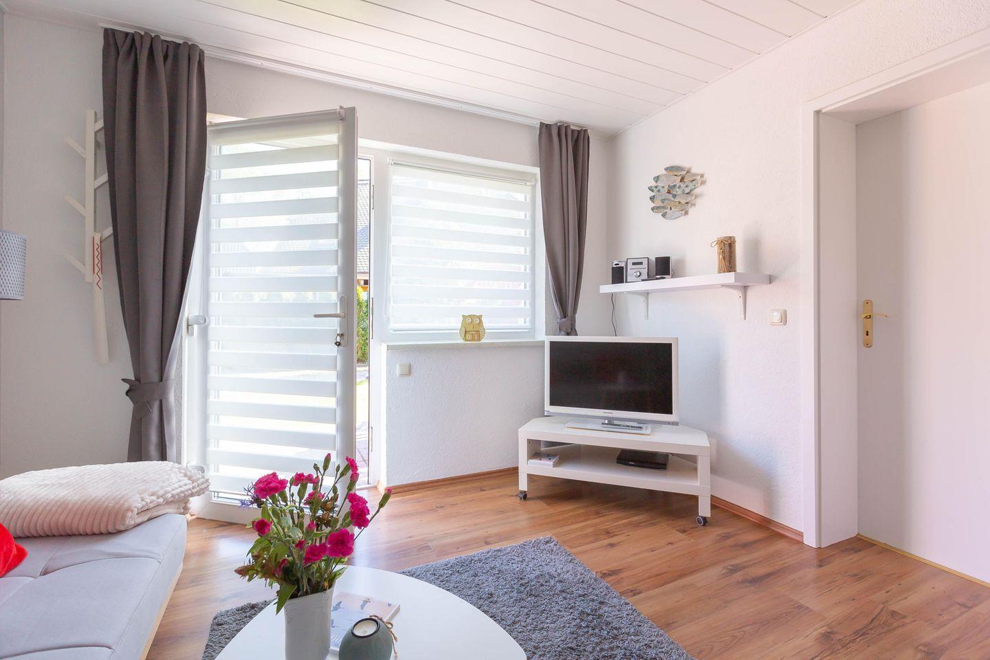 Die Erdgeschosswohnung Sonnenblumenhaus 01 empfängt dich mit einer warmen, modernen Wohlfühlatmosphäre. Der offen gestaltete Wohn und Schlafbereich vereint Gemütlichkeit und Komfort: Ein großes Doppelbett lädt zum Ausschlafen ein, die bequeme Couch ist perfekt für entspannte Abende vor dem Smart TV. Das separate Badezimmer mit Dusche und WC sowie die eigene, voll ausgestattete Küche mit Esstisch am Fenster machen deinen Urlaub rundum angenehm und unabhängig.