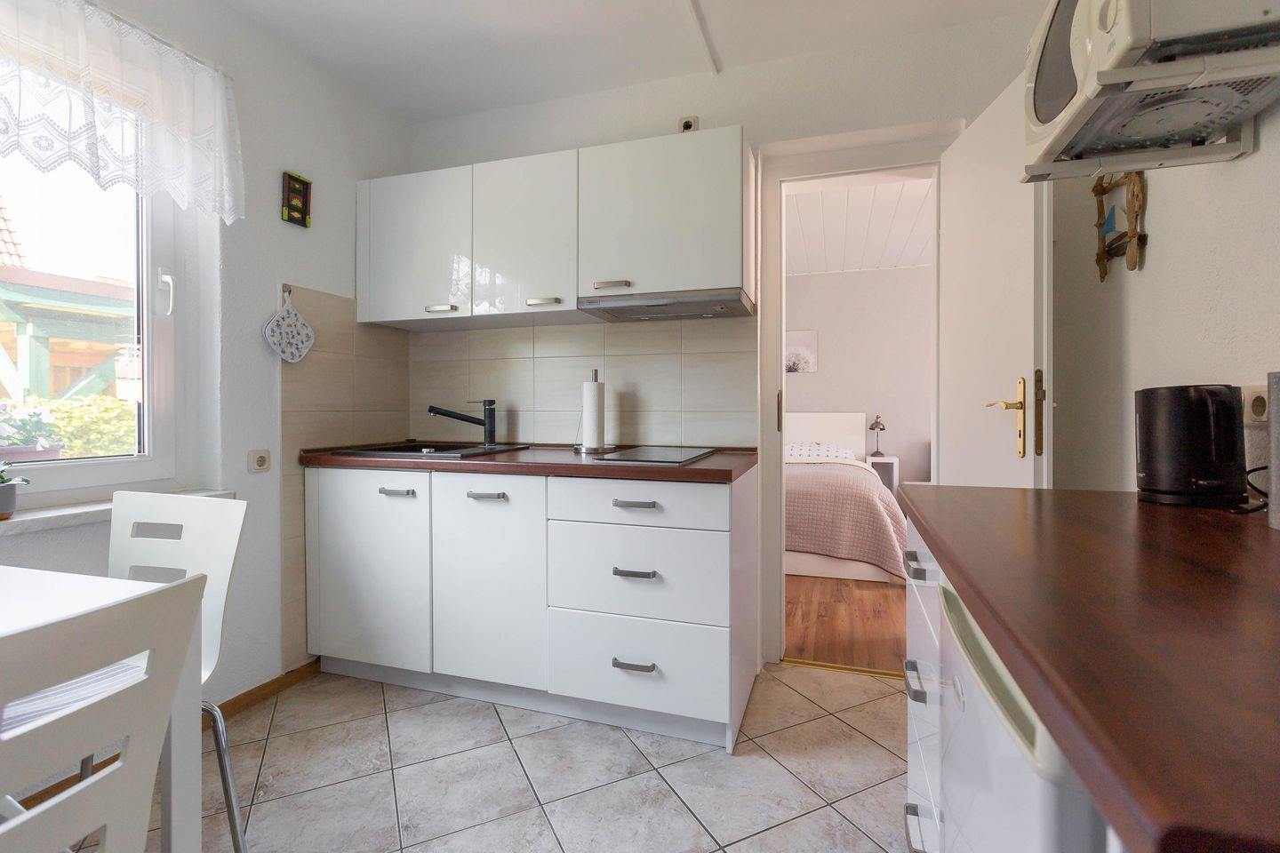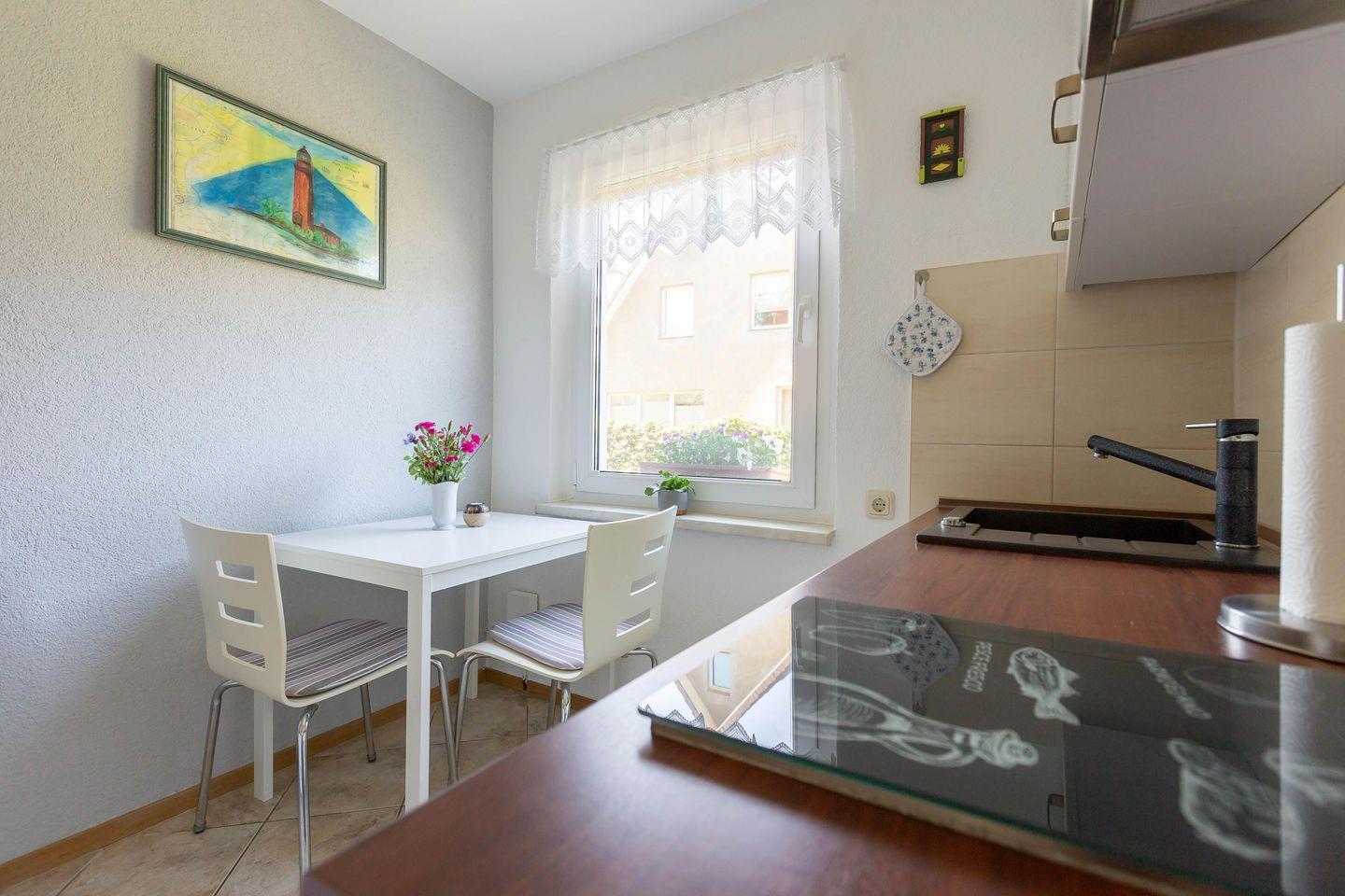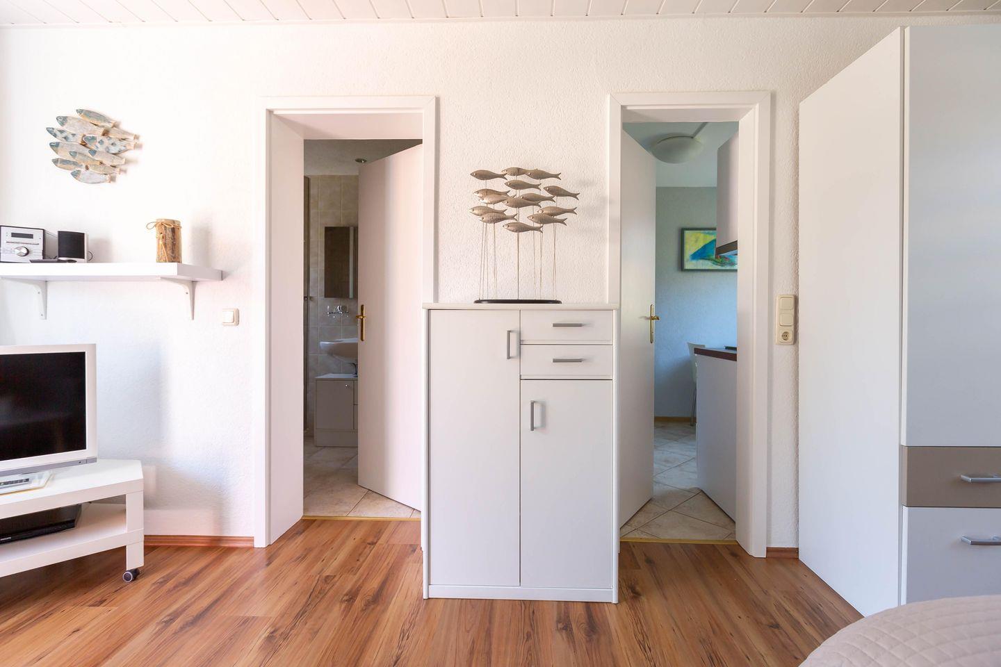 Die Erdgeschosswohnung Sonnenblumenhaus 01 empfängt dich mit einer warmen, modernen Wohlfühlatmosphäre. Der offen gestaltete Wohn und Schlafbereich vereint Gemütlichkeit und Komfort: Ein großes Doppelbett lädt zum Ausschlafen ein, die bequeme Couch ist perfekt für entspannte Abende vor dem Smart TV. Das separate Badezimmer mit Dusche und WC sowie die eigene, voll ausgestattete Küche mit Esstisch am Fenster machen deinen Urlaub rundum angenehm und unabhängig.