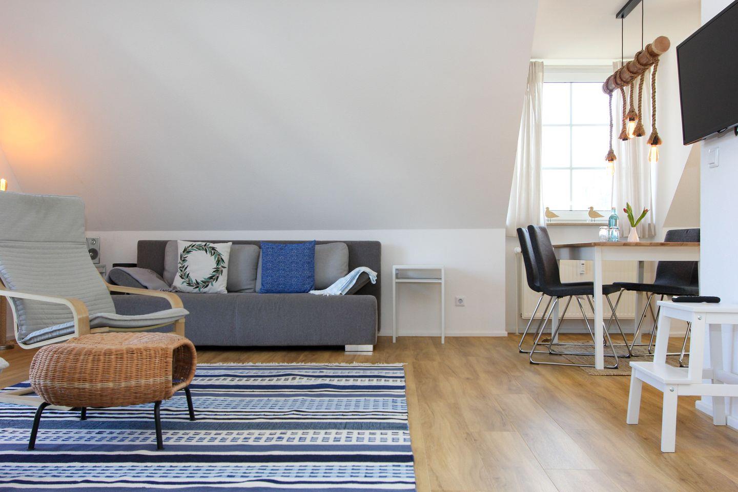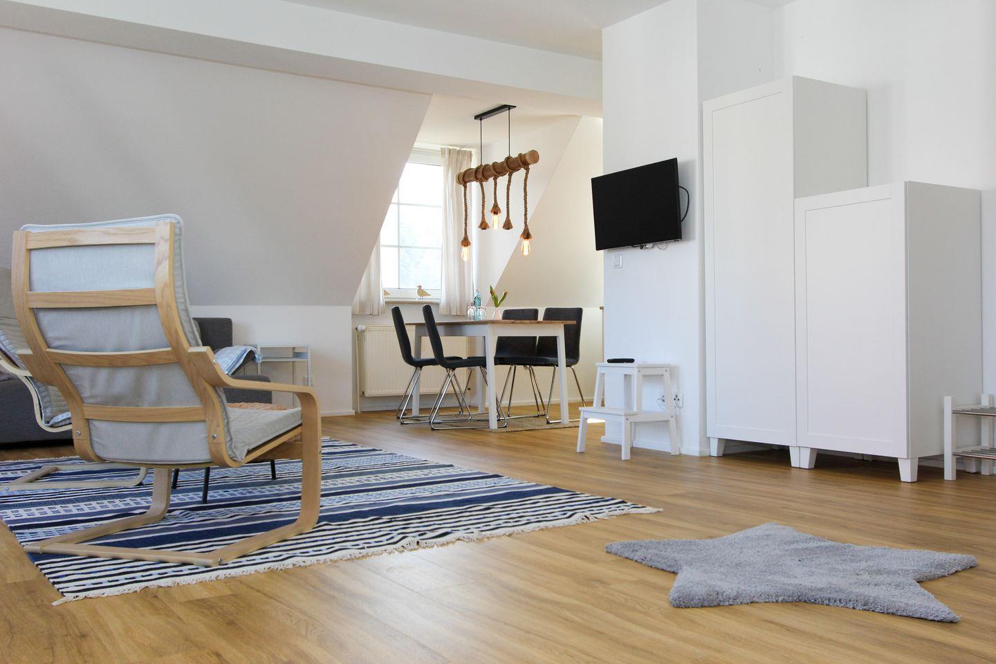 Die Wohnung hat ein sehr geräumiges und helles Wohnzimmer mit Couch und gemütlichen Sesseln und direkt daneben eine offene, gut ausgestattete Küche mit großem Esstisch im 1. Stock. Vom Wohnzimmer aus gelangt man auf den Balkon, welcher nach Norden ausgerichtet ist, so dass man hier auch an heißen Sommertagen entspannt essen oder lesen kann. Im hellen Dachgeschoss der Wohnung befindet sich ein Schlafzimmer mit einem Doppelbett sowie ein Schlafzimmer mit zwei Einzelbetten. Auf beiden Etagen gibt es weiß gefließte Bäder mit WC und Dusche sowie einen Schreibtisch (einer davon höhenverstellbar, damit die Wohnung auch als "Home Office" benutzt werden kann). Ein neuer Waschtrockner ist vorhanden, schnelles Internet per W-LAN ebenfalls.